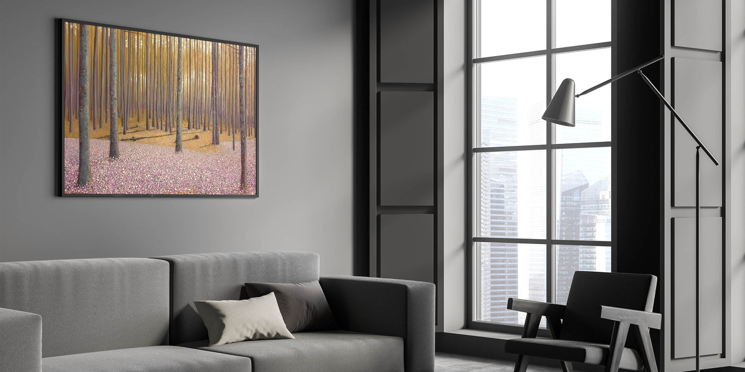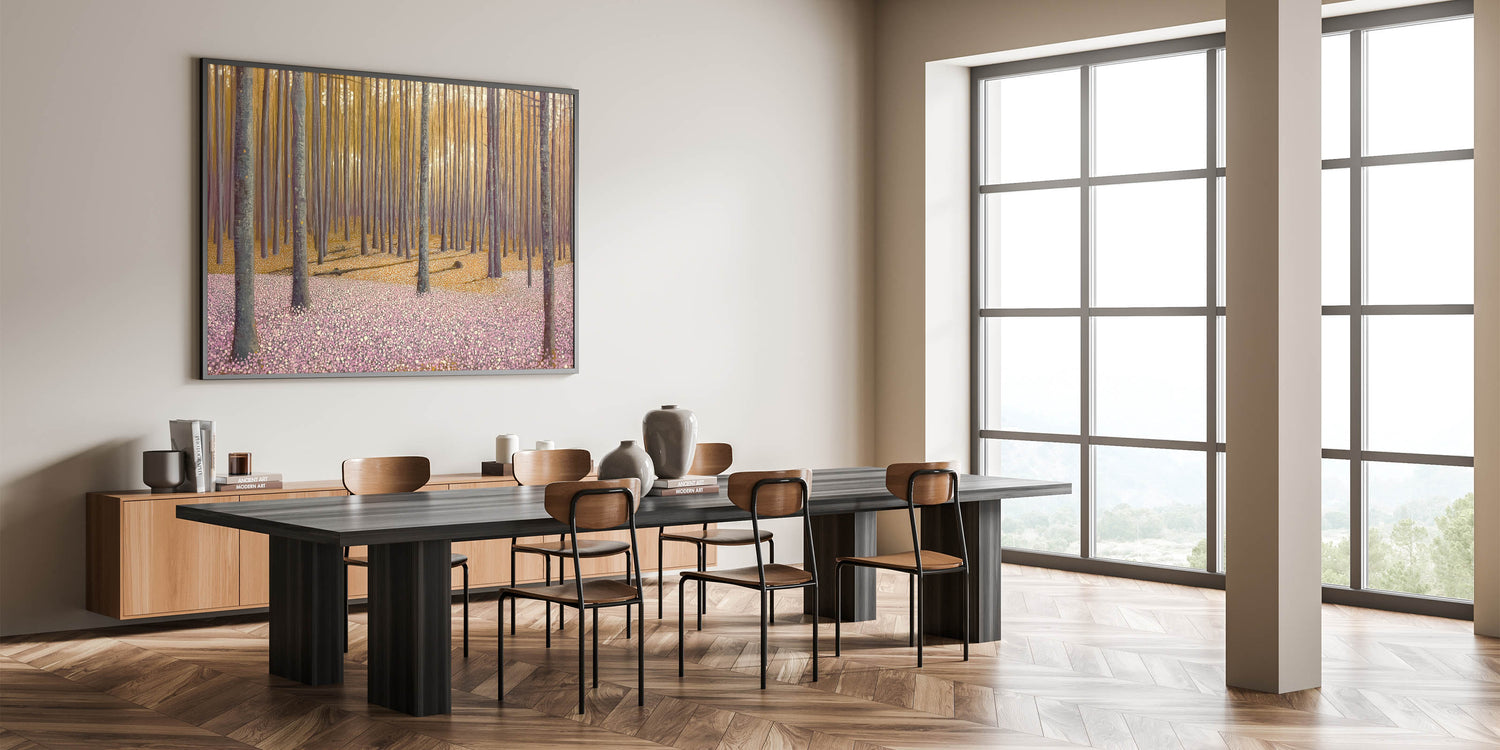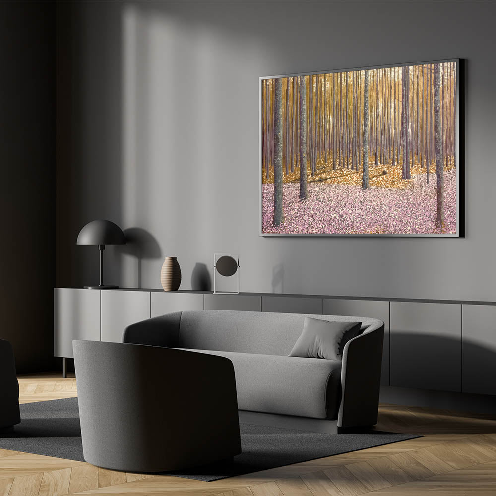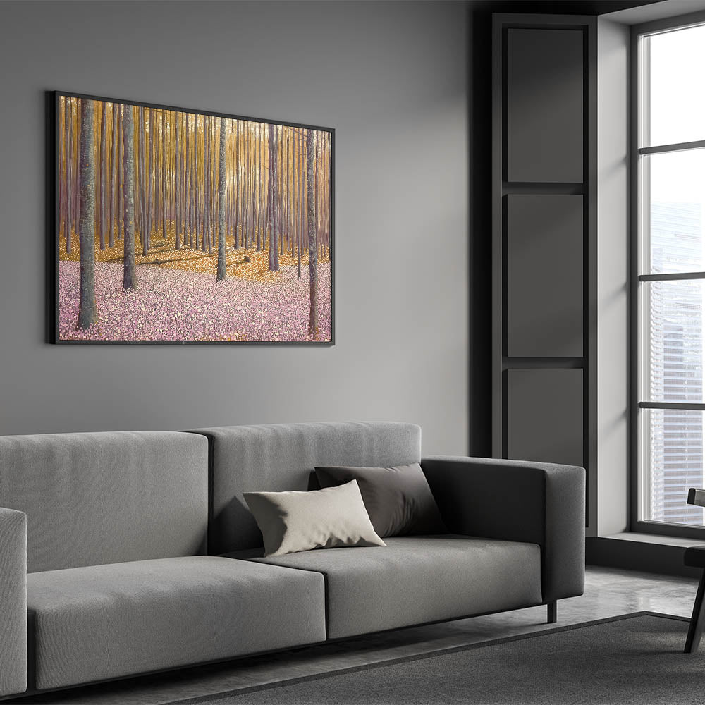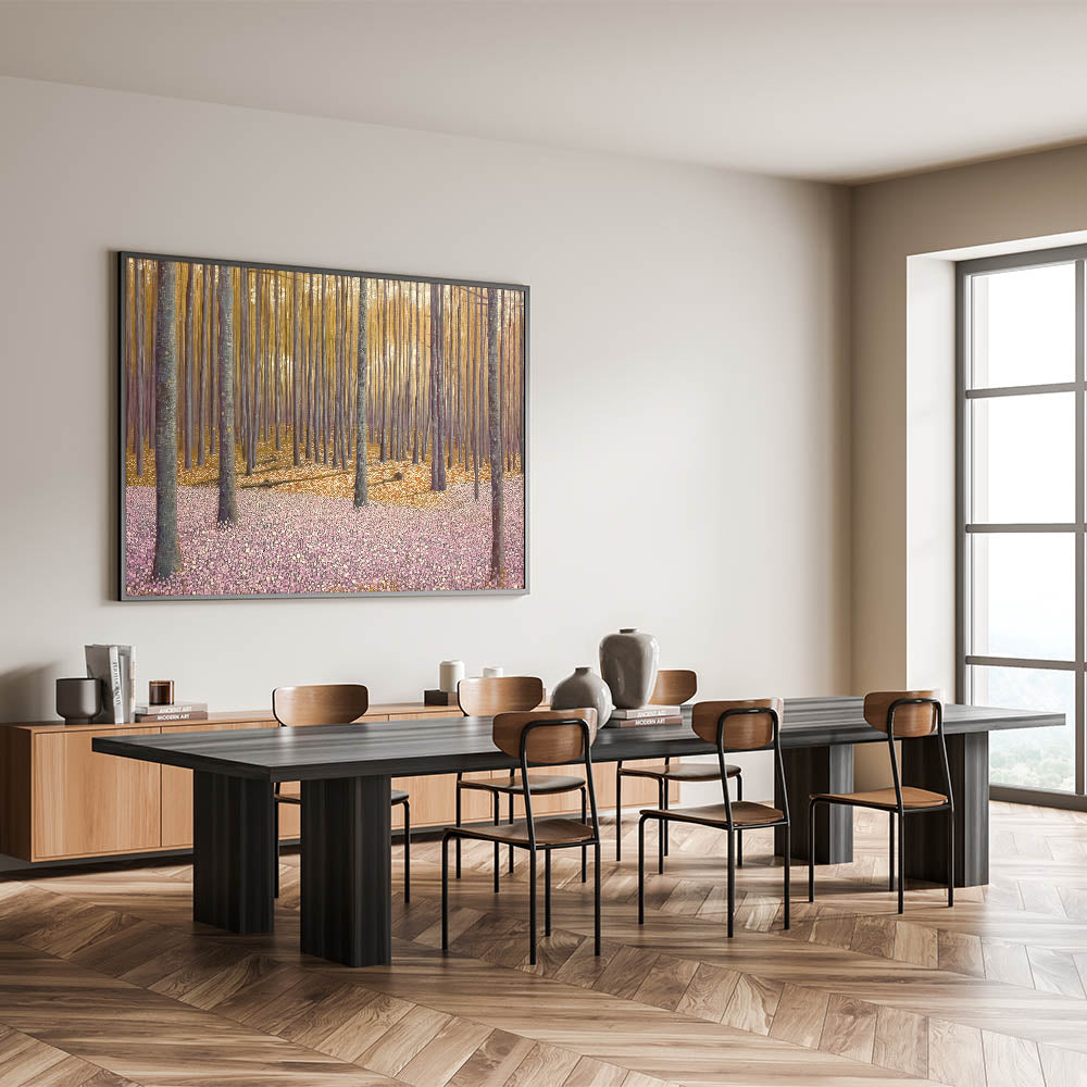 Invite the beauty of nature into your home with this abstract floral artwork for home decor, featuring a golden-lit forest and a soft pink floral ground. This modern flower abstract painting captures the tranquility of a dreamy woodland scene, where warm light filters through tall trees, casting long shadows over a delicate sea of blossoms. The balance of earthy tones and soft pastels makes this contemporary botanical canvas print a versatile and captivating piece.