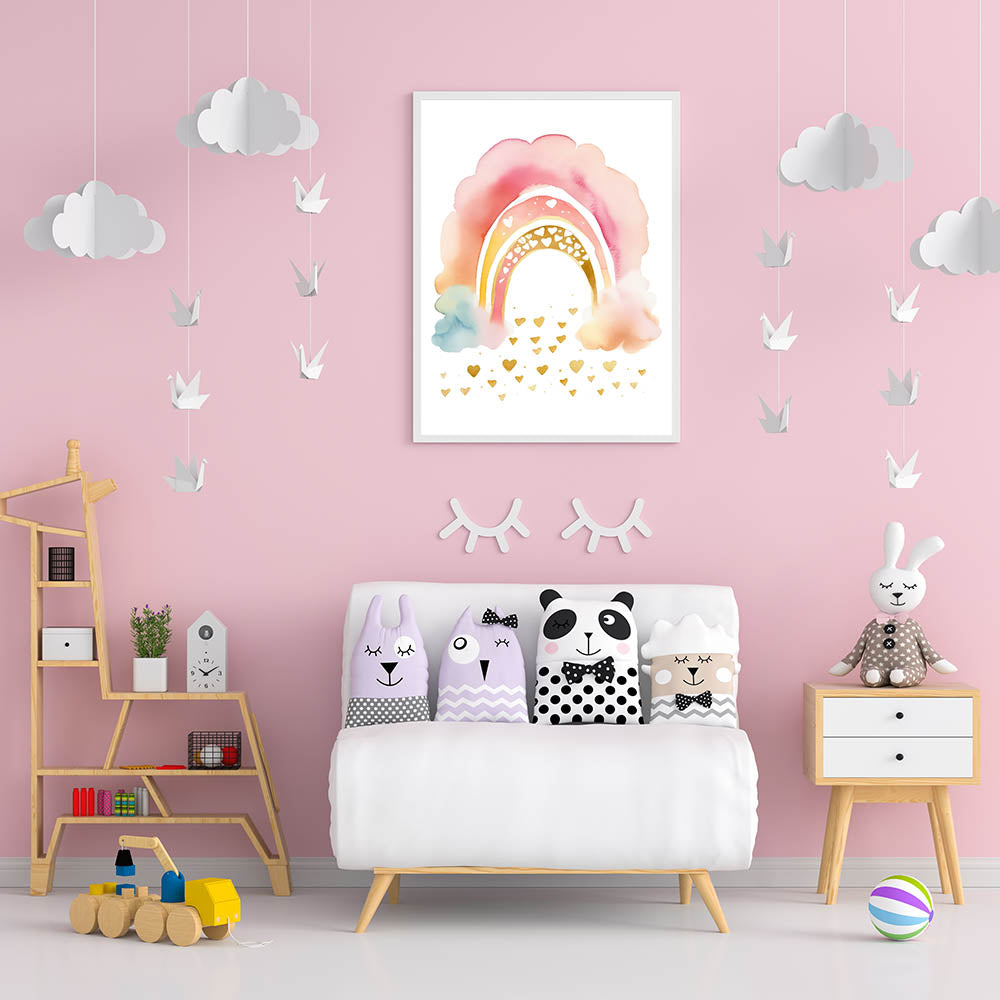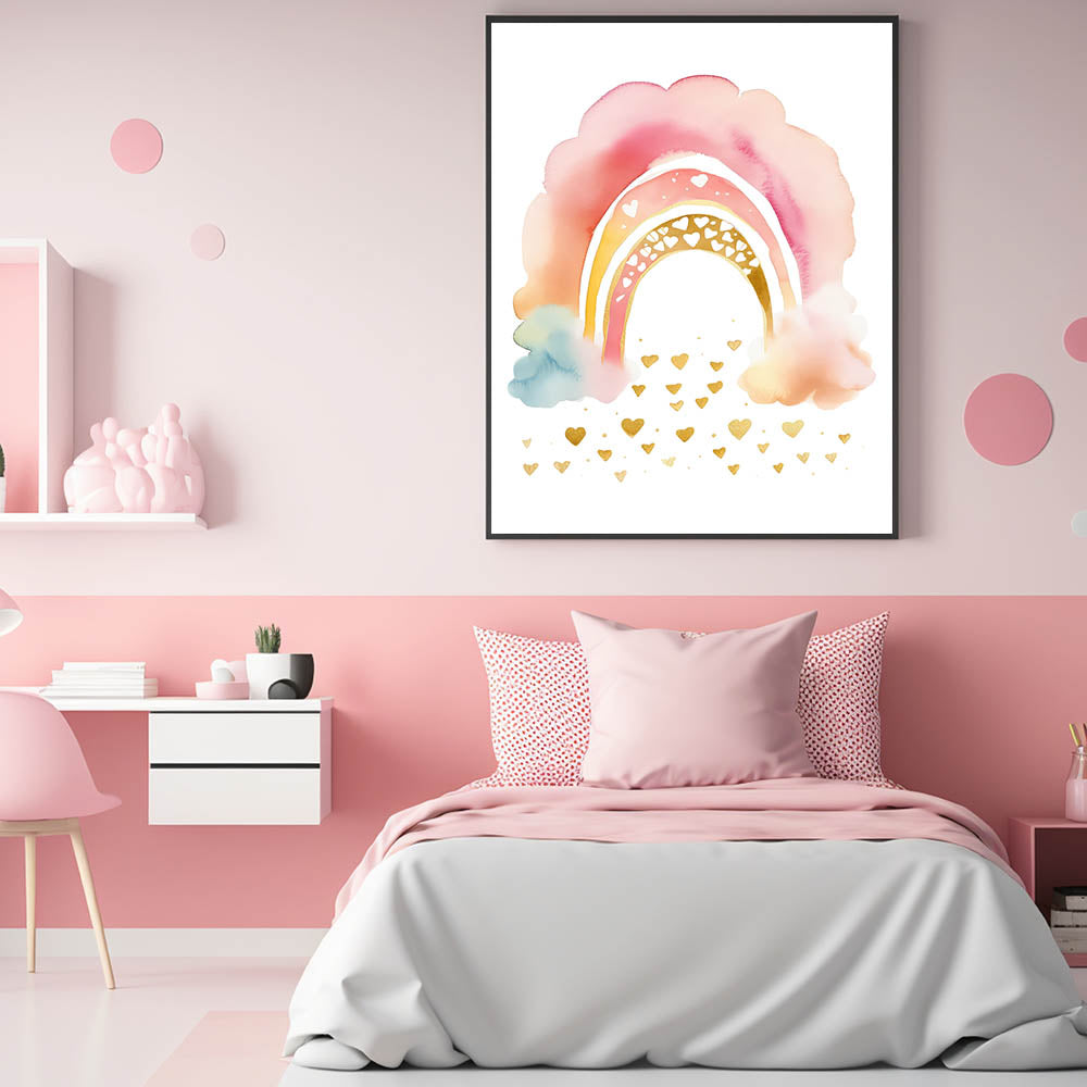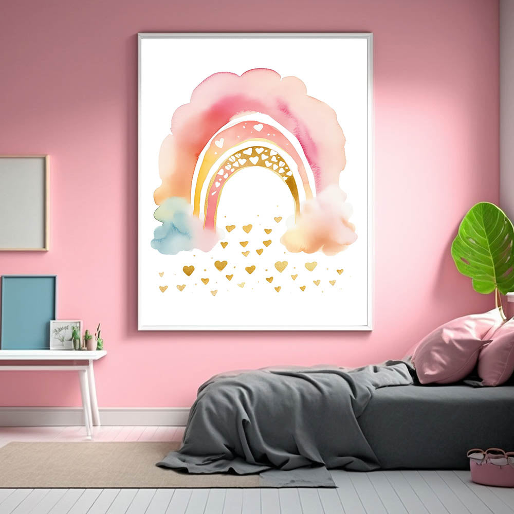 Fill your child's space with warmth and magic with this enchanting golden heart rainbow wall art. Featuring a delicate watercolor rainbow in soft pink, gold, and yellow hues, this artwork is adorned with tiny hearts and sparkling golden details, bringing a dreamy and whimsical touch to nurseries, girls' bedrooms, and playrooms. The pastel clouds and gentle color transitions create a soothing and joyful atmosphere, making it the perfect decor piece for any child's space.