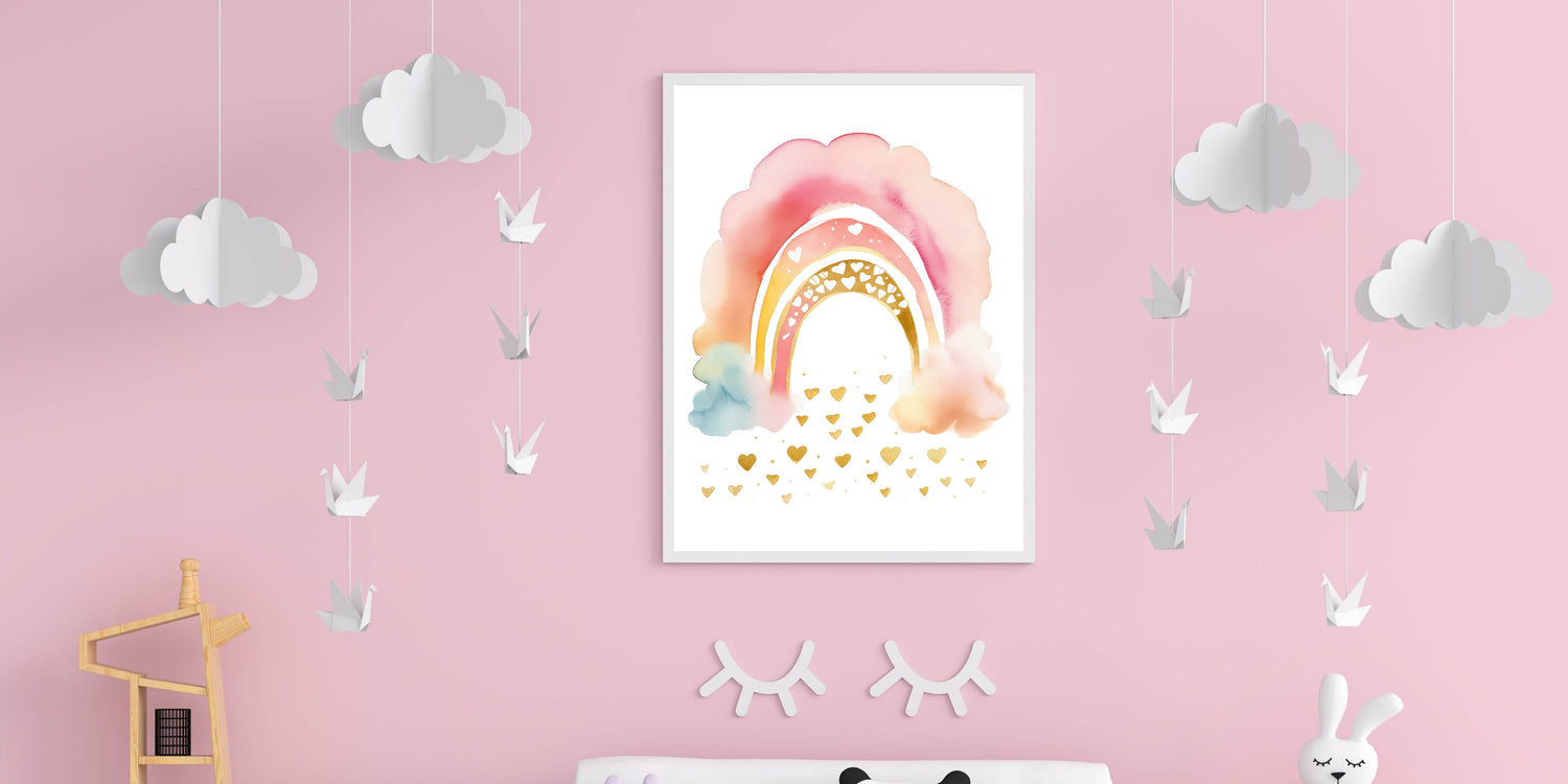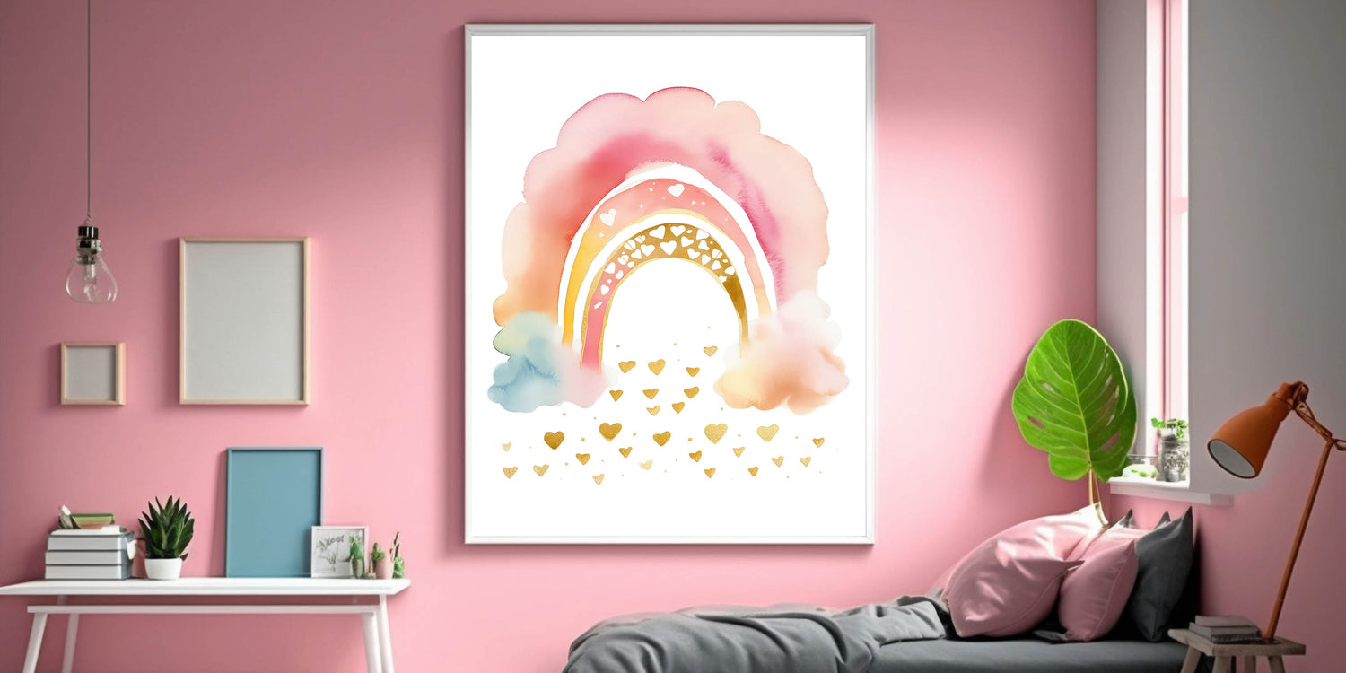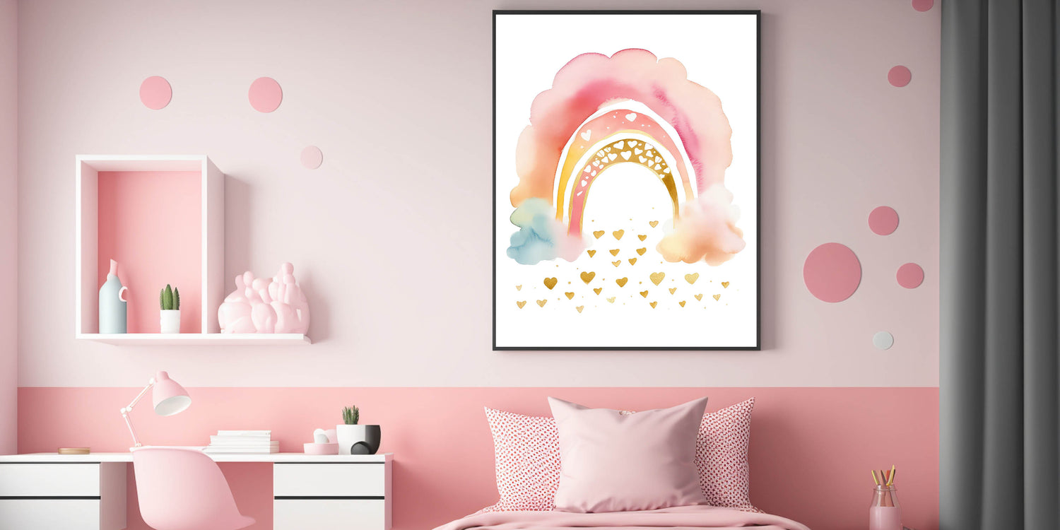 Fill your child's space with warmth and magic with this enchanting golden heart rainbow wall art. Featuring a delicate watercolor rainbow in soft pink, gold, and yellow hues, this artwork is adorned with tiny hearts and sparkling golden details, bringing a dreamy and whimsical touch to nurseries, girls' bedrooms, and playrooms. The pastel clouds and gentle color transitions create a soothing and joyful atmosphere, making it the perfect decor piece for any child's space.