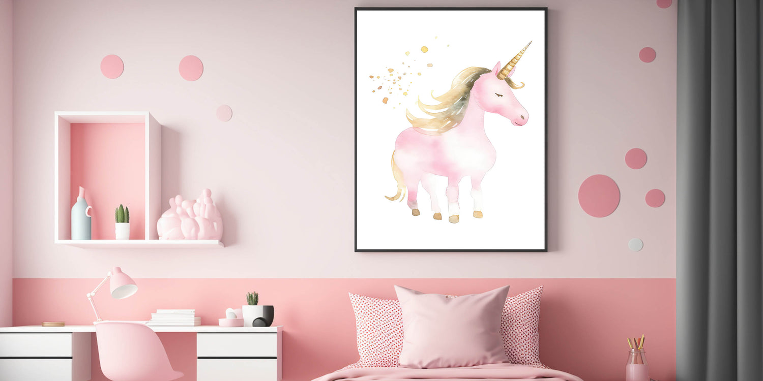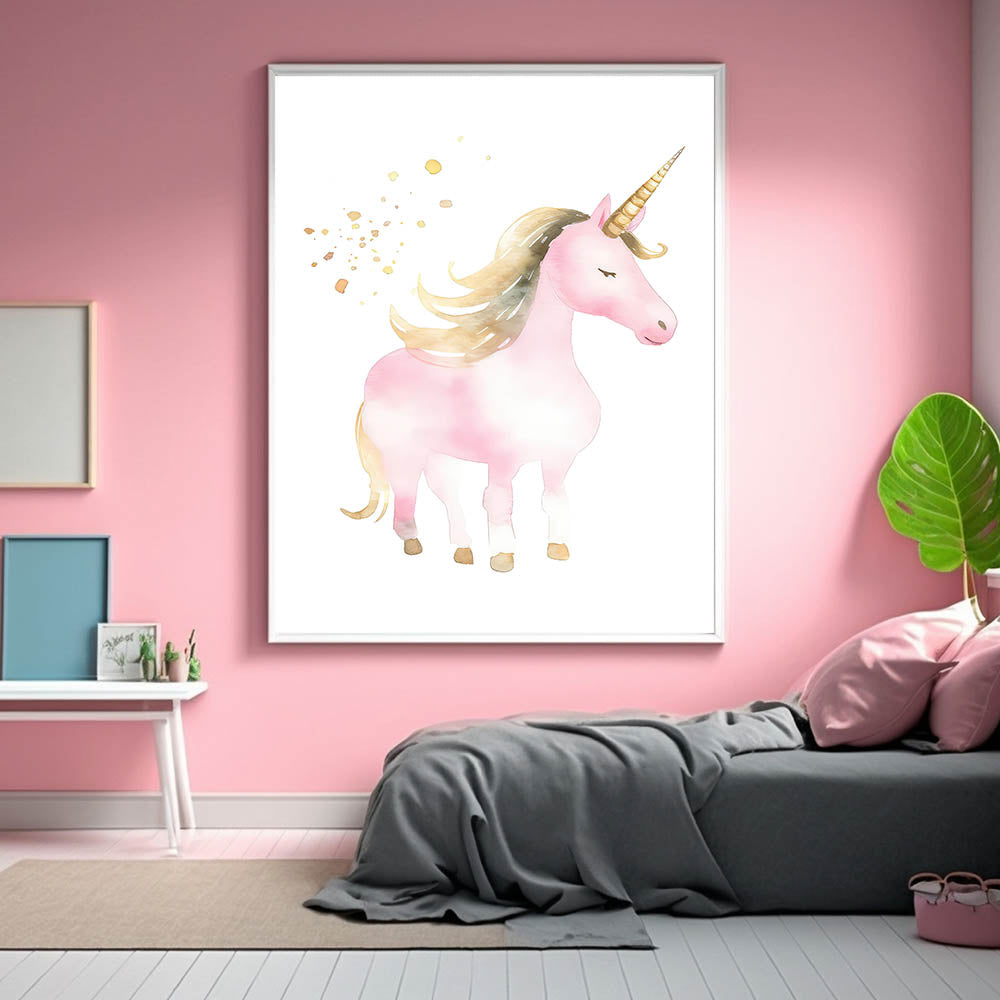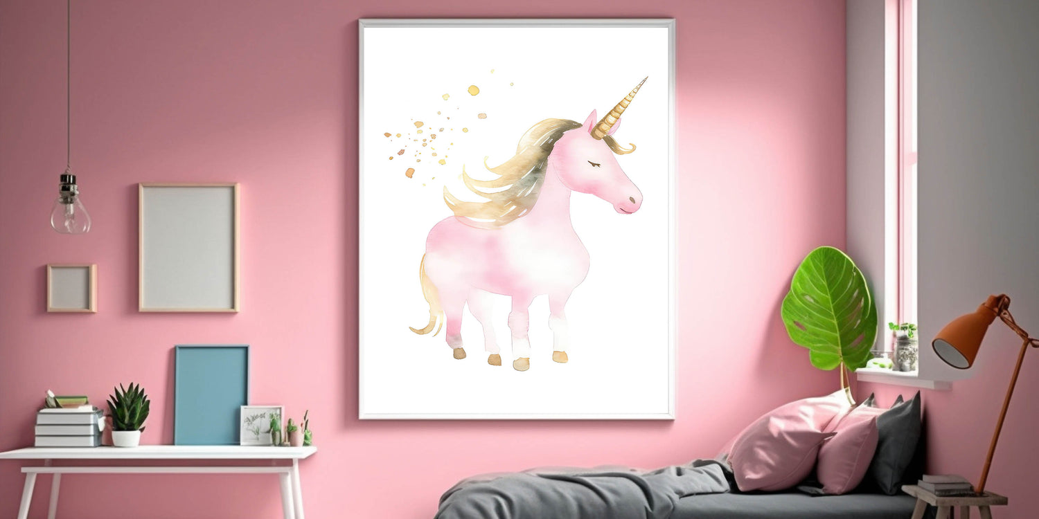 Transform your child's space into a dreamy wonderland with this enchanting golden unicorn wall art. Featuring a beautifully illustrated pink unicorn with a flowing golden mane and shimmering horn, this artwork captures the magic and fantasy of childhood. The delicate watercolor tones and soft gold accents create a whimsical and elegant atmosphere, making it the perfect decor piece for nurseries, girls' bedrooms, and playrooms.