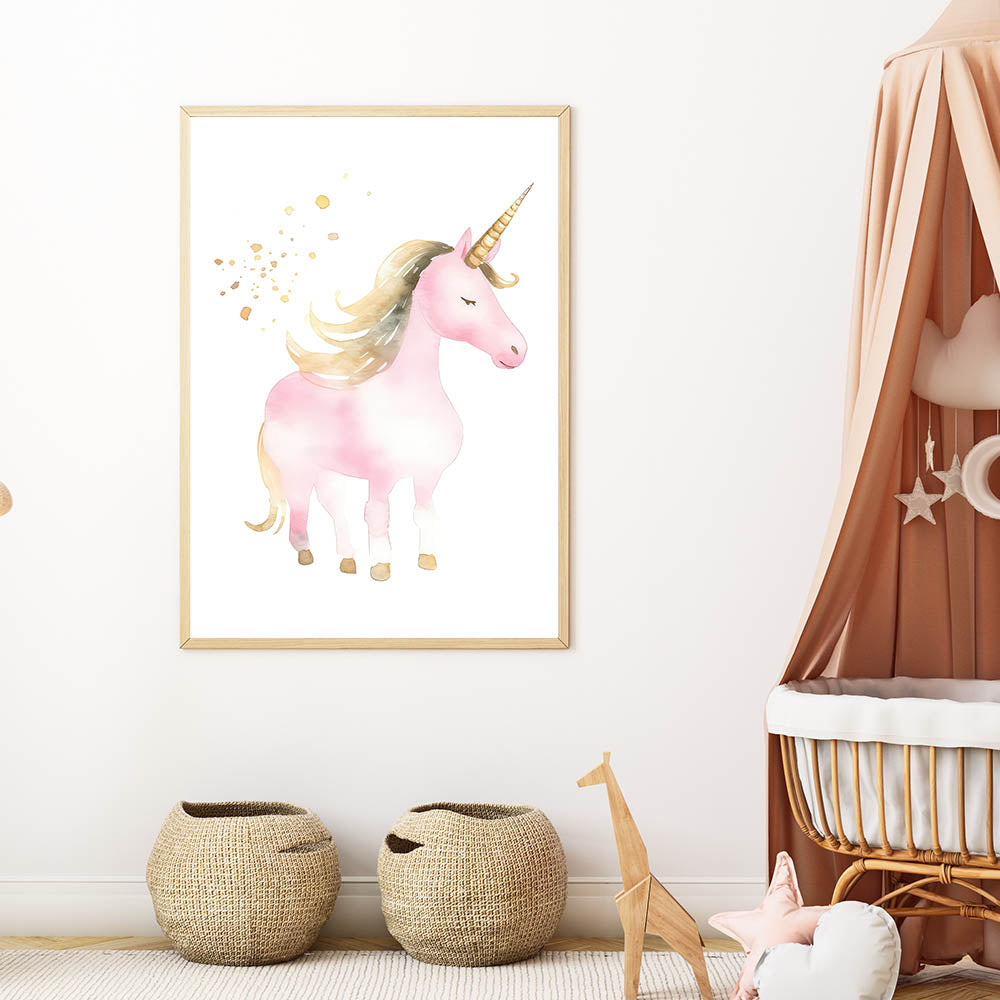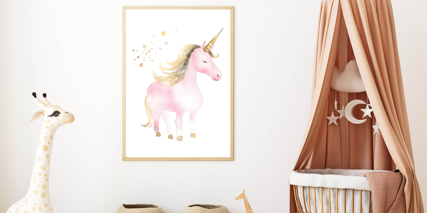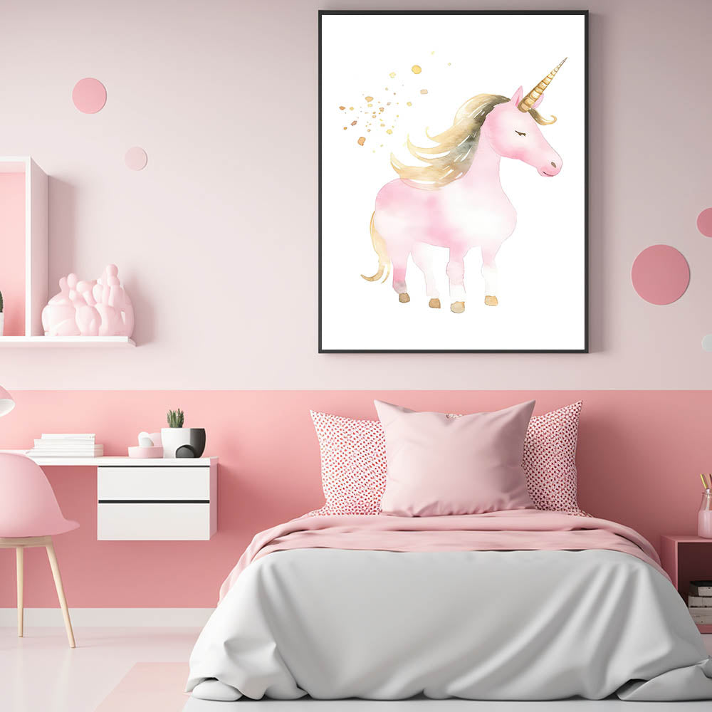 Transform your child's space into a dreamy wonderland with this enchanting golden unicorn wall art. Featuring a beautifully illustrated pink unicorn with a flowing golden mane and shimmering horn, this artwork captures the magic and fantasy of childhood. The delicate watercolor tones and soft gold accents create a whimsical and elegant atmosphere, making it the perfect decor piece for nurseries, girls' bedrooms, and playrooms.