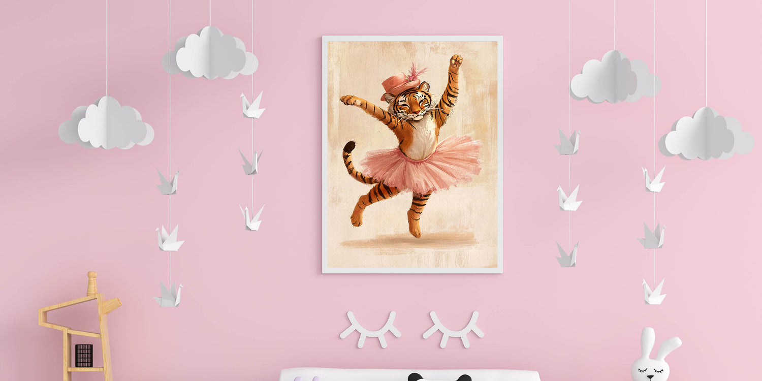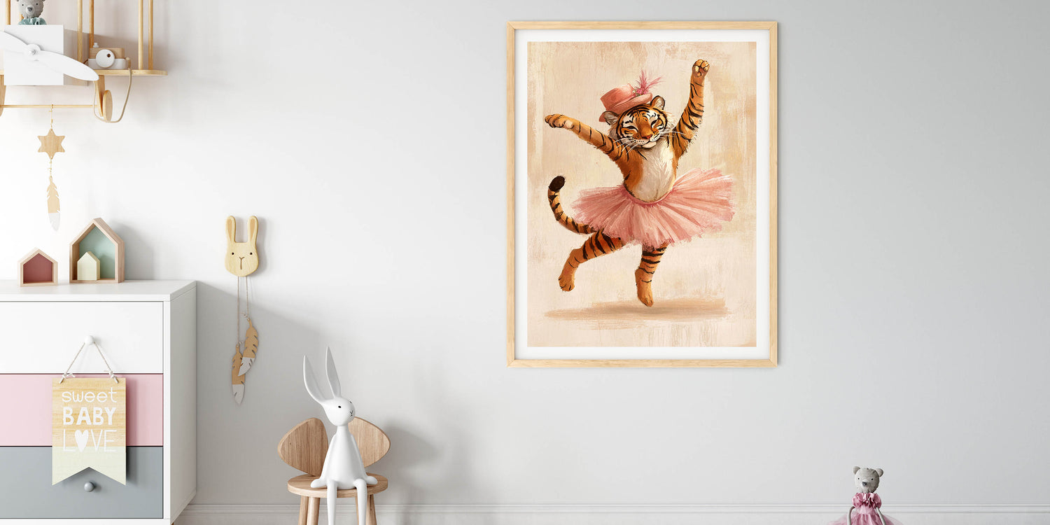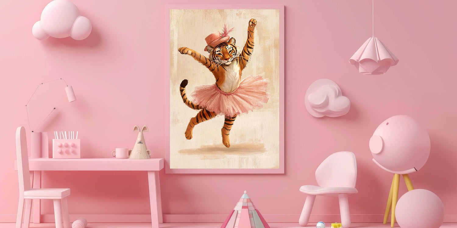 Inspire confidence and creativity with this graceful ballerina tiger wall art, featuring a charming tiger elegantly leaping in a soft pink tutu and a stylish feathered hat. This delightful design perfectly blends strength and grace, making it a standout addition to girls' bedrooms, nurseries, and playrooms. The warm beige-toned background enhances the vintage aesthetic, bringing a touch of sophistication to children’s wall decor.