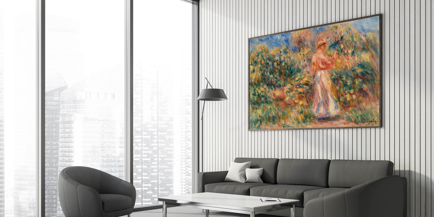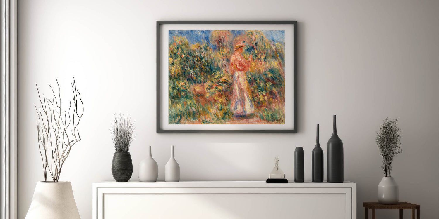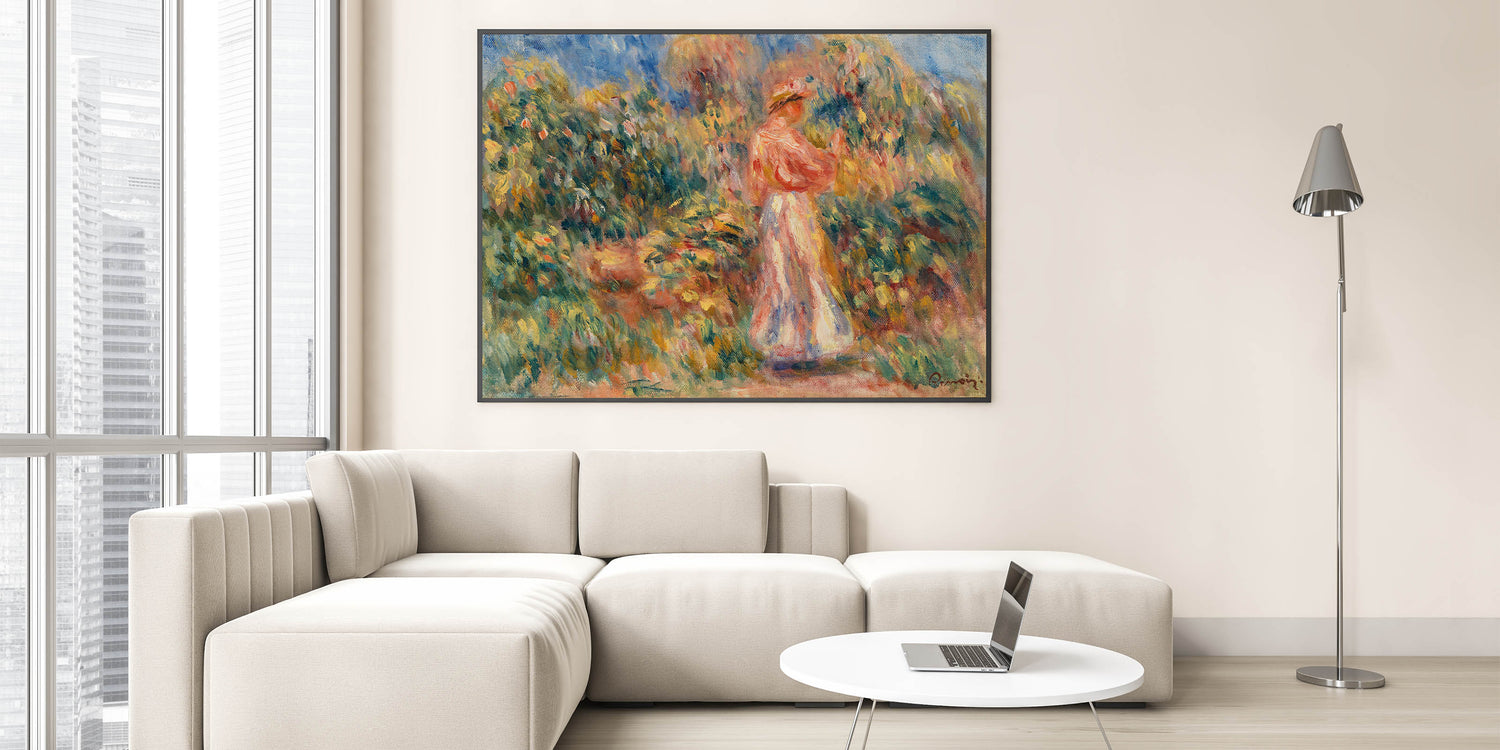 Add a touch of classic French Impressionism to your decor with this captivating garden scene inspired by Renoir. Featuring a woman dressed in soft pinks and whites amidst a lush, colorful landscape, this artwork captures the essence of nature and tranquility. Ideal for admirers of famous Impressionist artists, this piece brings warmth and a sense of timeless beauty to any room.
