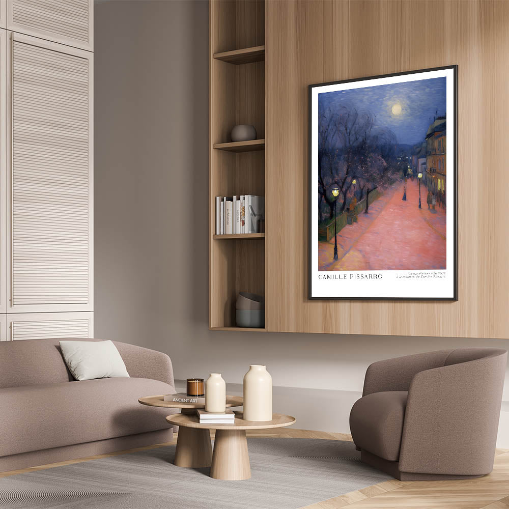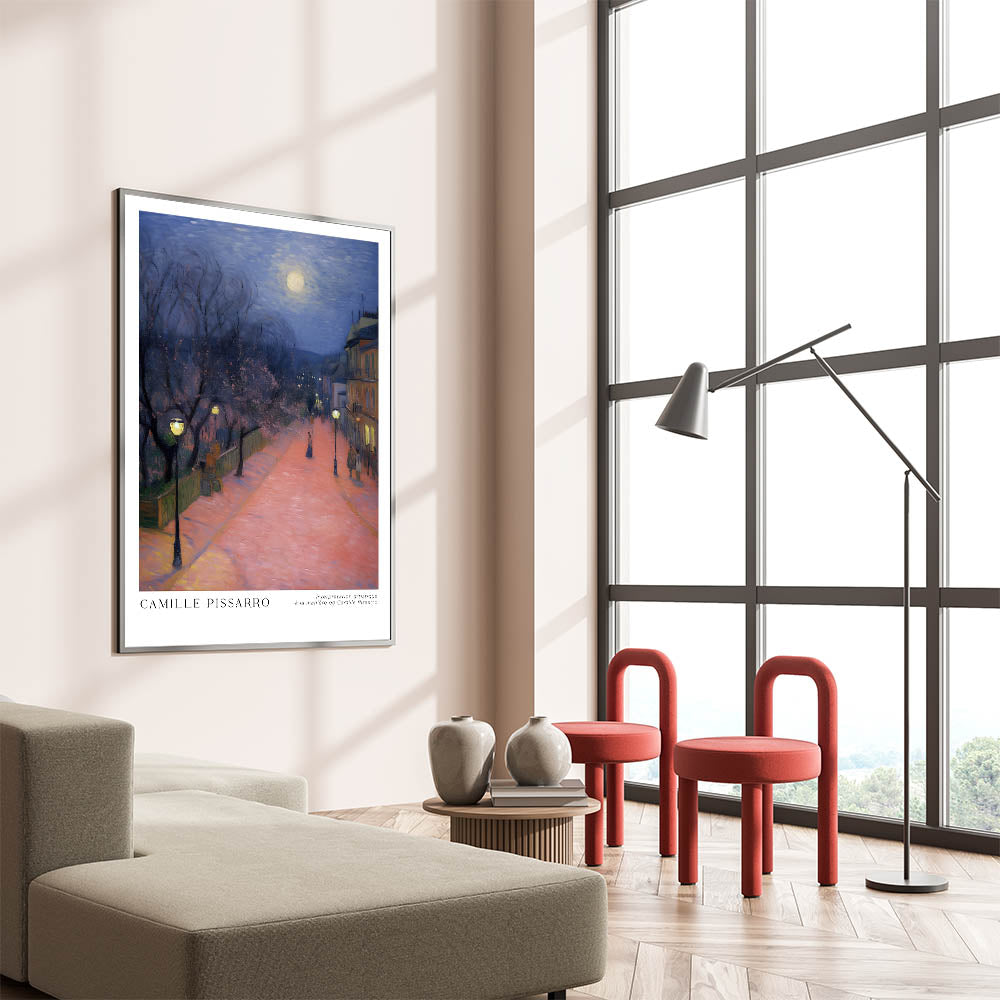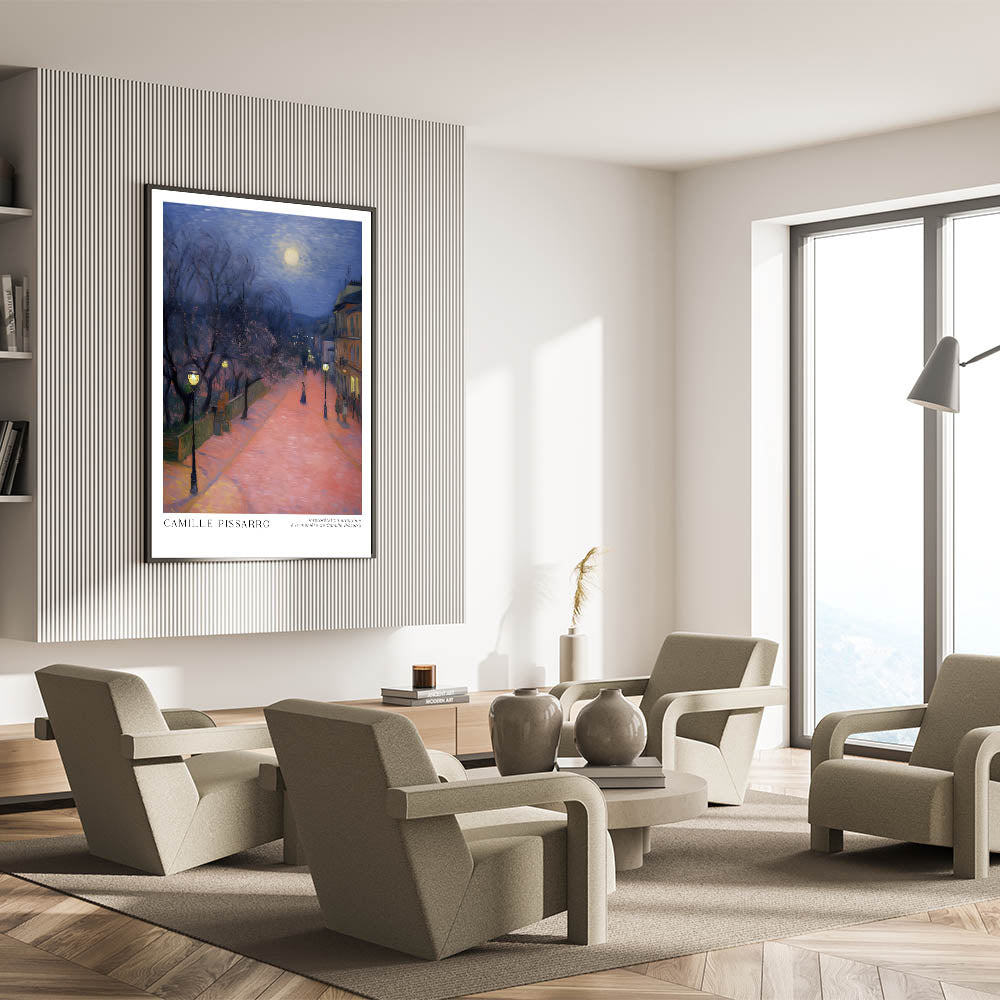 Embrace the quiet elegance of a moonlit evening with this Camille Pissarro-inspired artwork, capturing a serene Impressionist cityscape. The soft glow of the moon illuminates the streets, casting a gentle, calming light over the scene, characteristic of Pissarro's artistic masterpieces. This piece is perfect for adding a touch of French landscape art to your home decor.