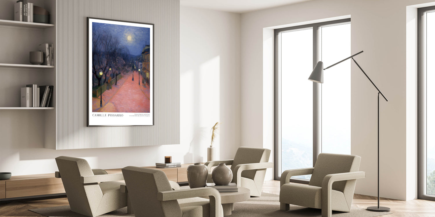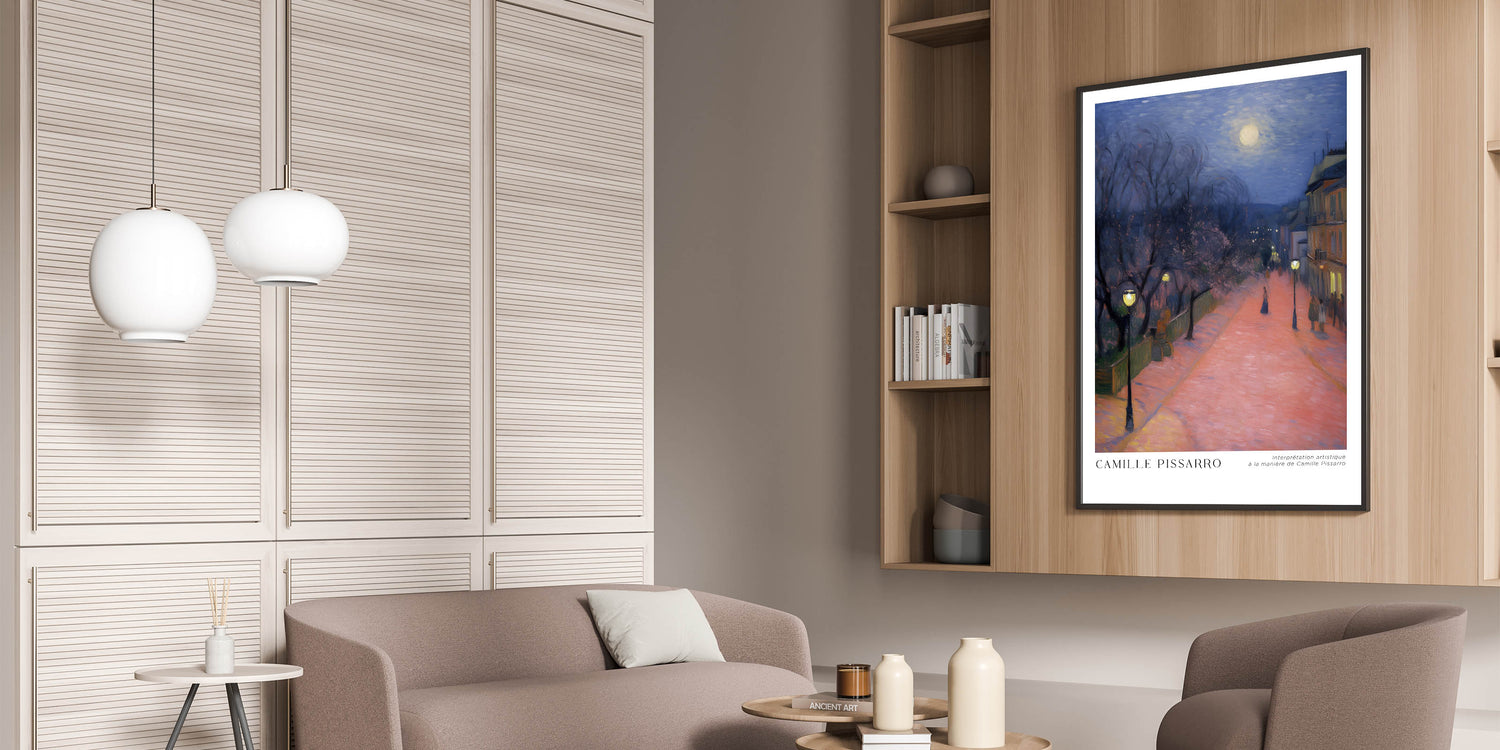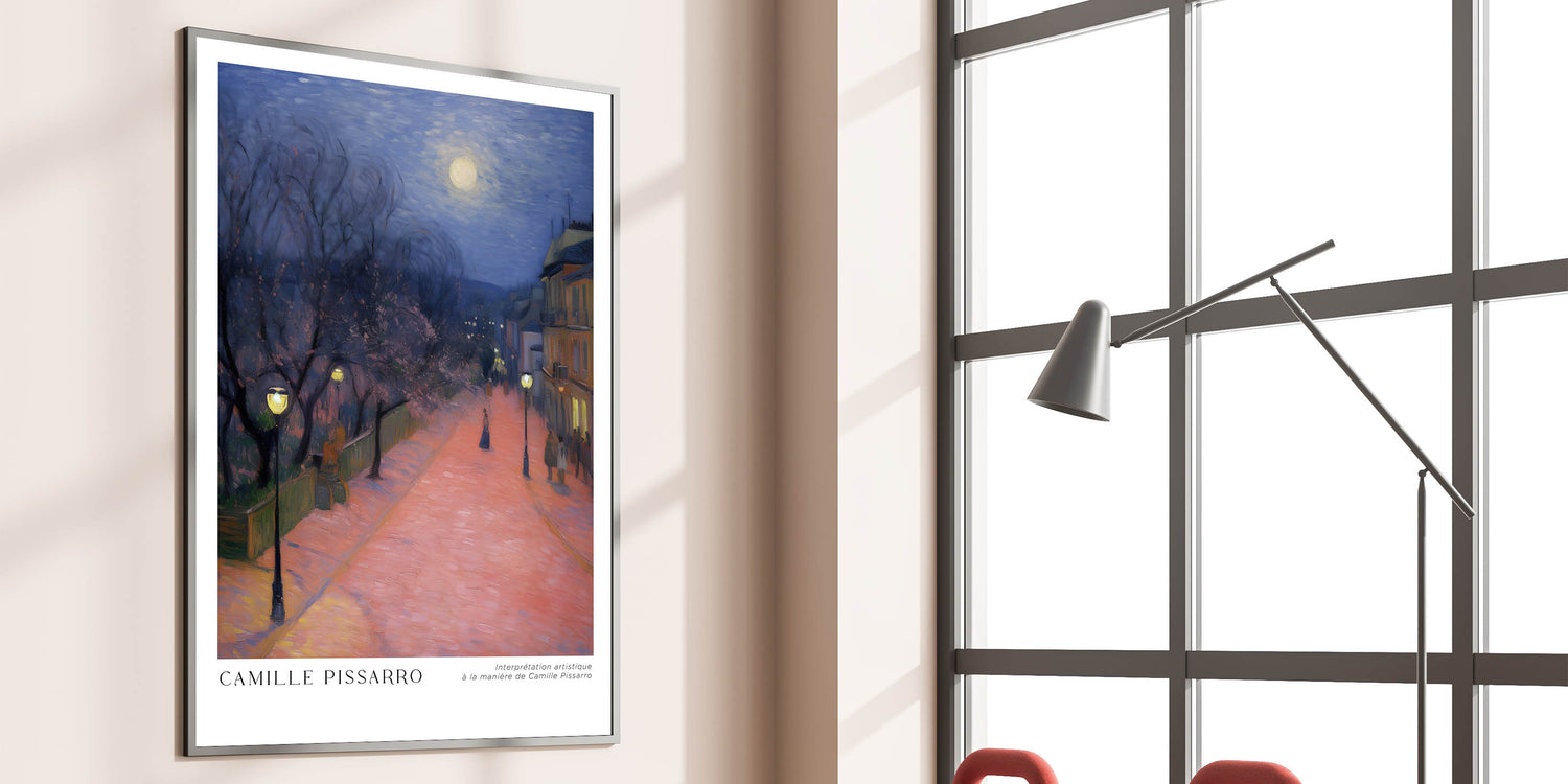 Embrace the quiet elegance of a moonlit evening with this Camille Pissarro-inspired artwork, capturing a serene Impressionist cityscape. The soft glow of the moon illuminates the streets, casting a gentle, calming light over the scene, characteristic of Pissarro's artistic masterpieces. This piece is perfect for adding a touch of French landscape art to your home decor.