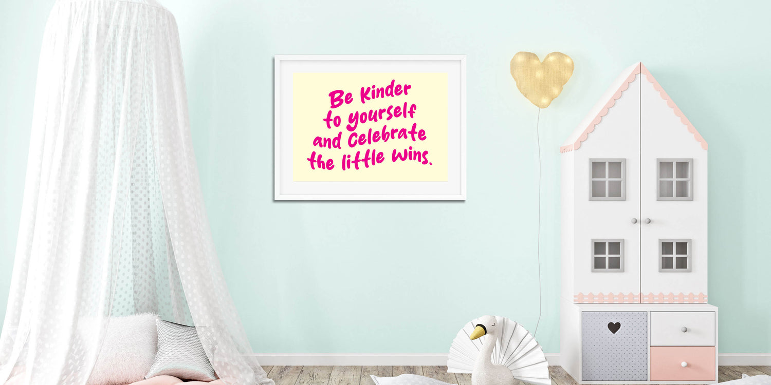 Encourage positivity and self-love with this Girls Room Wall Art, featuring an uplifting quote in bold, playful typography. The vibrant hot pink lettering against a soft beige background makes it a cheerful addition to any nursery, bedroom, or playroom. Designed to inspire confidence and happiness, this artwork serves as the perfect daily reminder for kids to embrace kindness and celebrate their achievements.