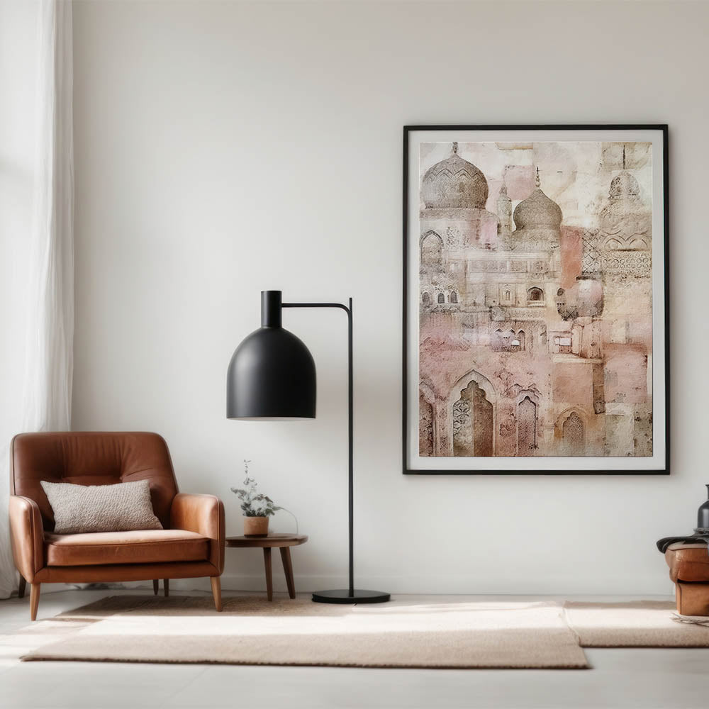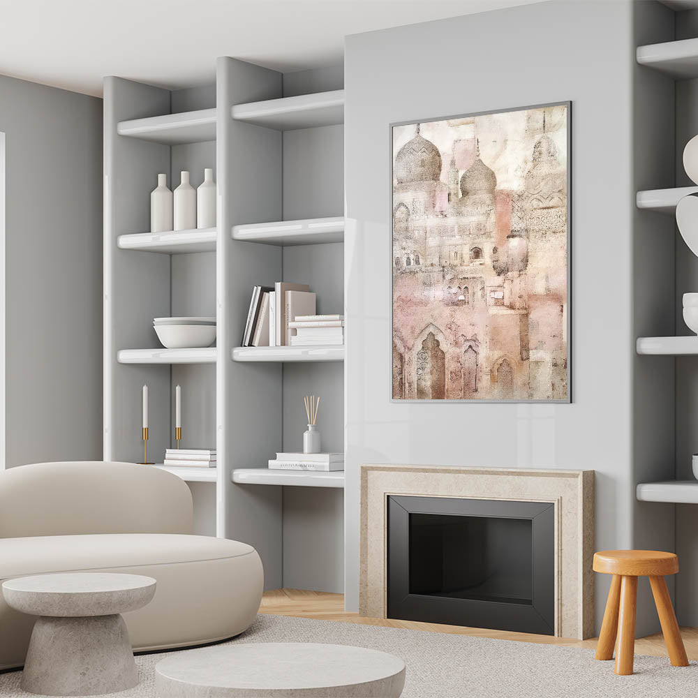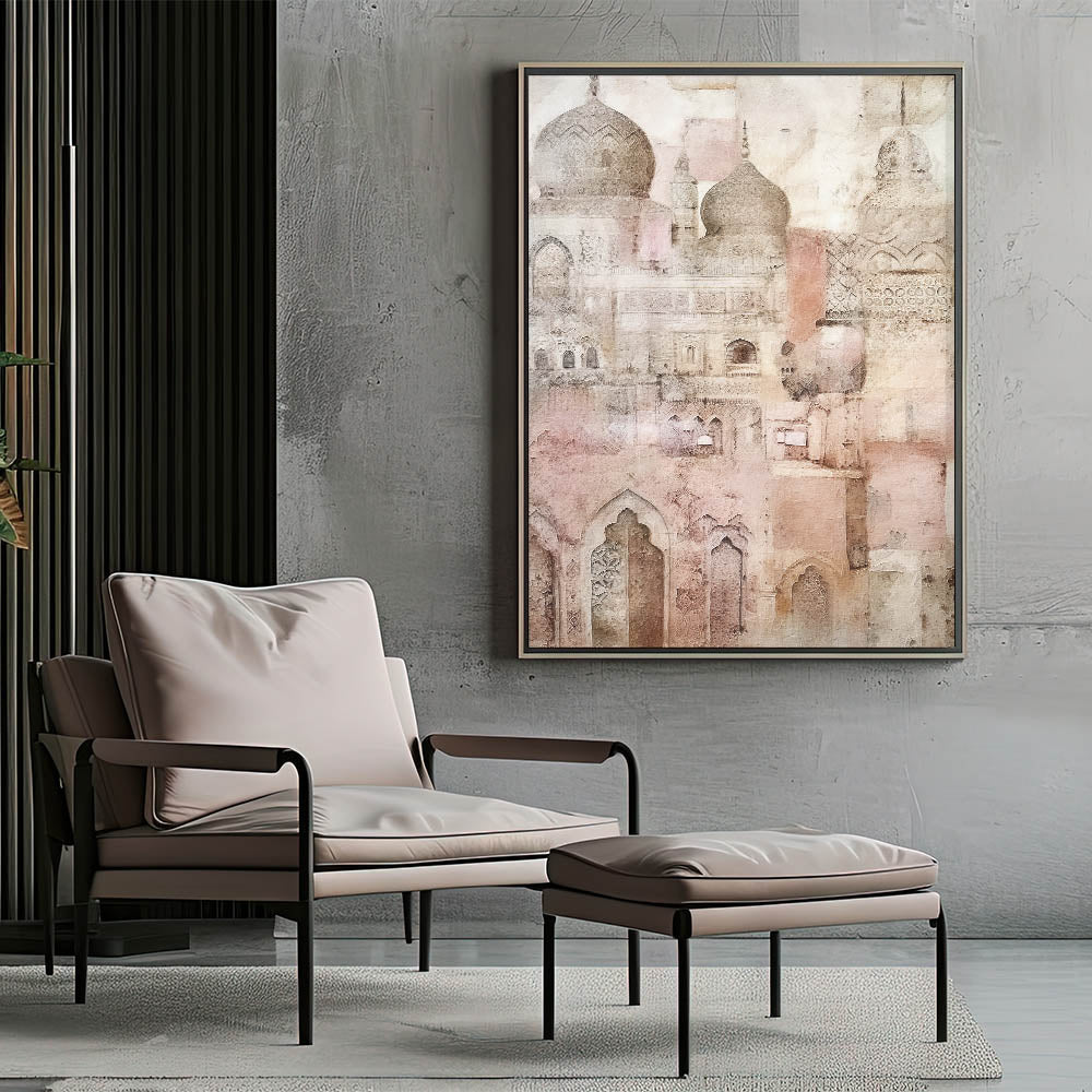 Add a touch of timeless elegance to your space with this intricate domed architecture art. Featuring detailed arches, domes, and ornamental patterns, this artwork beautifully captures the essence of classic architecture through a soft, vintage lens. The delicate beige and pink tones create a calming, ethereal atmosphere, ideal for adding sophistication to any room. Perfect for those who admire the blend of history and artistry, this piece is available in multiple formats to suit various interior styles.
