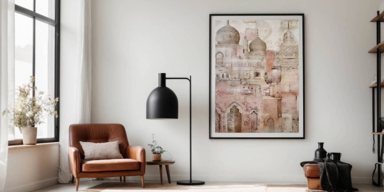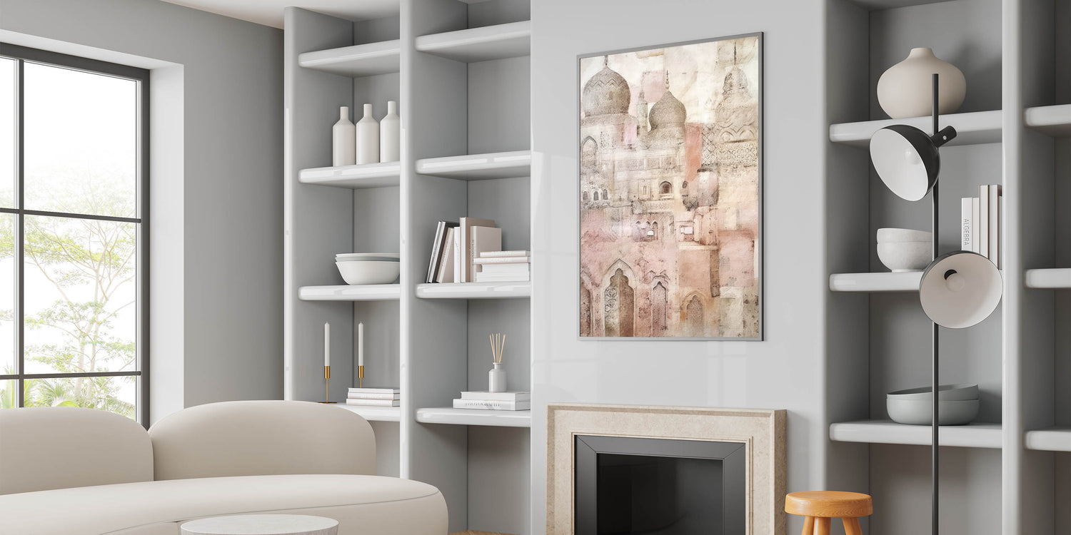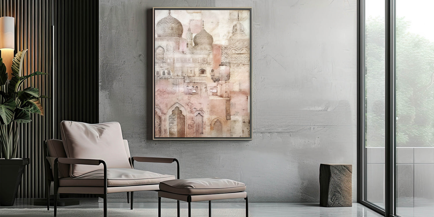 Add a touch of timeless elegance to your space with this intricate domed architecture art. Featuring detailed arches, domes, and ornamental patterns, this artwork beautifully captures the essence of classic architecture through a soft, vintage lens. The delicate beige and pink tones create a calming, ethereal atmosphere, ideal for adding sophistication to any room. Perfect for those who admire the blend of history and artistry, this piece is available in multiple formats to suit various interior styles.