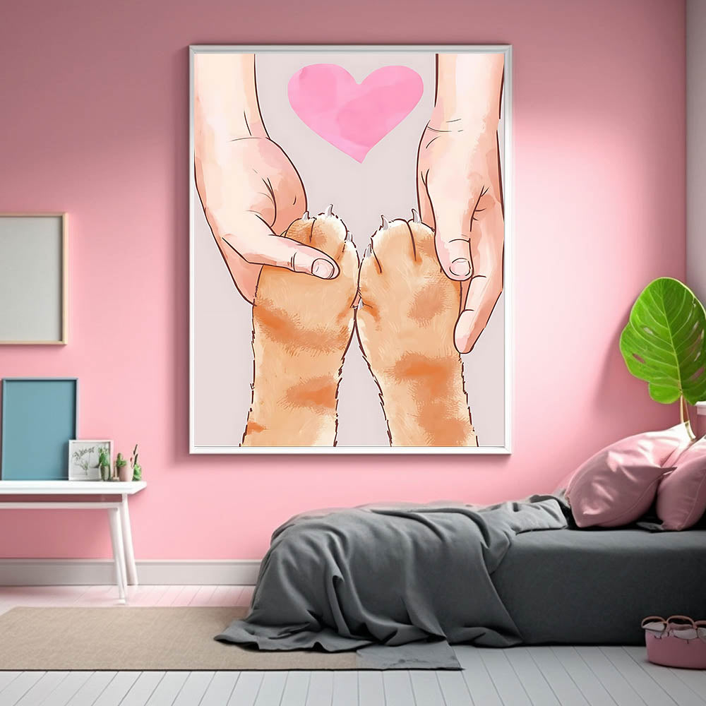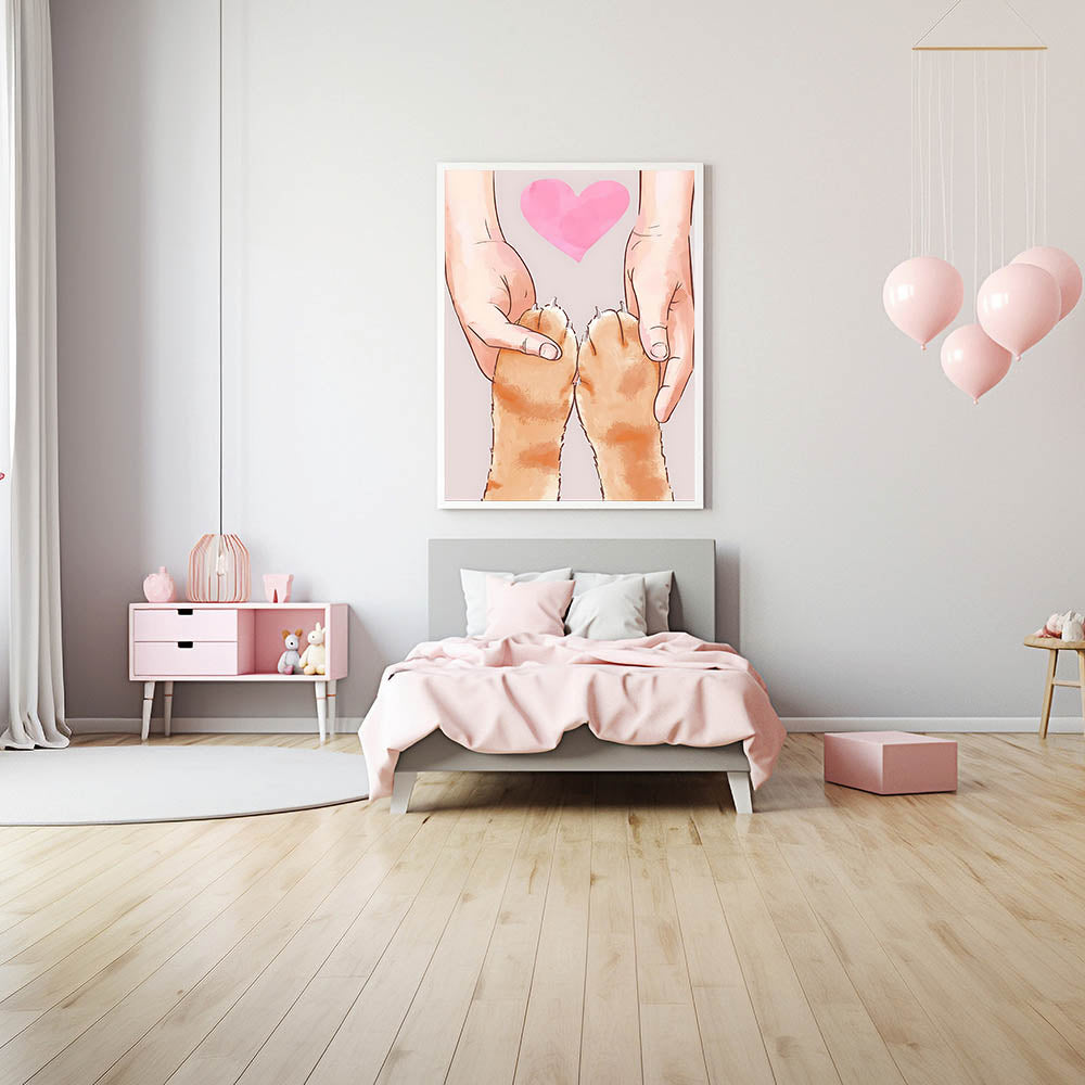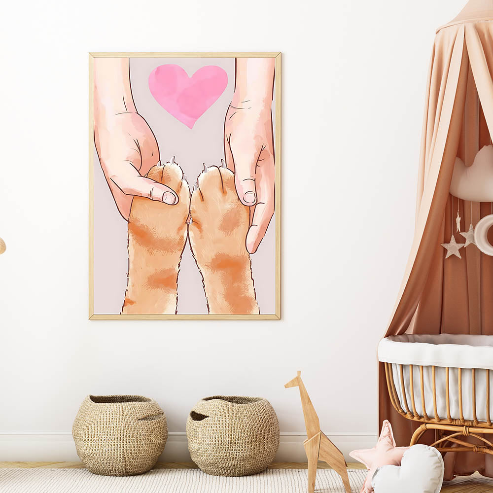 Celebrate the bond between pets and their owners with this heartwarming Kids Room Art Print. Featuring a touching illustration of human hands holding a cat’s paws with a soft pink heart in the background, this artwork embodies love, trust, and companionship. Its warm, neutral tones make it a perfect addition to children's wall decor, creating a comforting and joyful atmosphere.