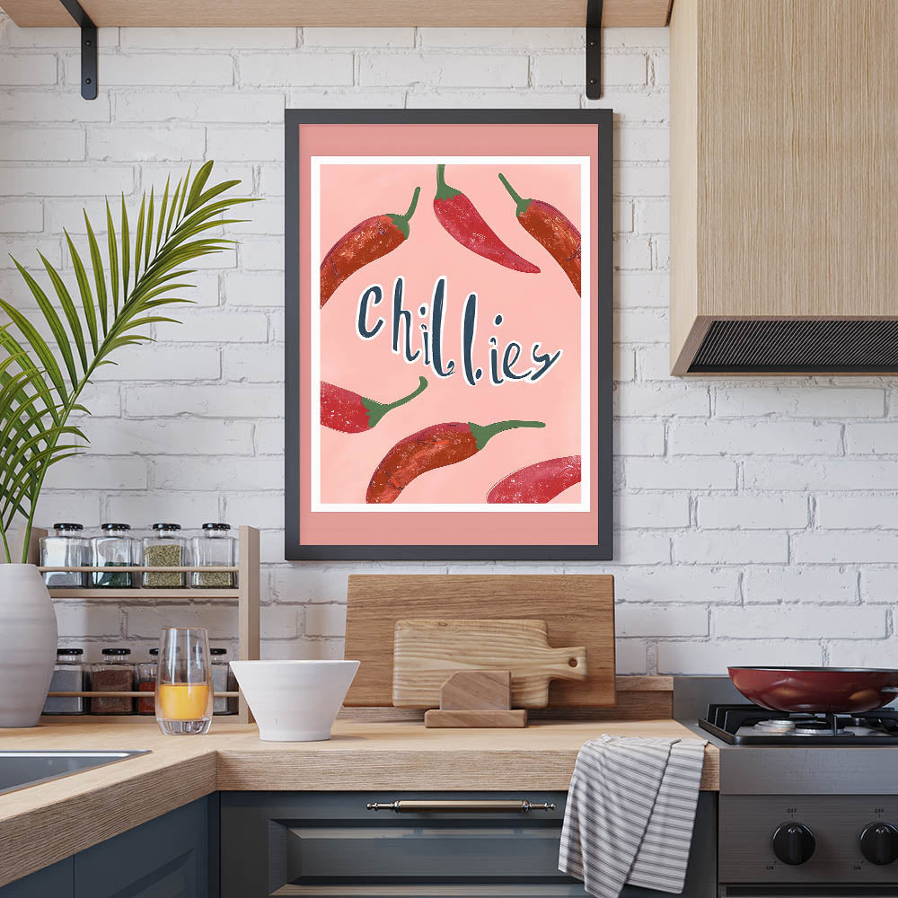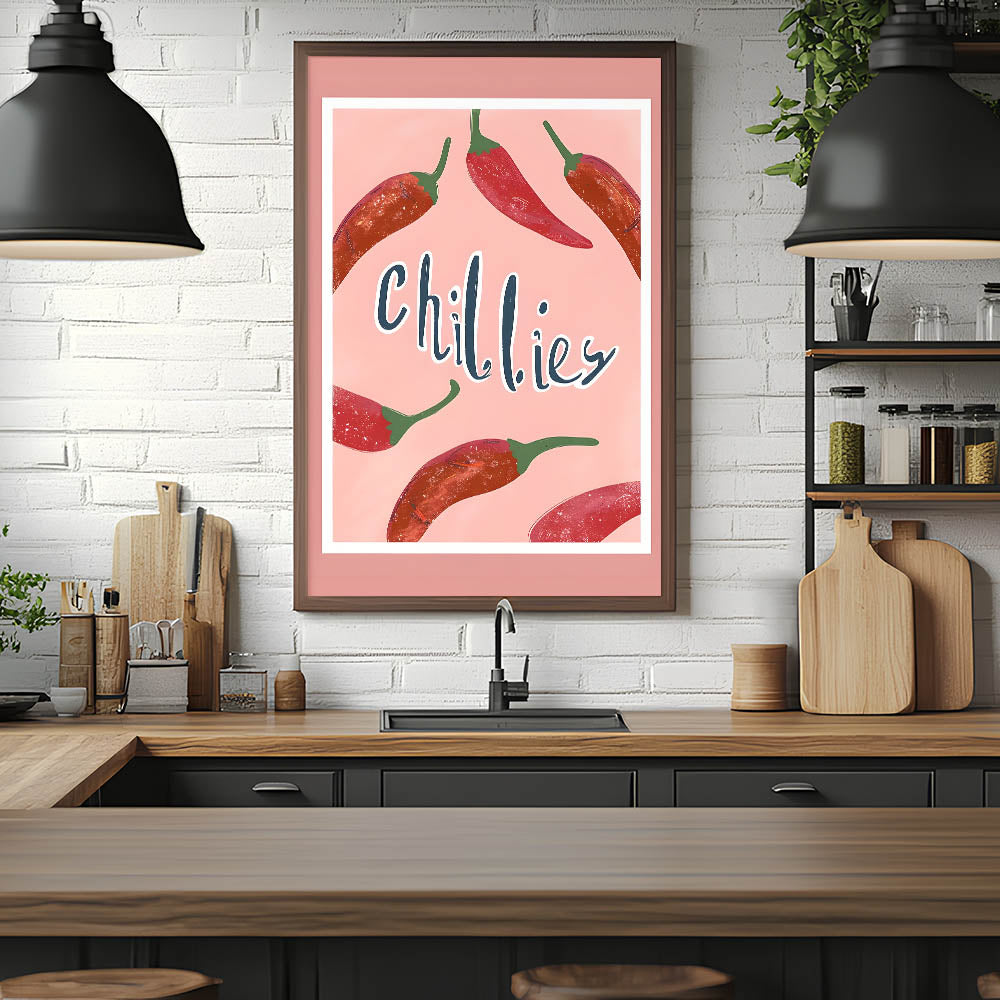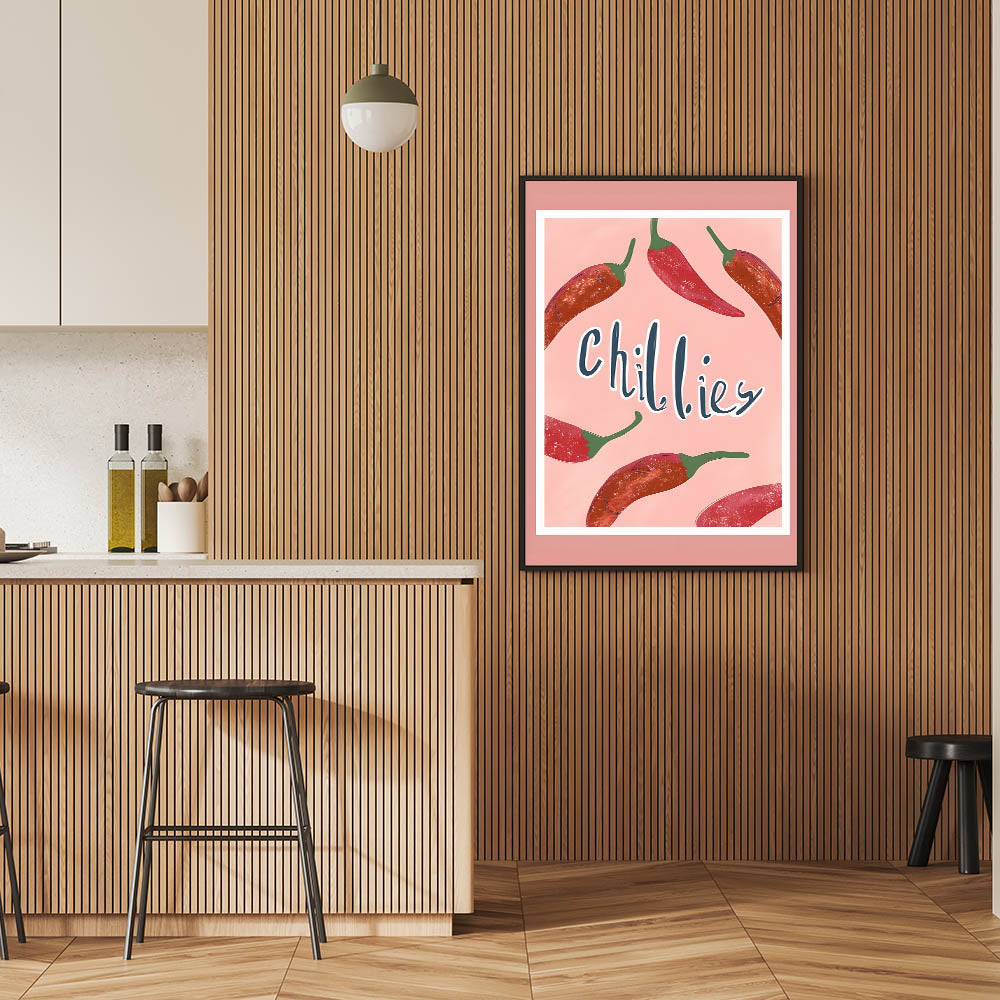 Spice up your kitchen with this fruit-themed wall art, featuring red chili peppers on a soft pink background with bold typography. This modern fruit illustration print adds a fun and stylish touch to any kitchen, café, or dining area, making it a perfect fruit kitchen art choice.