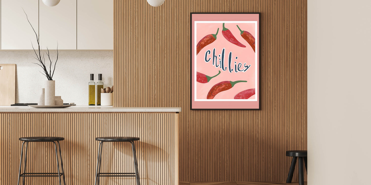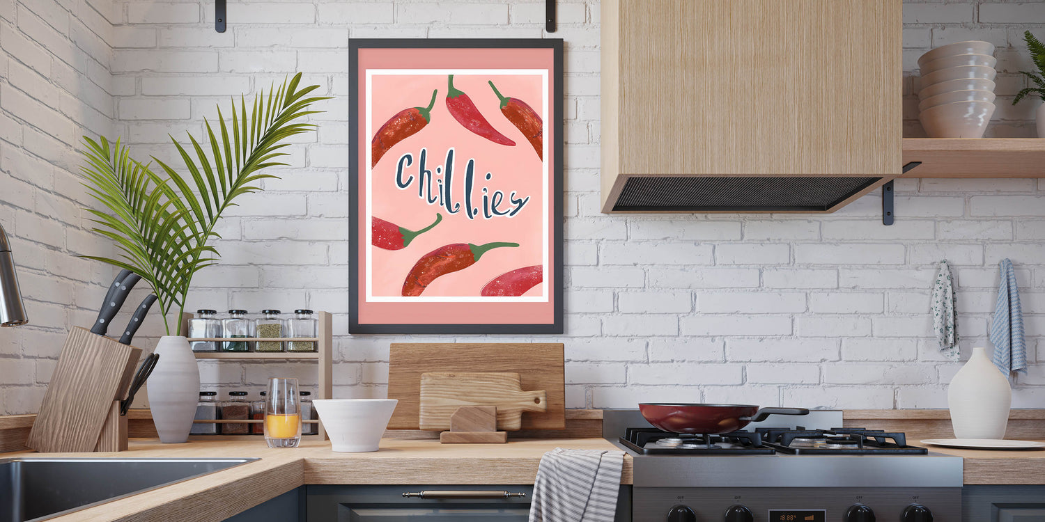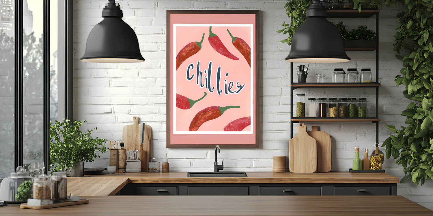 Spice up your kitchen with this fruit-themed wall art, featuring red chili peppers on a soft pink background with bold typography. This modern fruit illustration print adds a fun and stylish touch to any kitchen, café, or dining area, making it a perfect fruit kitchen art choice.