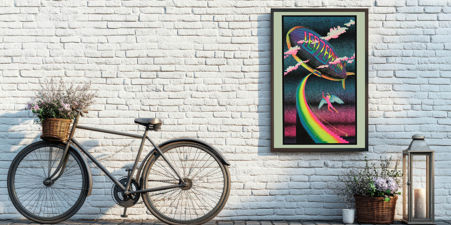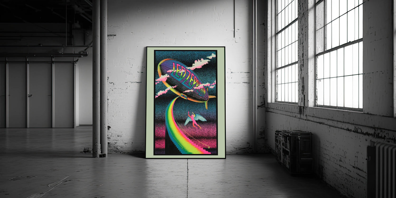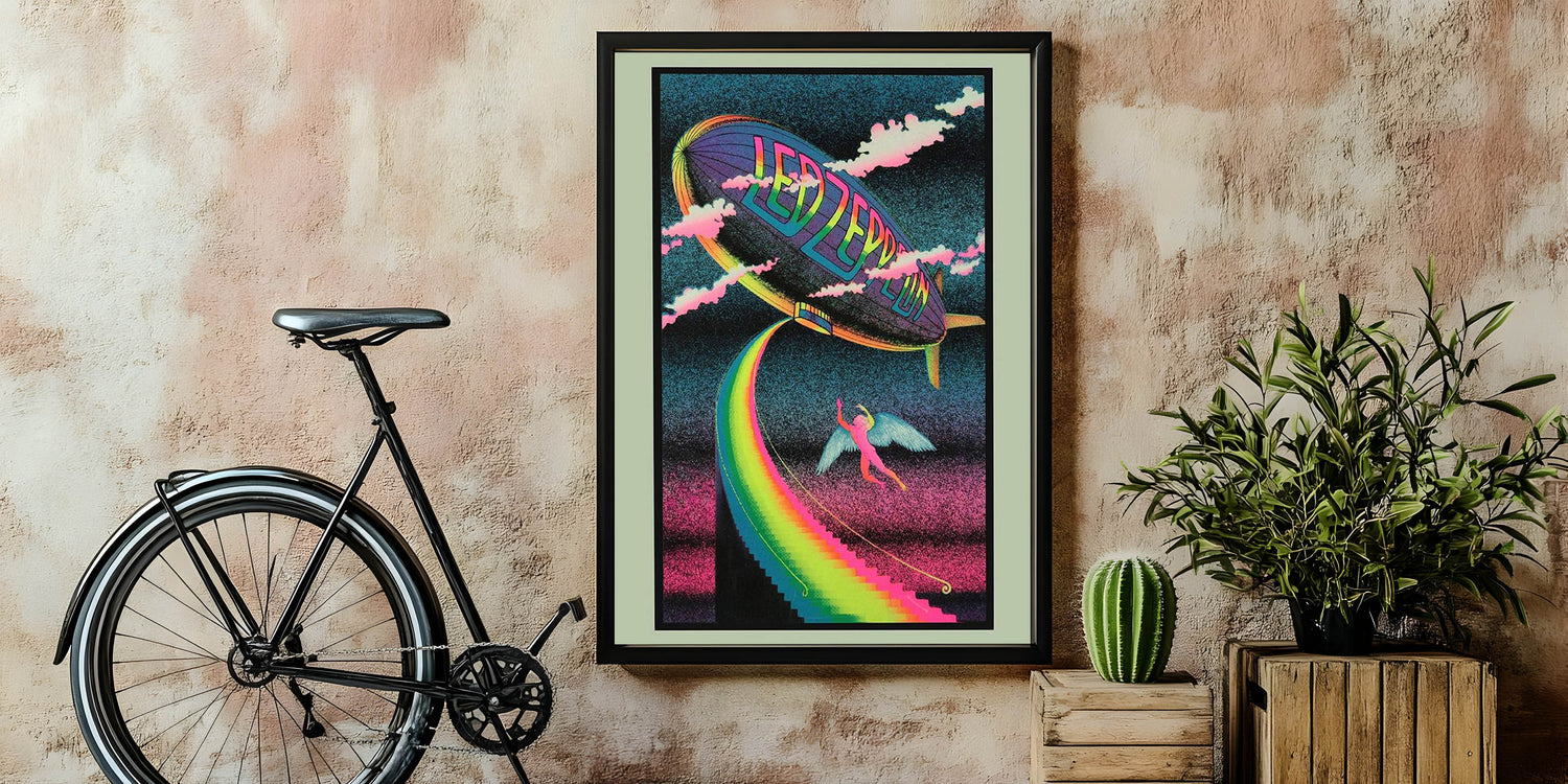 Bring the magic of Led Zeppelin’s iconic imagery into your home with this Rainbow Zeppelin poster. Featuring a surreal, psychedelic design with vibrant neon colors and a mystical figure, this vintage print captures the free-spirited energy of the '70s rock scene. Perfect for fans of classic rock and vintage concert posters, this design brings a bold, retro vibe to any space.