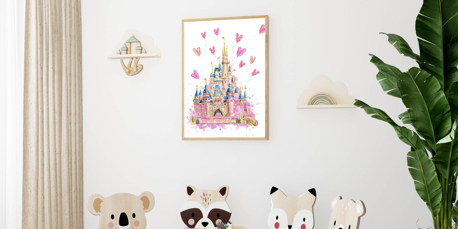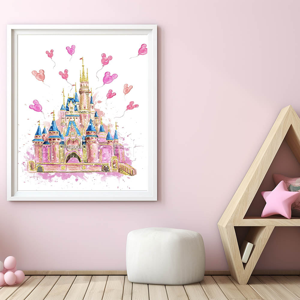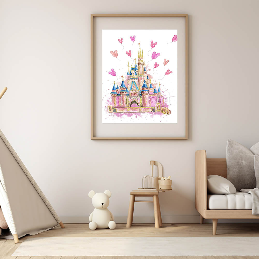 Transform your child's space into a fairytale wonderland with this pink castle wall art. Designed in a soft watercolor style, this enchanting piece features a majestic castle with gold details and blue rooftops, surrounded by whimsical pink balloons. Perfect for girls' bedrooms, nurseries, and playrooms, this artwork adds a touch of magic and wonder to any space.