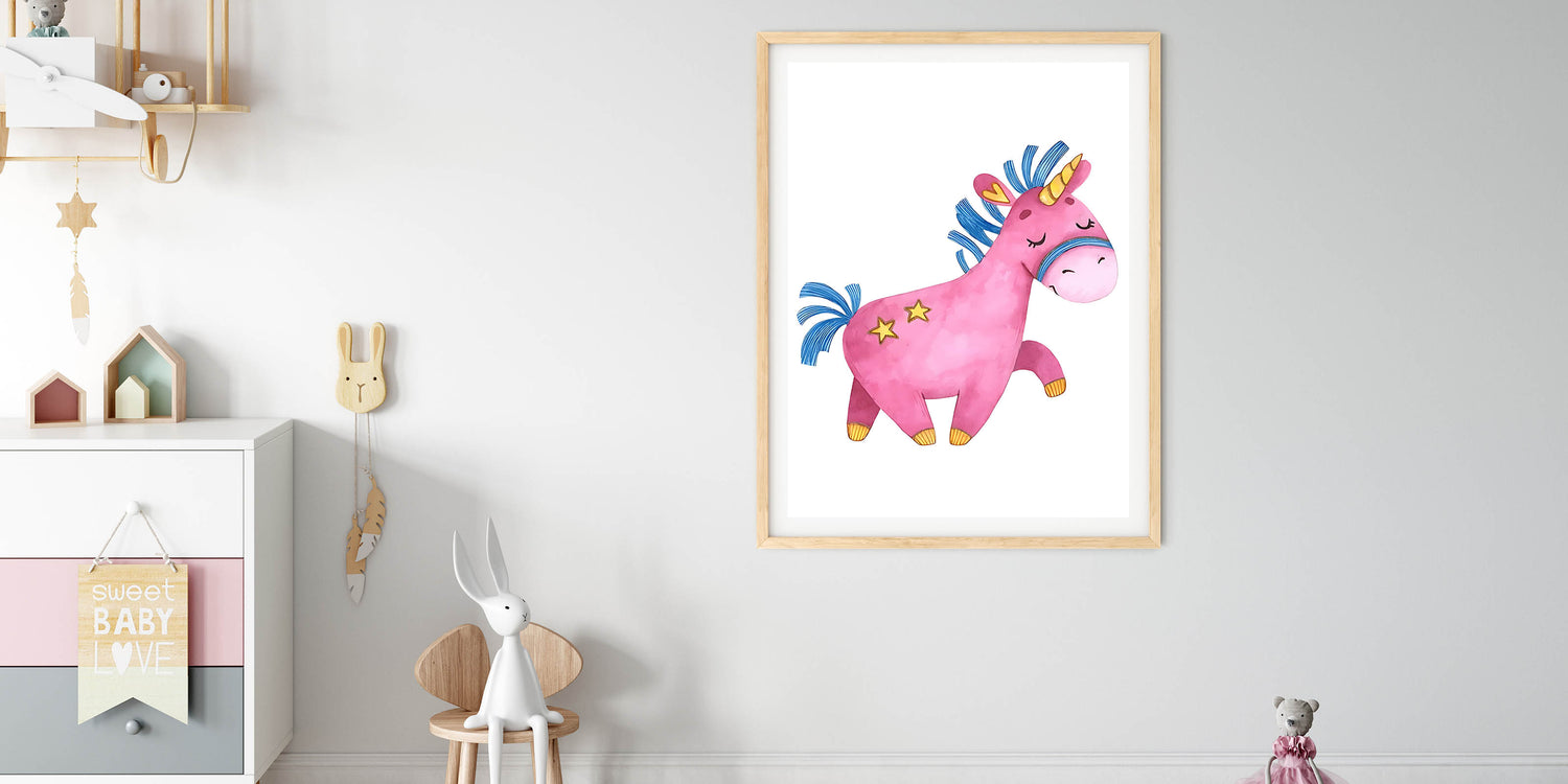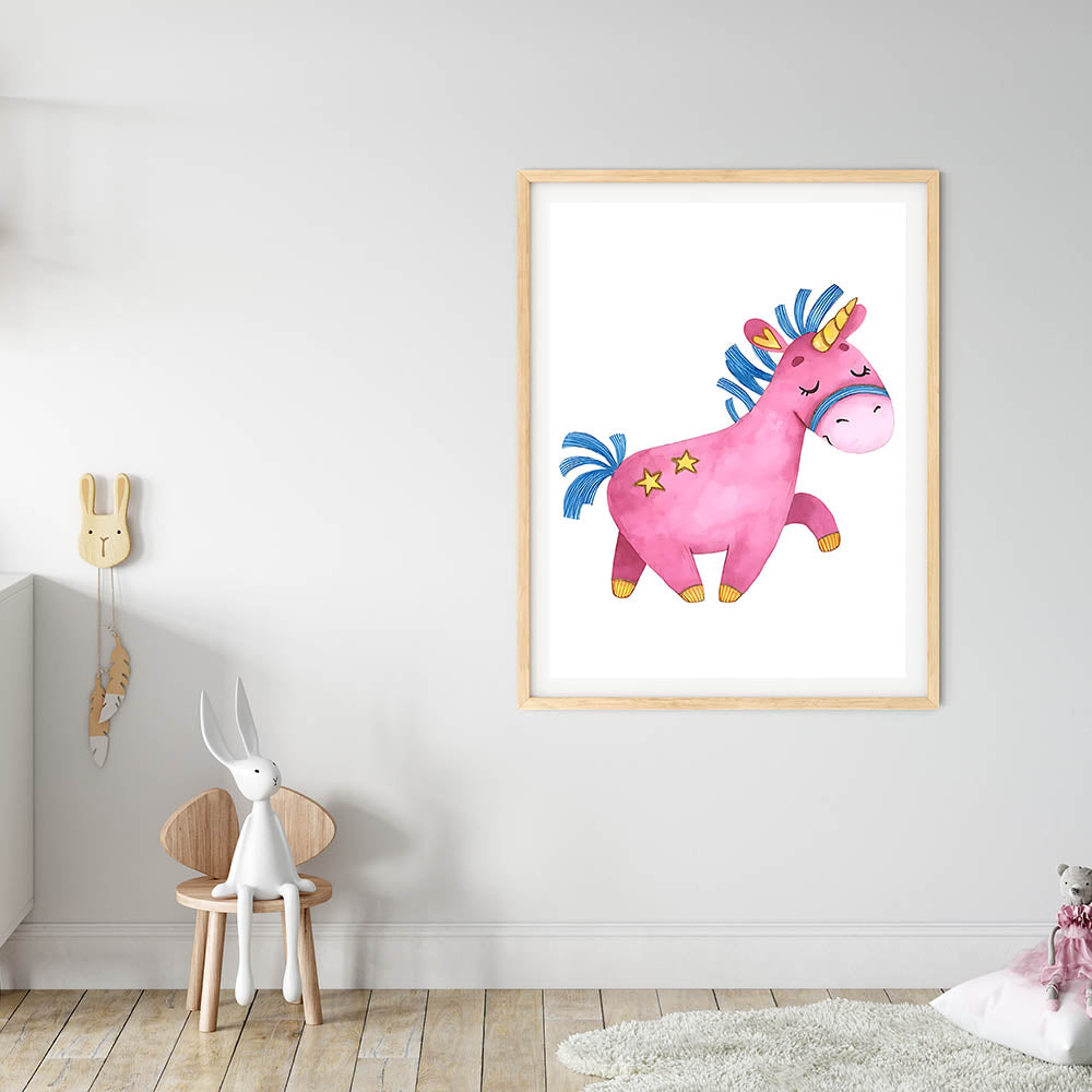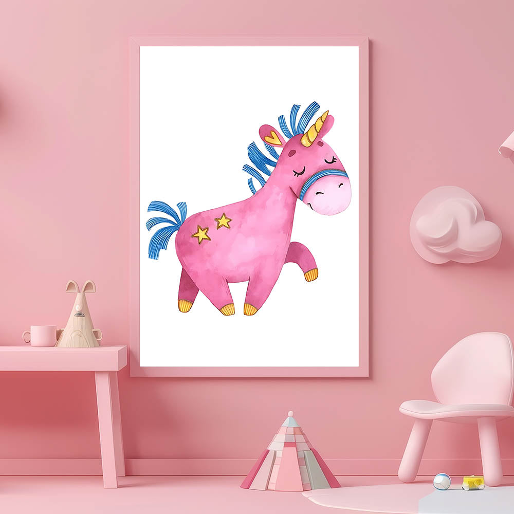 Bring a touch of magic and fantasy to your child's space with this adorable pink unicorn wall art. Featuring a playful pink unicorn with golden stars and a shimmering horn, this illustration is perfect for creating a whimsical and dreamy atmosphere in a girls' bedroom, nursery, or playroom. The combination of vivid pink, royal blue, and gold accents adds a cheerful and imaginative feel to any room.