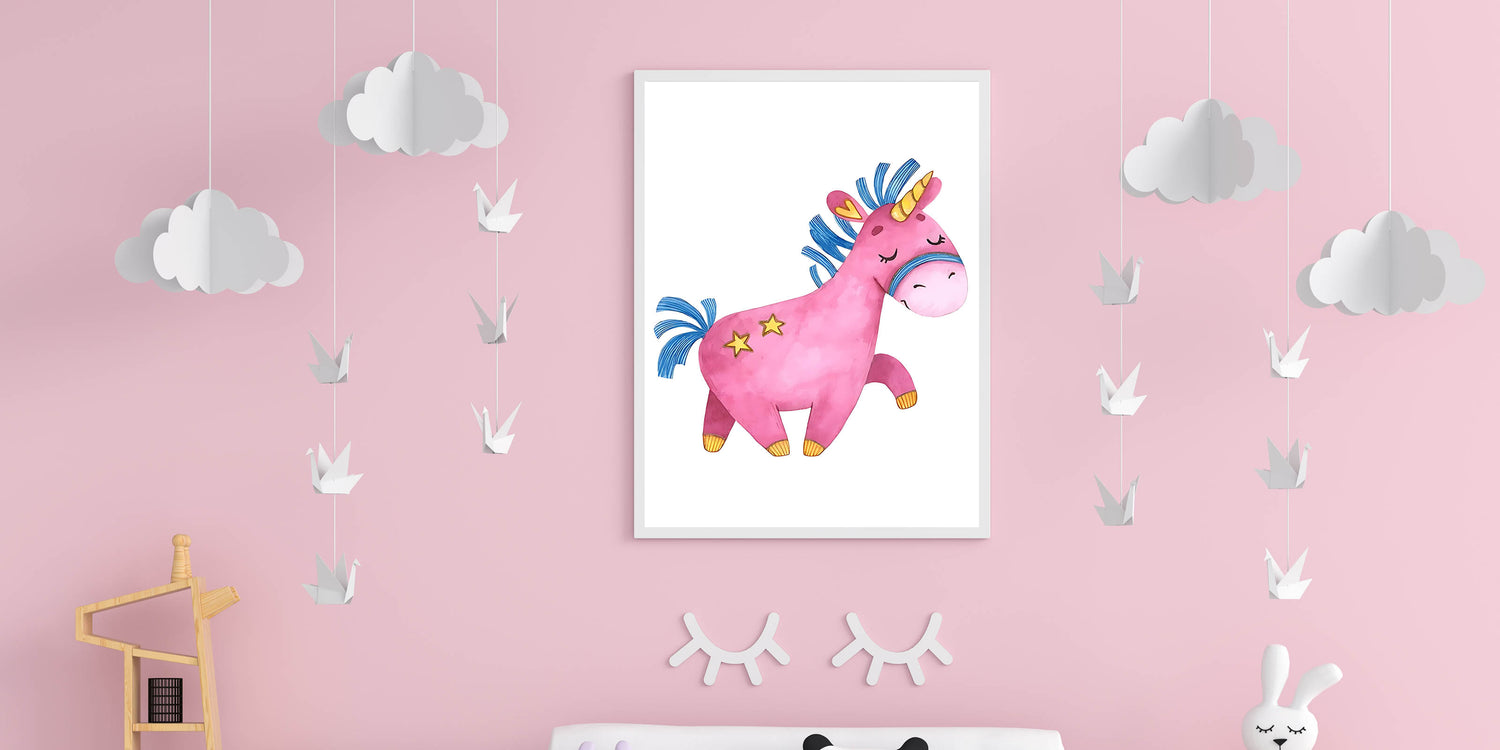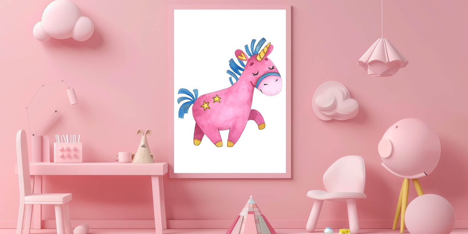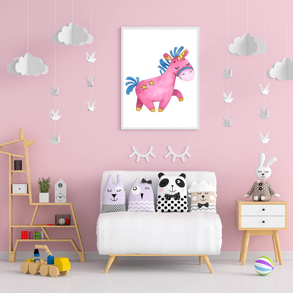 Bring a touch of magic and fantasy to your child's space with this adorable pink unicorn wall art. Featuring a playful pink unicorn with golden stars and a shimmering horn, this illustration is perfect for creating a whimsical and dreamy atmosphere in a girls' bedroom, nursery, or playroom. The combination of vivid pink, royal blue, and gold accents adds a cheerful and imaginative feel to any room.
