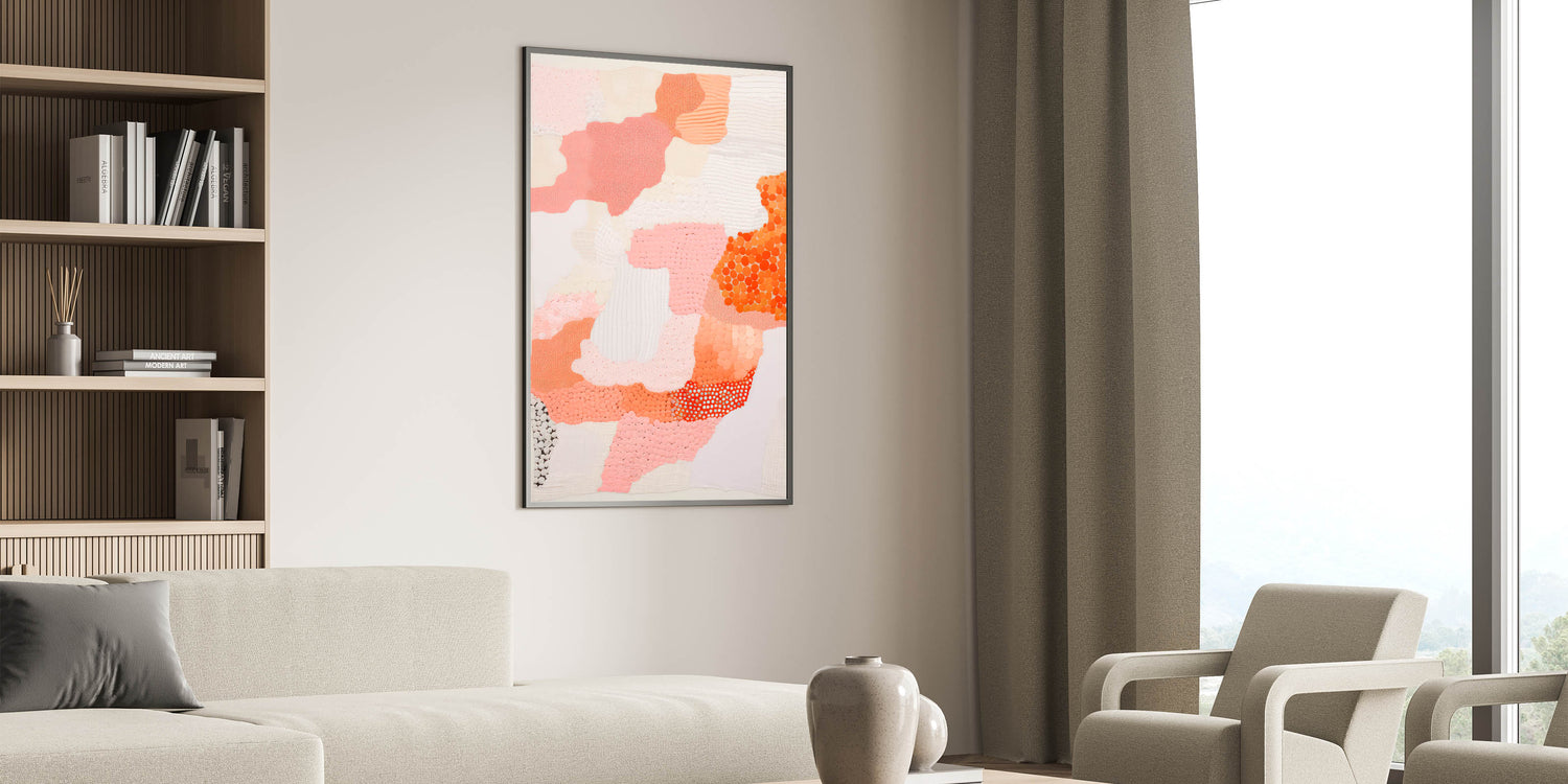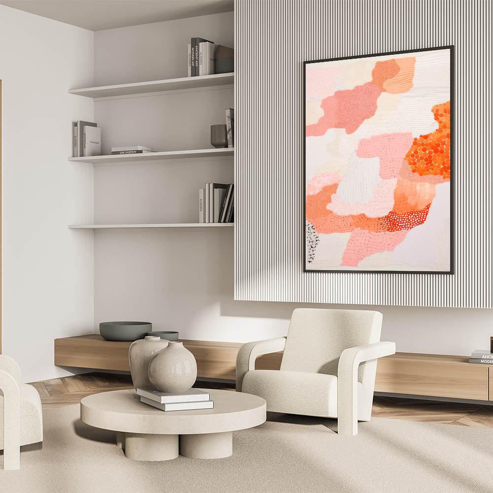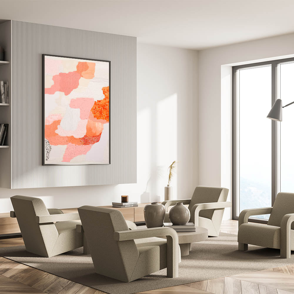 Add a touch of vibrant maximalism to your space with this abstract wall art, featuring textured patterns in warm pink, peach, and orange tones. The artwork’s dynamic design showcases a blend of bold colors and intricate details, creating a visually stimulating piece that makes a statement in any room. Perfect for eclectic and expressive home decor, this piece is ideal for living areas, bedrooms, or creative studios. The textured appearance adds depth and interest, making it a unique focal point that brings personality and energy to your interior.