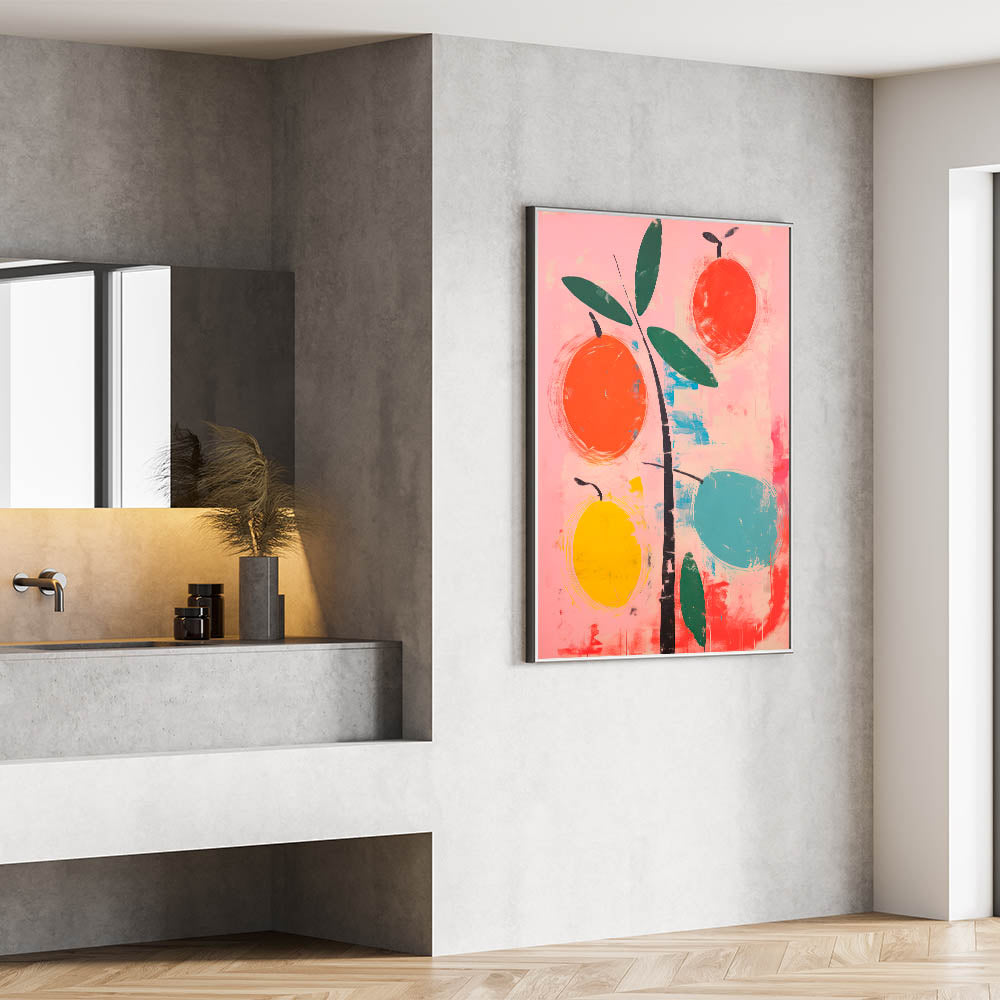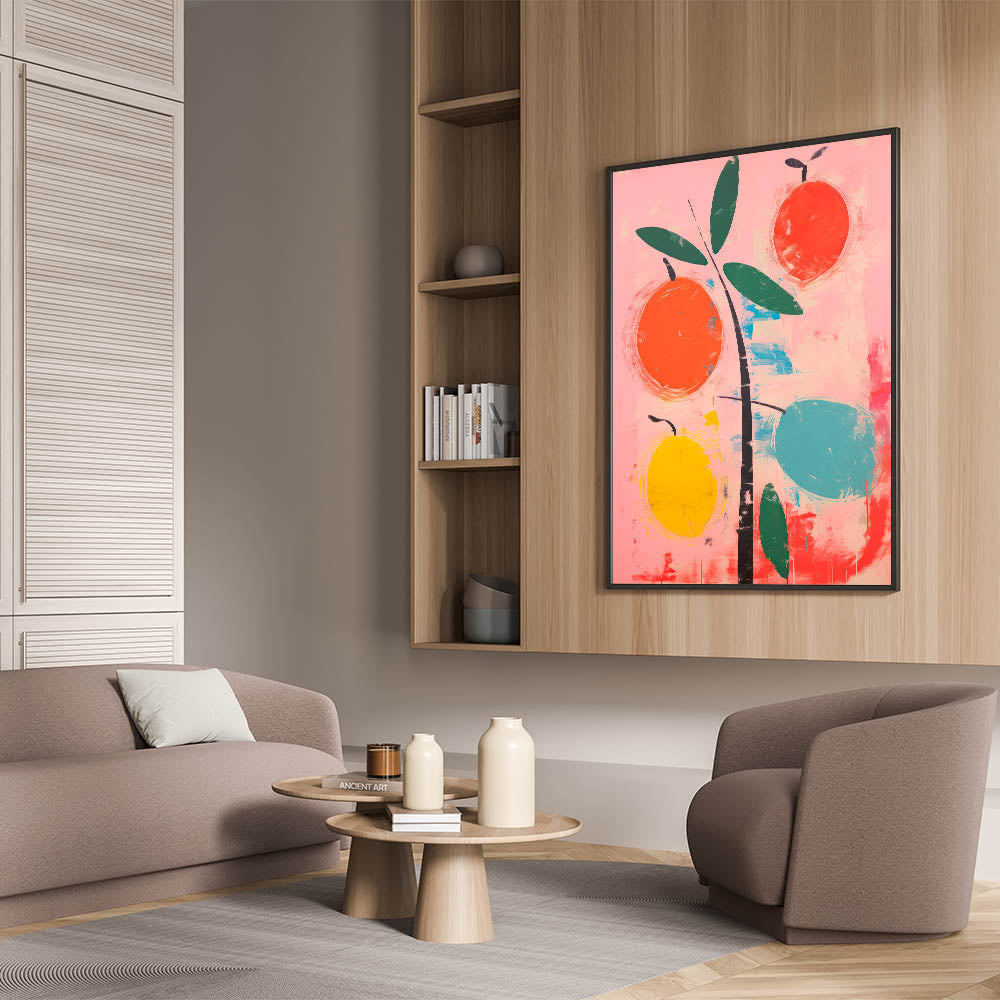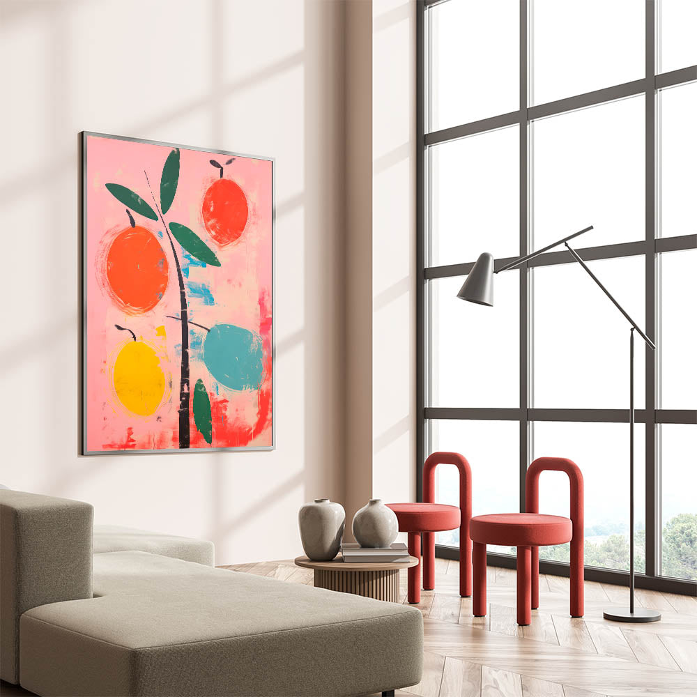 Bring a playful and bold touch to your home decor with this vibrant maximalist wall art. The artwork features an abstract composition of brightly colored fruits—orange, yellow, and teal—against a striking pink background. The dynamic contrast of these oversized fruit shapes and deep green leaves creates a visually captivating piece of statement wall art that adds life and personality to any room.