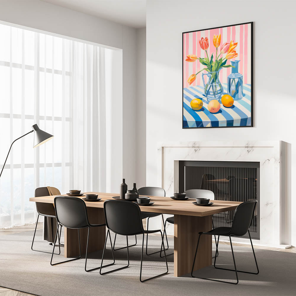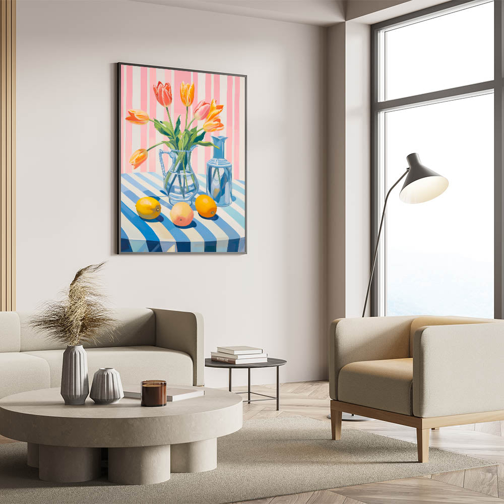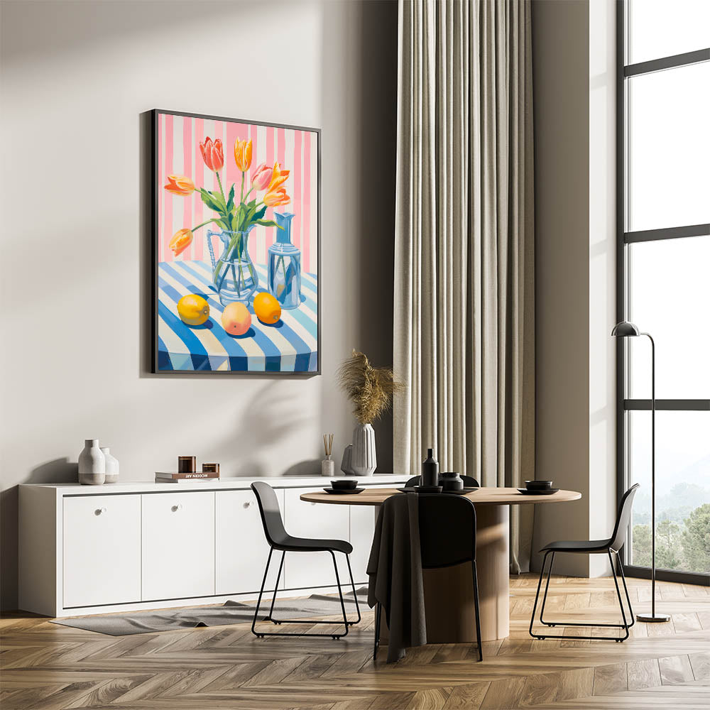 Brighten up your space with this stunning Maximalist wall art featuring a vibrant blend of floral and still-life elements. The artwork presents a beautiful arrangement of tulips in vivid orange, pink, and yellow tones, set against a striped pink and white background. The glass vase and the lemons on the striped blue and white tablecloth add a refreshing and dynamic visual appeal, making this piece a perfect addition to any maximalist or eclectic decor style.