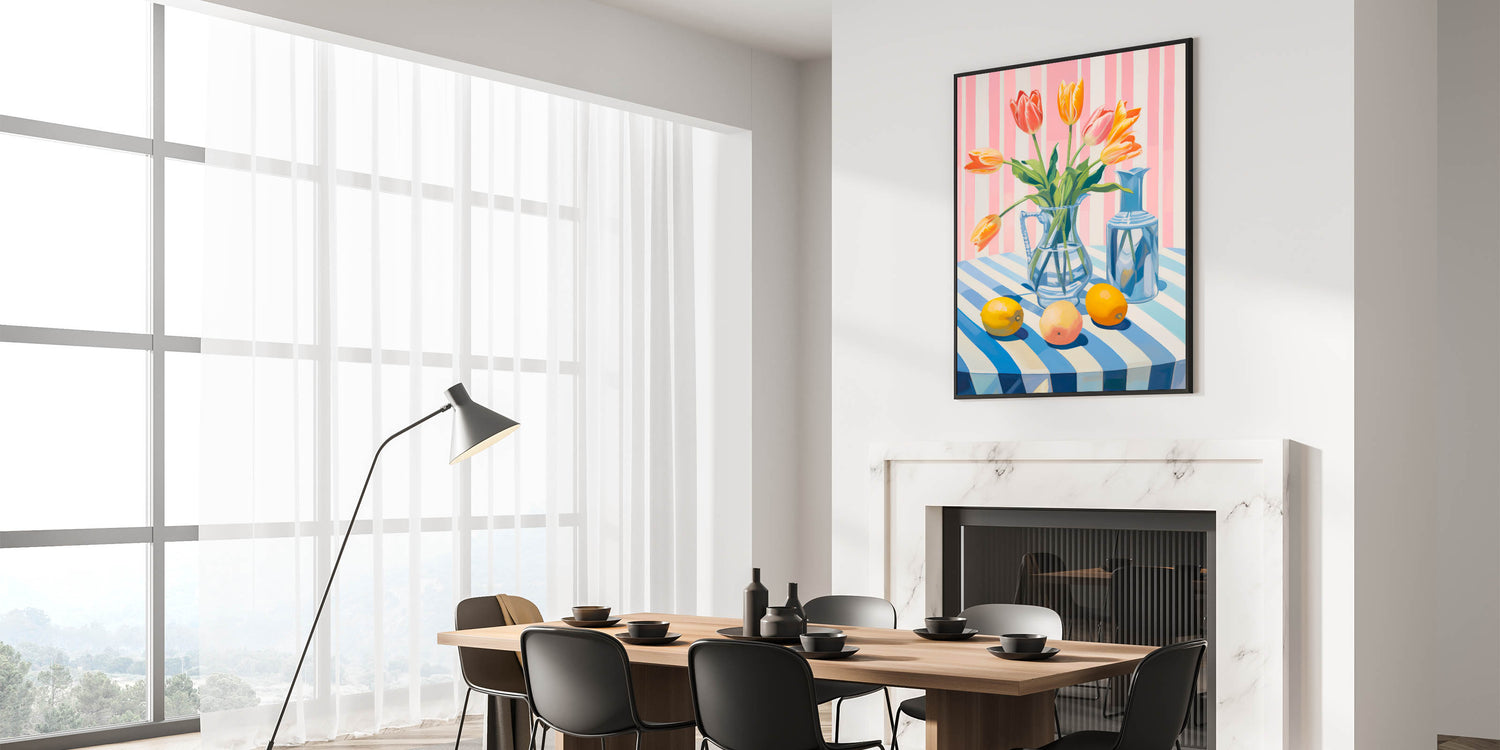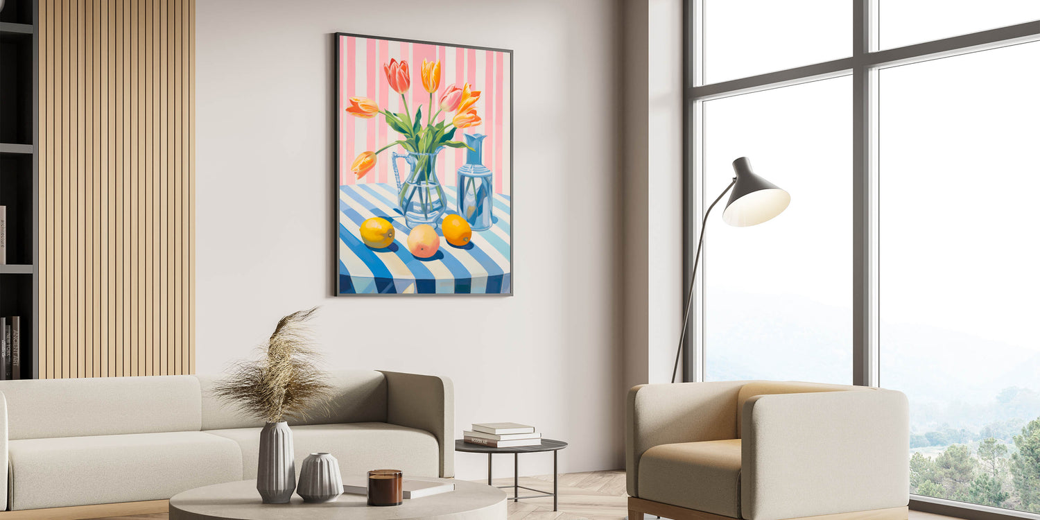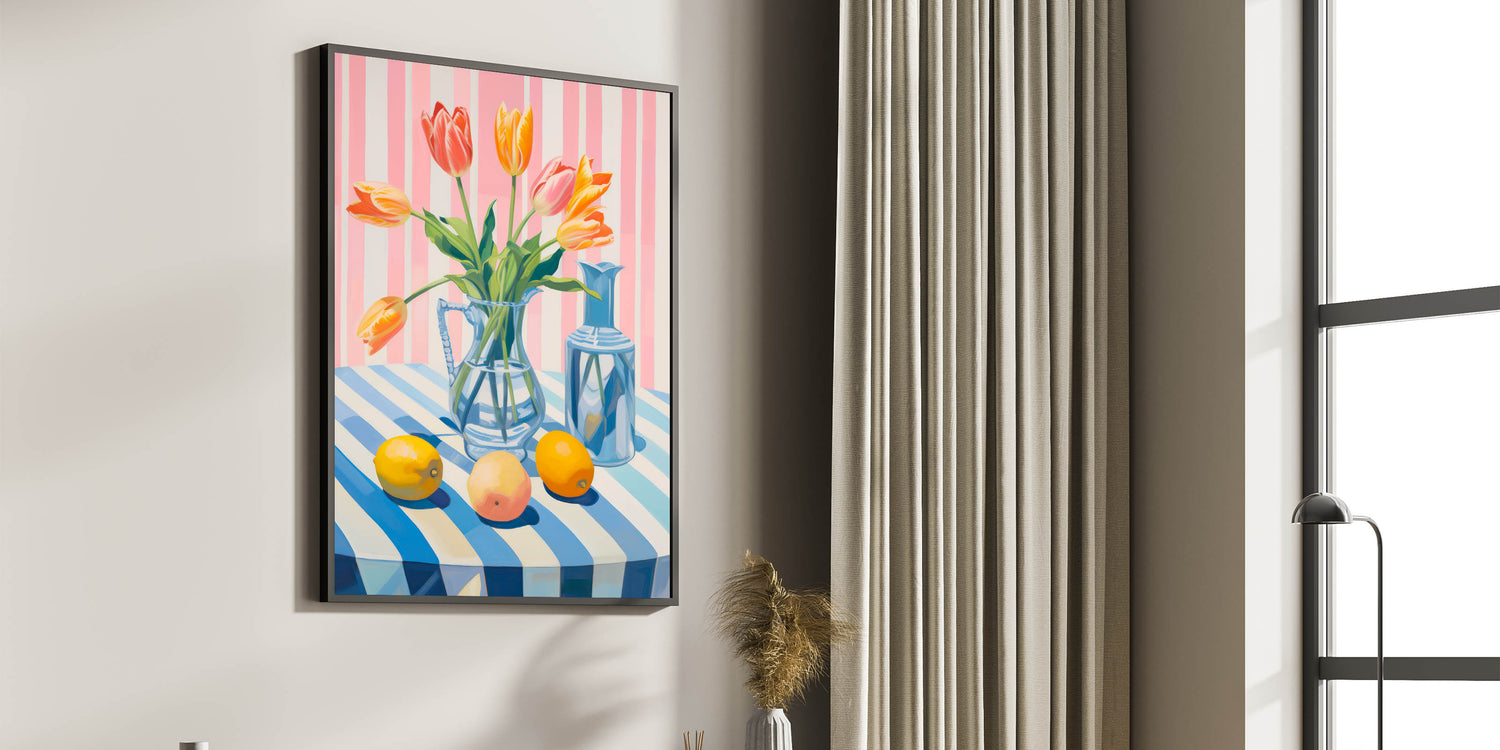 Brighten up your space with this stunning Maximalist wall art featuring a vibrant blend of floral and still-life elements. The artwork presents a beautiful arrangement of tulips in vivid orange, pink, and yellow tones, set against a striped pink and white background. The glass vase and the lemons on the striped blue and white tablecloth add a refreshing and dynamic visual appeal, making this piece a perfect addition to any maximalist or eclectic decor style.