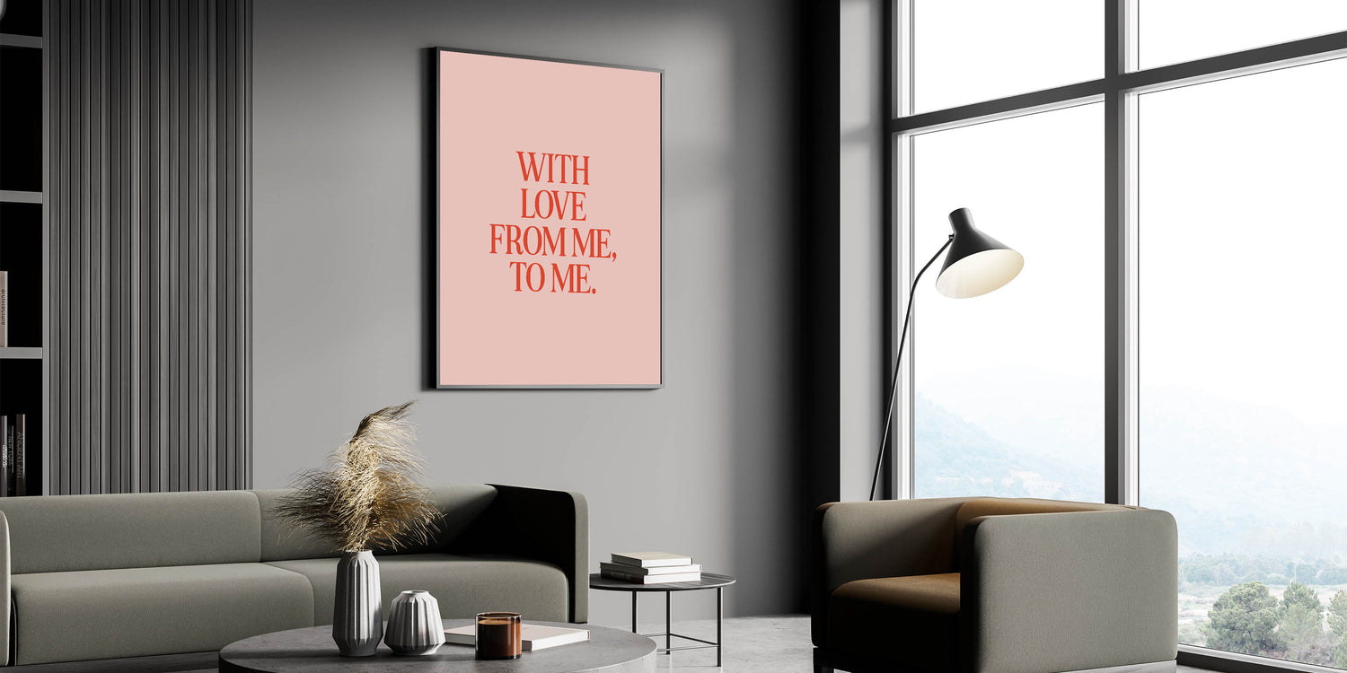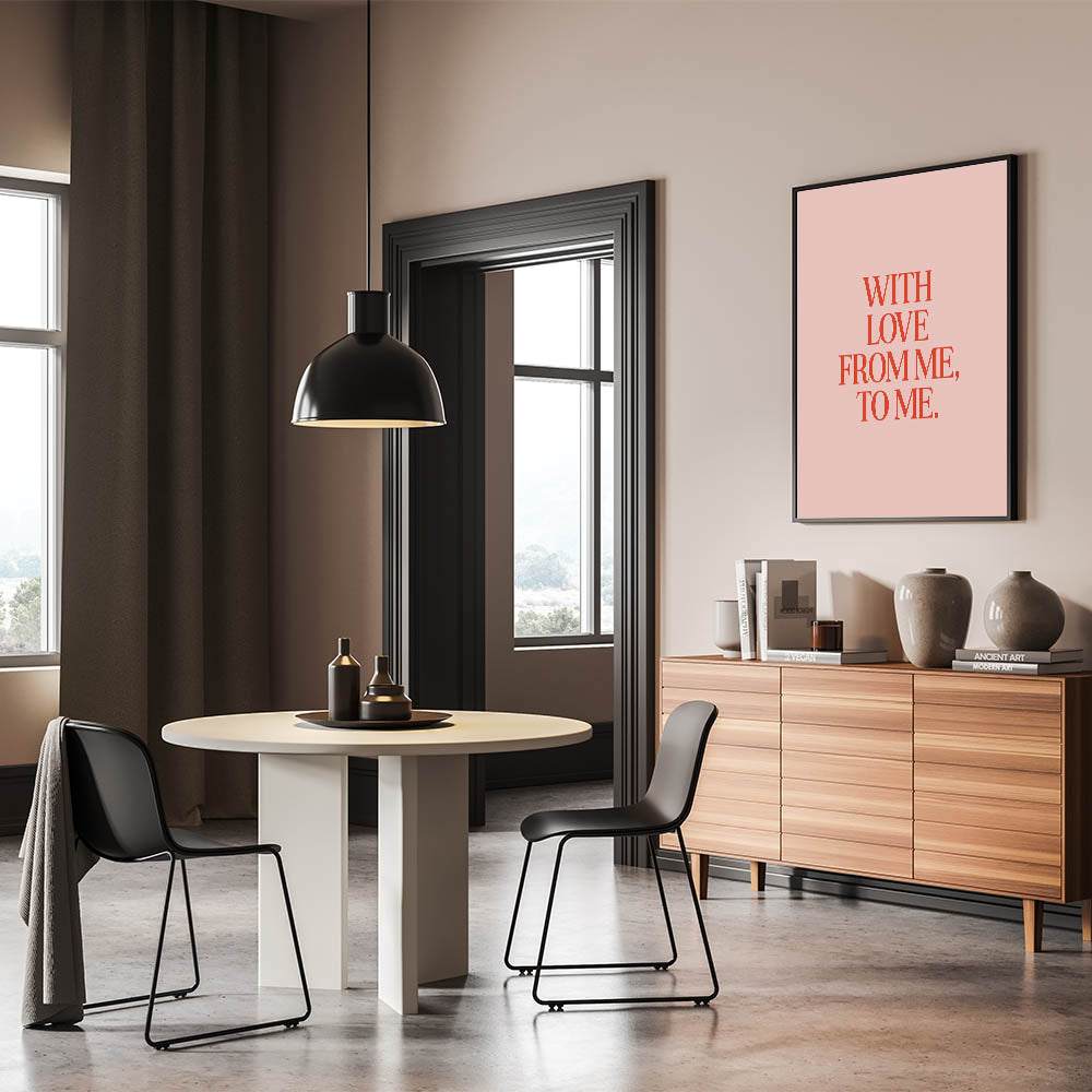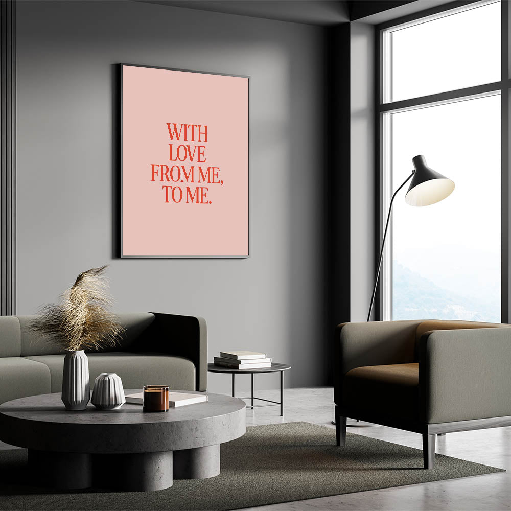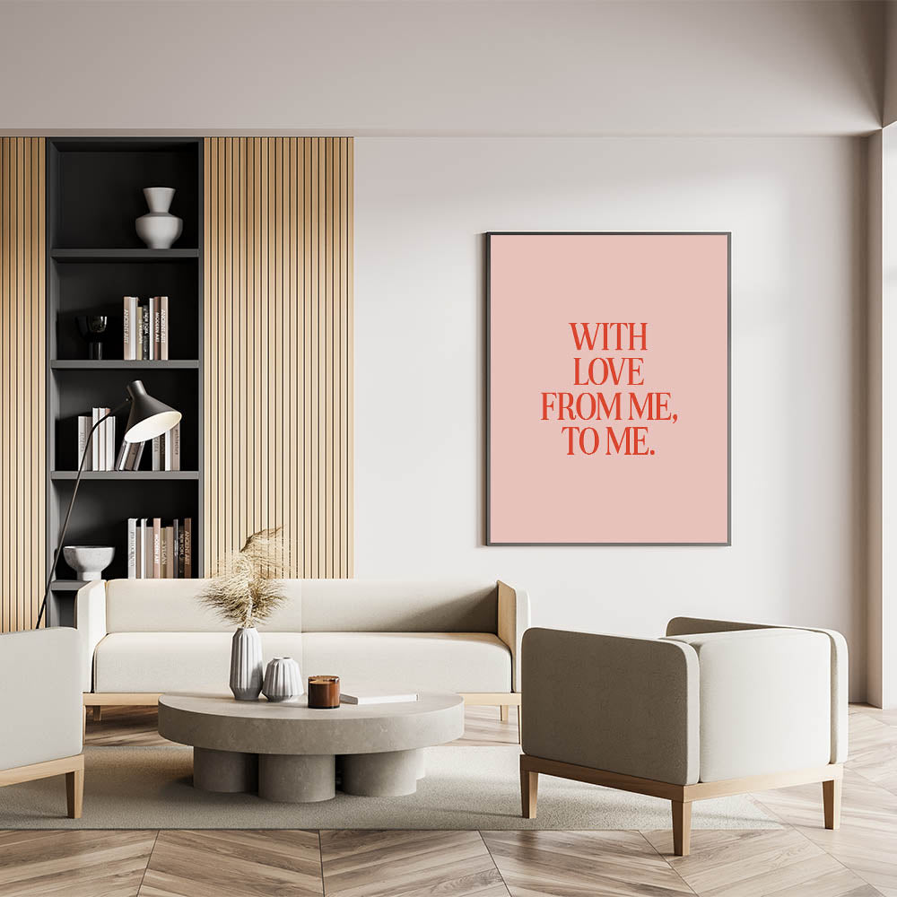 Celebrate self-love and positivity with this Maximalist Wall Art, featuring the heartfelt quote: "With love from me, to me." The bold red typography against a soft pink background creates a striking yet tender composition that adds warmth and charm to any space. Ideal for those who appreciate unique and empowering decor, this piece is perfect for living rooms, bedrooms, or personal sanctuaries, where it can inspire daily affirmations and self-care.