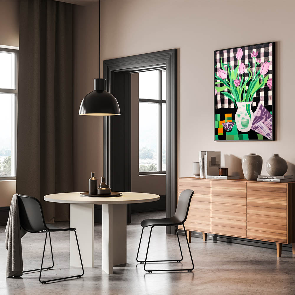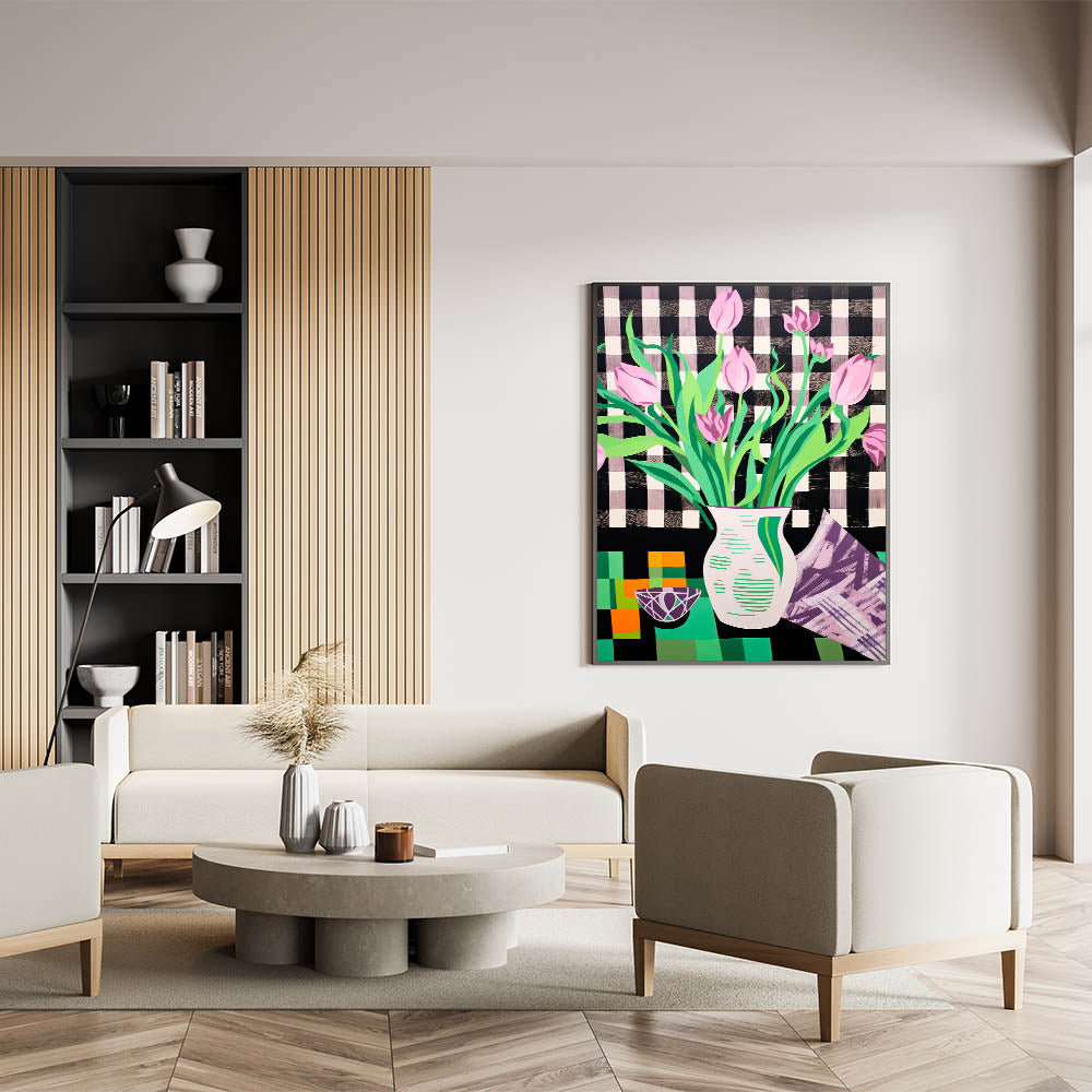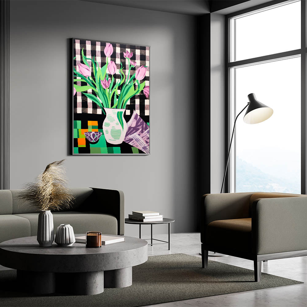 Add a bold and dynamic touch to your home with this vibrant maximalist wall art. Featuring striking pink tulips against a bold black-and-white checkered background, the artwork creates a captivating contrast. The vivid green foliage and playful geometric shapes in the foreground further enhance the eclectic and dynamic composition, making it a perfect statement piece for any maximalist decor.