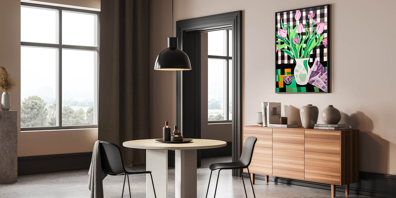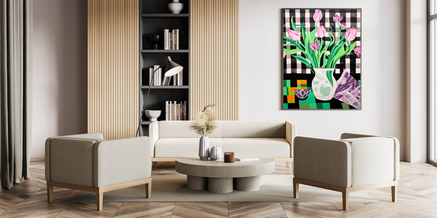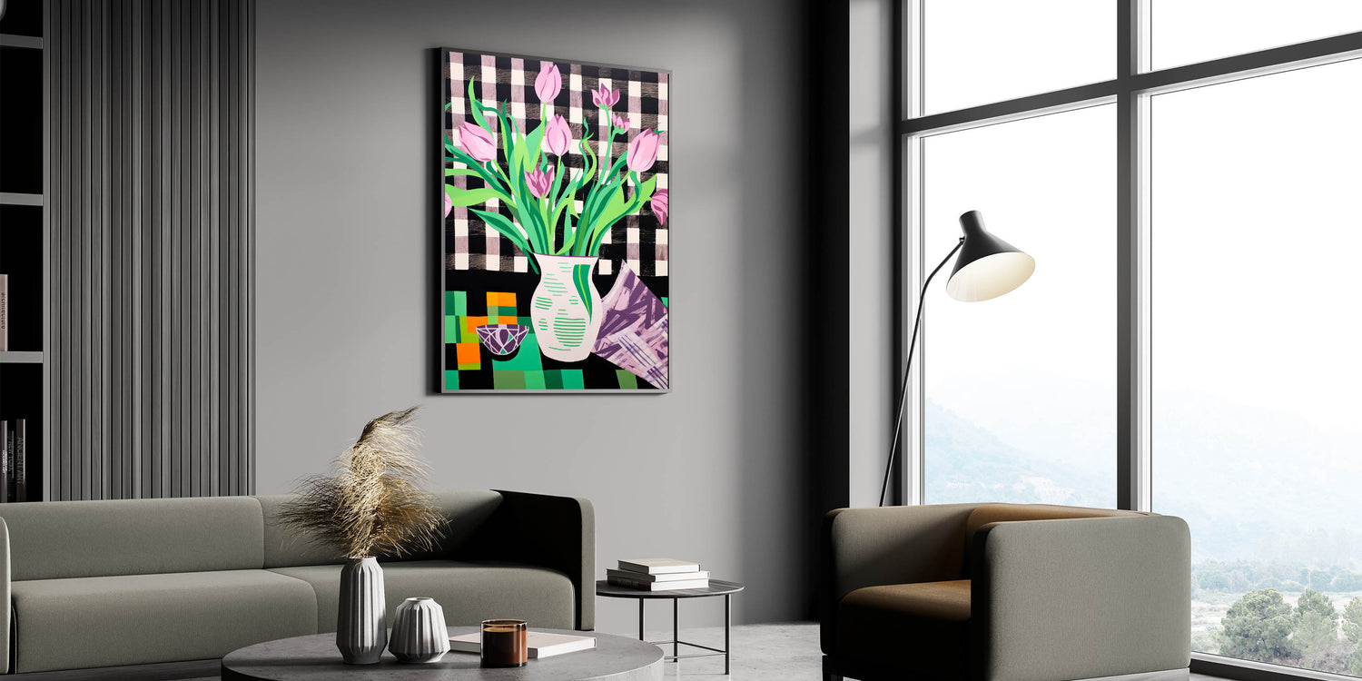 Maximalist Wall Art: Bold Tulips with Checkered Background – Eclectic Decor