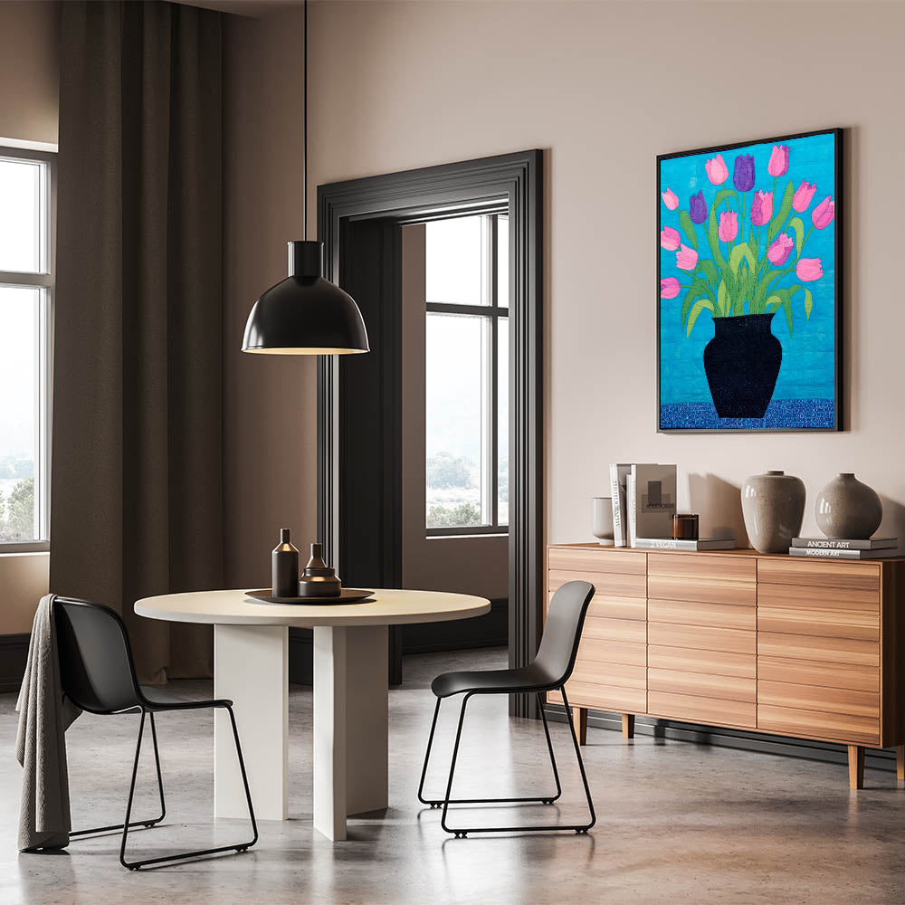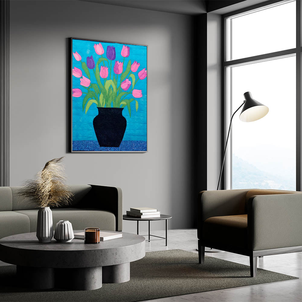 Maximalist Wall Art - Vibrant Tulips in Black Vase with Bold Blue Background