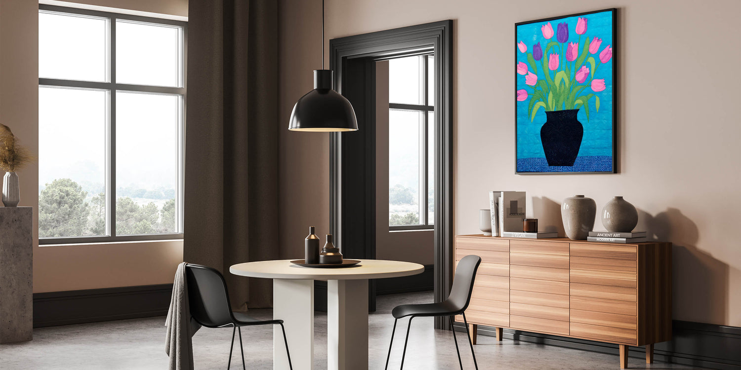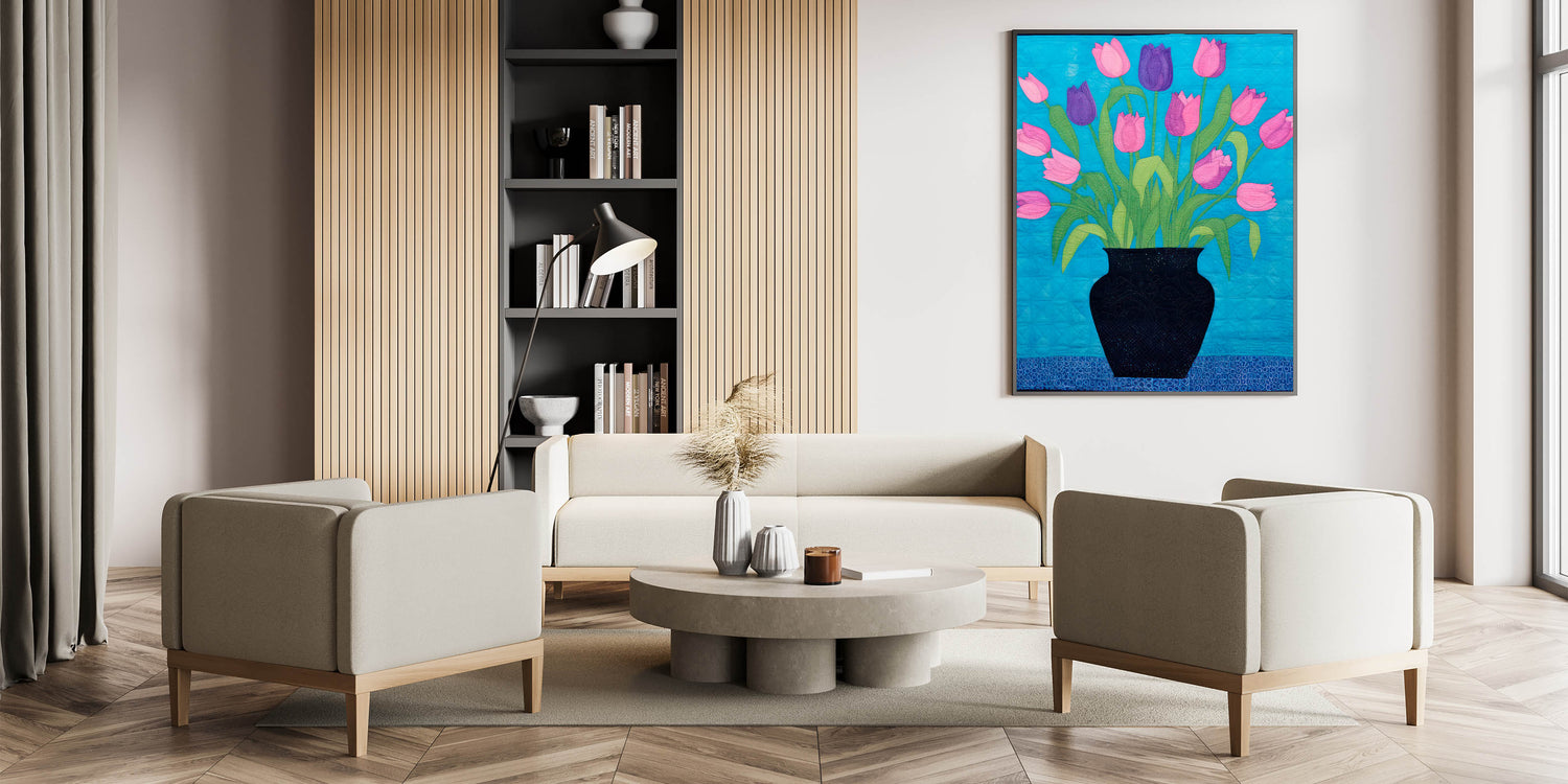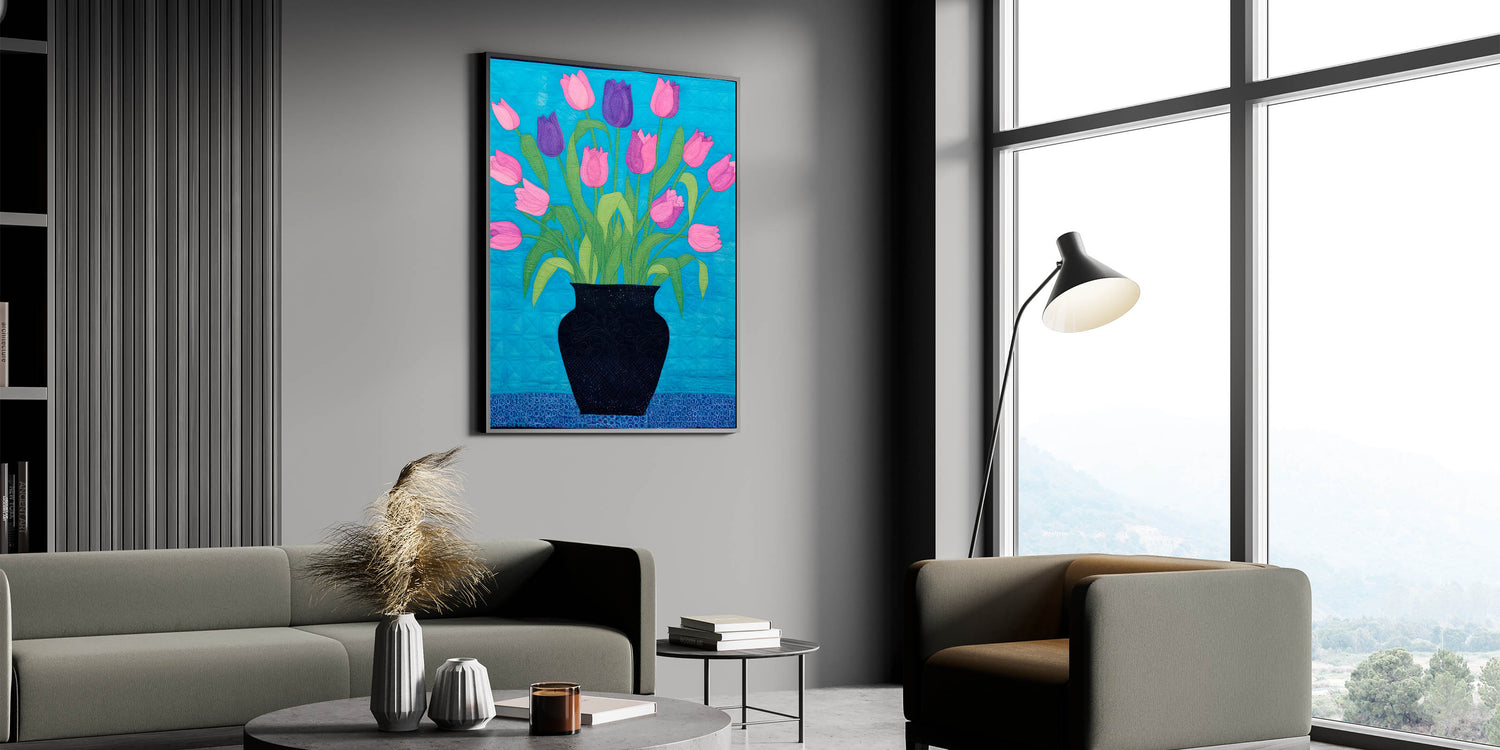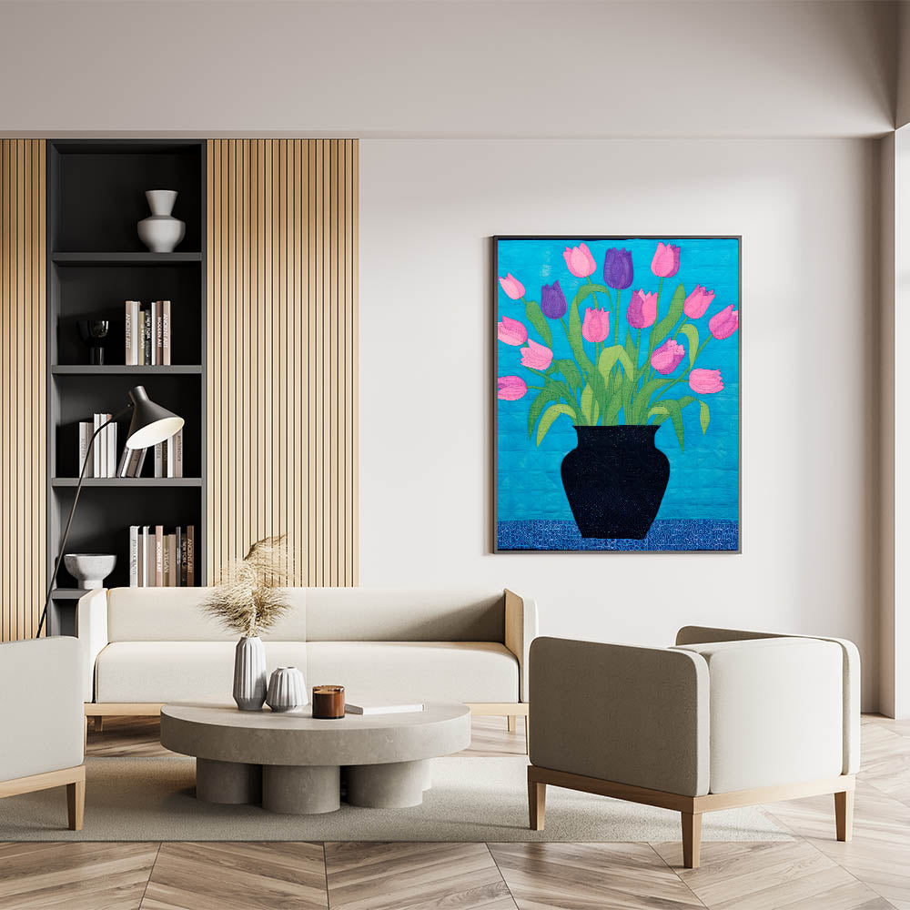 Add a lively touch to your decor with this vibrant maximalist wall art featuring a bouquet of pink and purple tulips in a bold black vase. The colorful composition is set against a bright blue background, creating a striking contrast that catches the eye. The artistic quilt-like texture adds depth and a unique touch to the design, making it perfect for living spaces, bedrooms, or creative studios where you want to bring in a pop of color and eclectic charm.