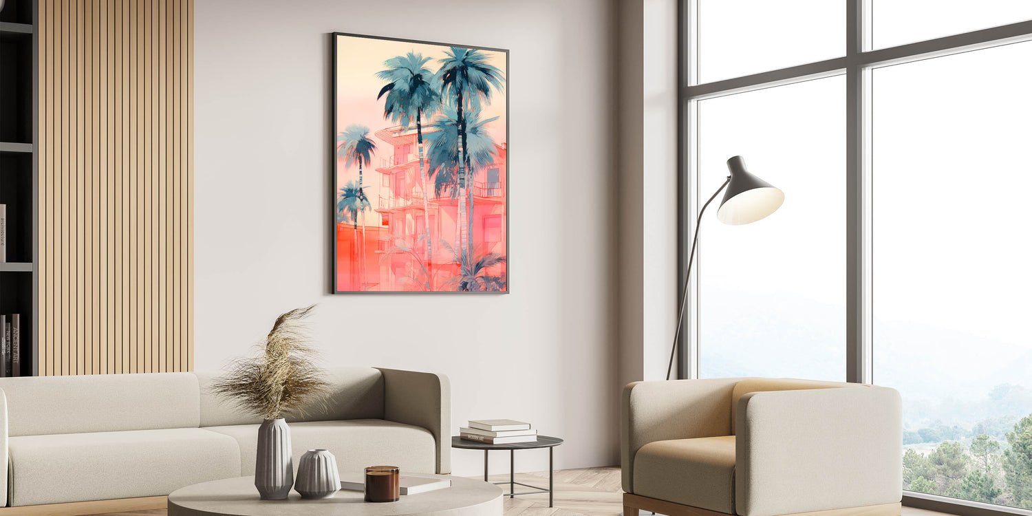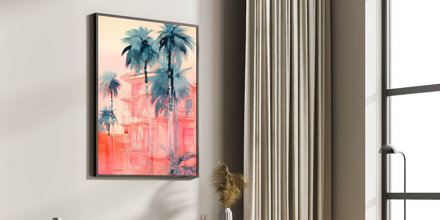 Capture the essence of a tropical urban escape with this stunning maximalist wall art. Featuring a vibrant scene of palm trees set against a modern architectural backdrop, this artwork exudes warmth with its sunset-inspired pinks and cool blue-green tones. The layering of colors adds depth and creates a dreamy atmosphere, making it perfect for those who love bold decor. Ideal for living rooms, bedrooms, or creative spaces, this piece brings a touch of tropical elegance to any interior.