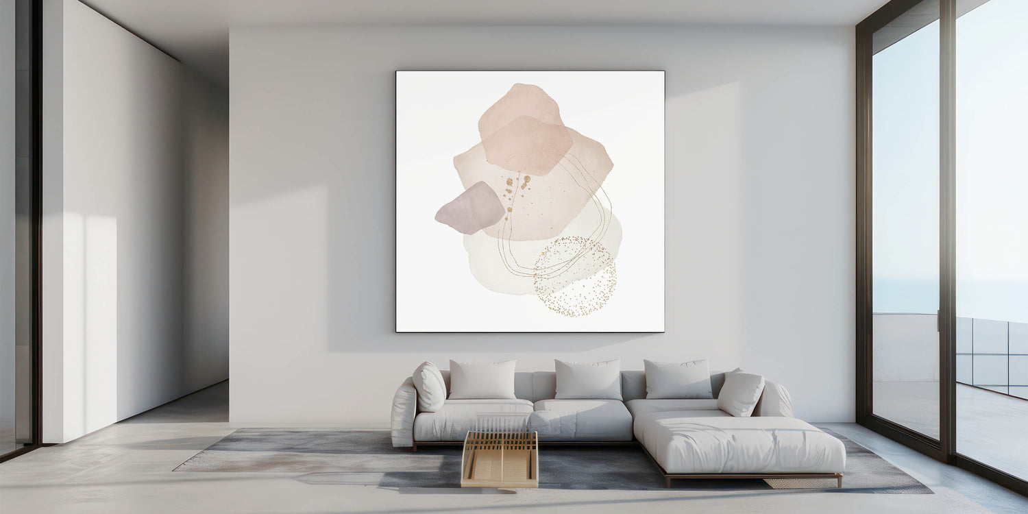 Add a soft, serene touch to your home with this elegant geometric minimalist abstract wall art. Featuring gentle layers of blush pink, beige, and cream tones with delicate golden detailing, this artwork embodies calm, balance, and sophistication. The flowing lines and dotted textures create visual interest while maintaining a minimalist, airy aesthetic.