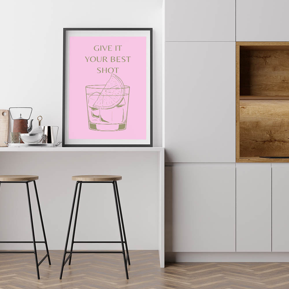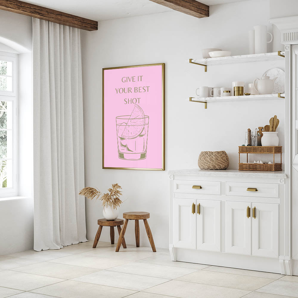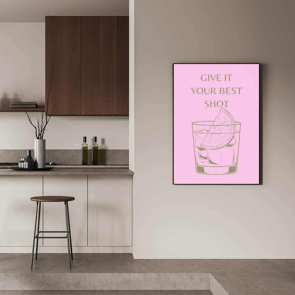 Elevate your home bar or kitchen with this modern cocktail wall art, featuring a sleek line drawing of a drink garnished with citrus and the motivational quote, "Give It Your Best Shot." The soft pink background and elegant design add a touch of sophistication, making it a perfect beverage wall art piece for bars, lounges, and kitchens.