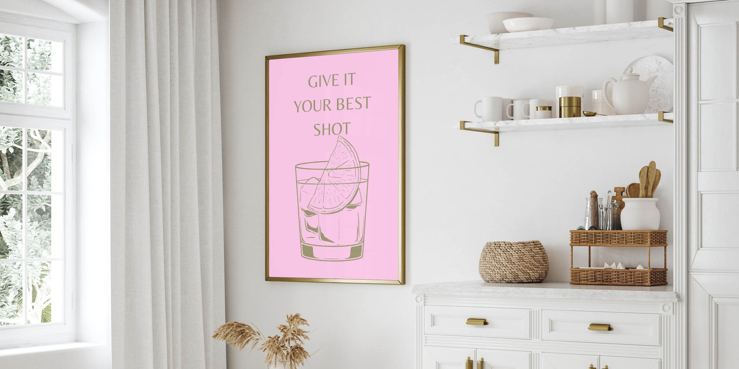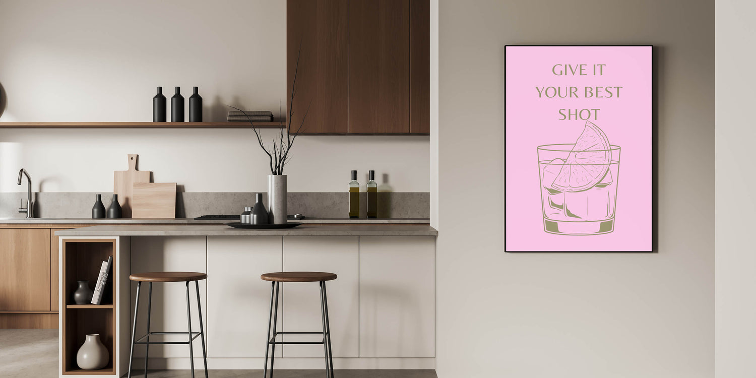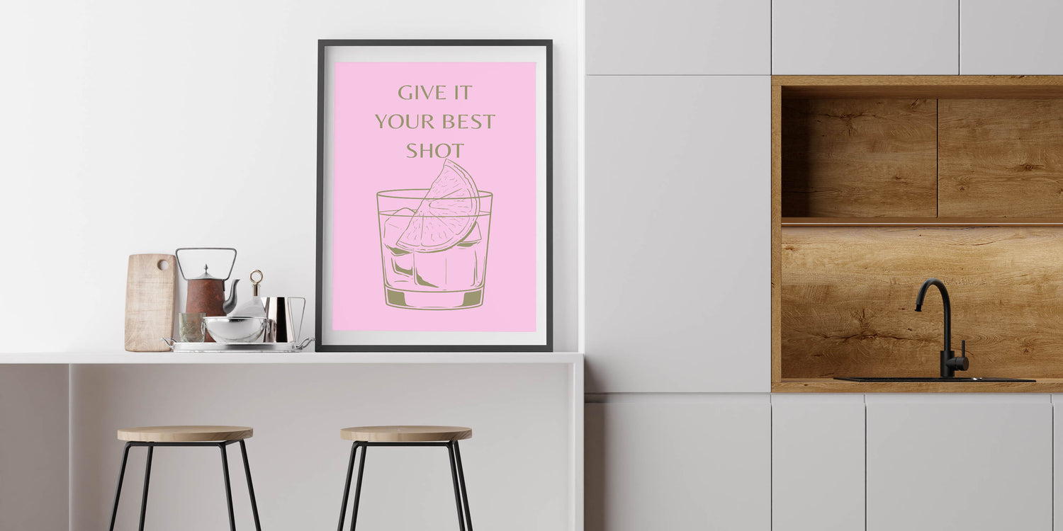 Elevate your home bar or kitchen with this modern cocktail wall art, featuring a sleek line drawing of a drink garnished with citrus and the motivational quote, "Give It Your Best Shot." The soft pink background and elegant design add a touch of sophistication, making it a perfect beverage wall art piece for bars, lounges, and kitchens.
