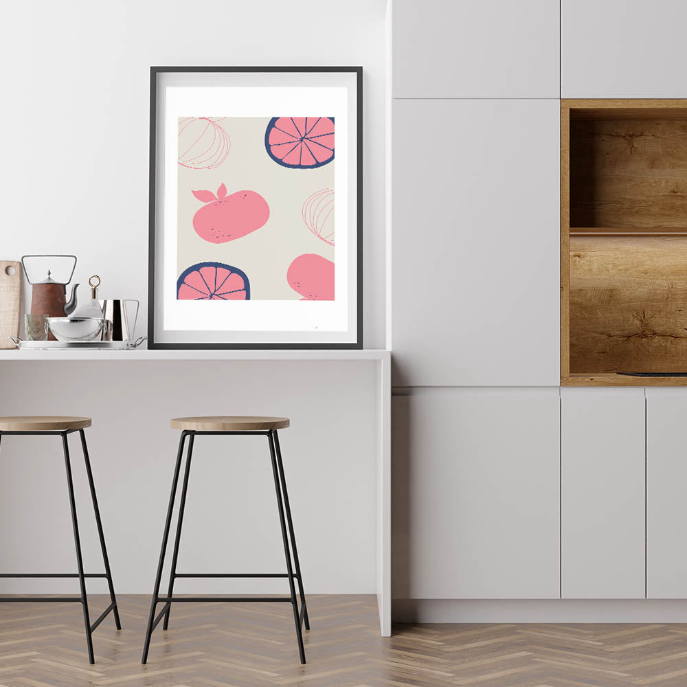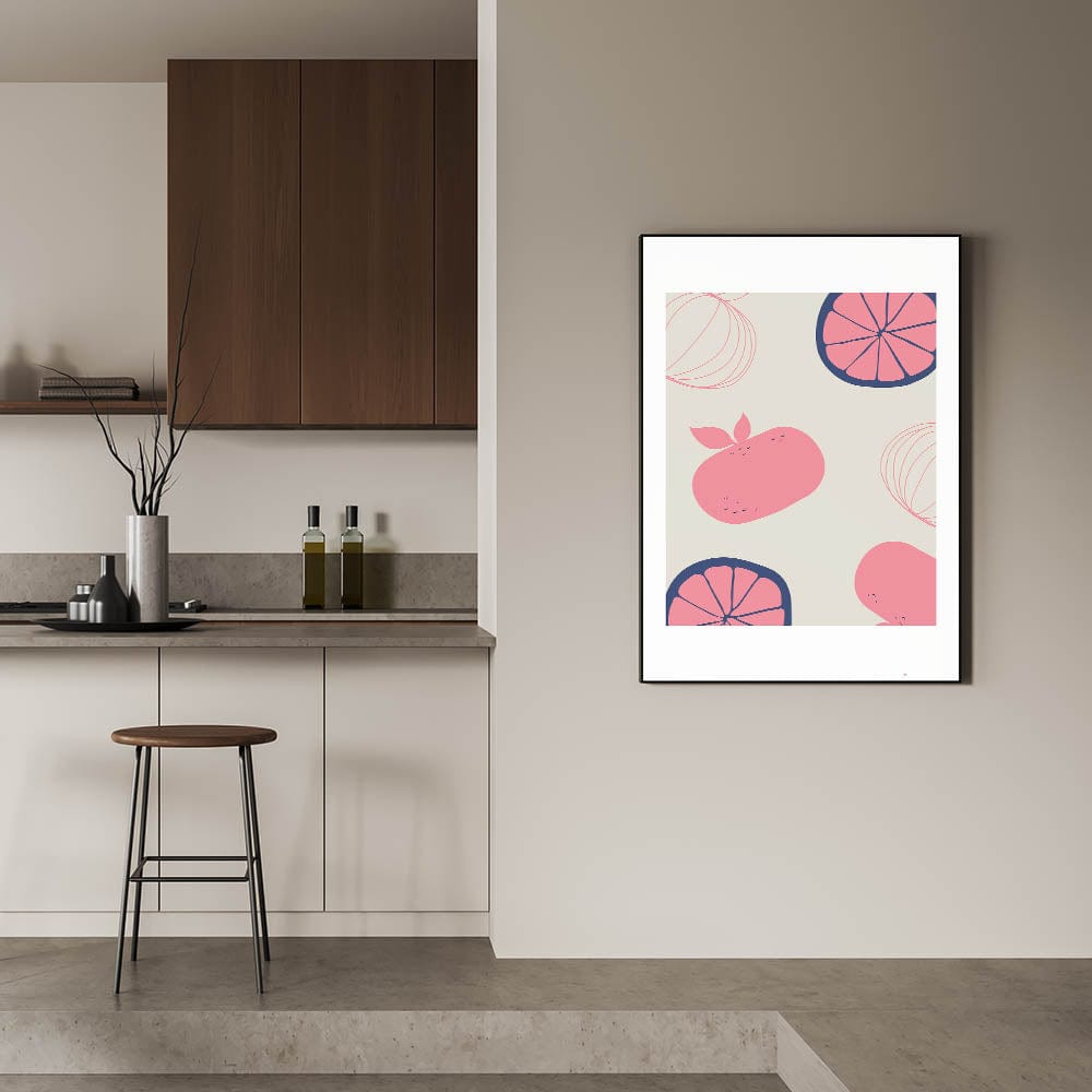 Add a touch of modern elegance to your space with this fruit-themed wall art, featuring a stylish and abstract mango and citrus pattern. The minimalist design blends soft beige tones with playful pink and deep navy, making it an eye-catching fruit illustration print for any contemporary home. Perfect for kitchen fruit decor, dining rooms, or modern art lovers who appreciate bold and artistic compositions.