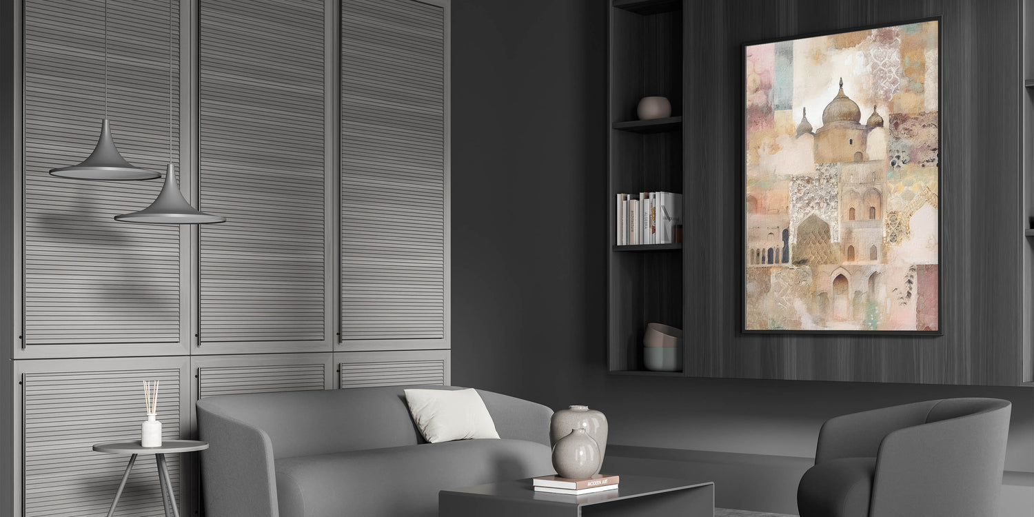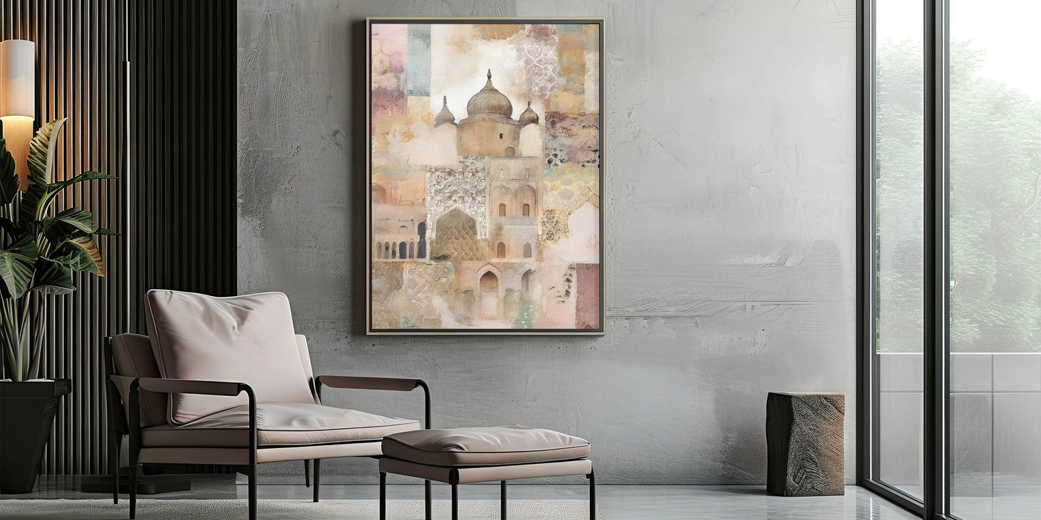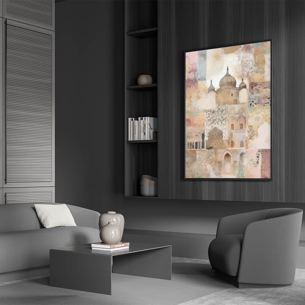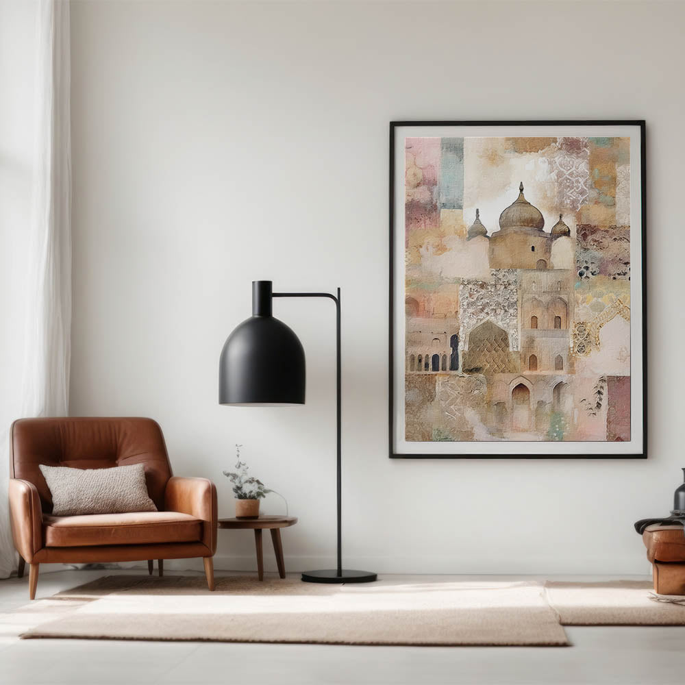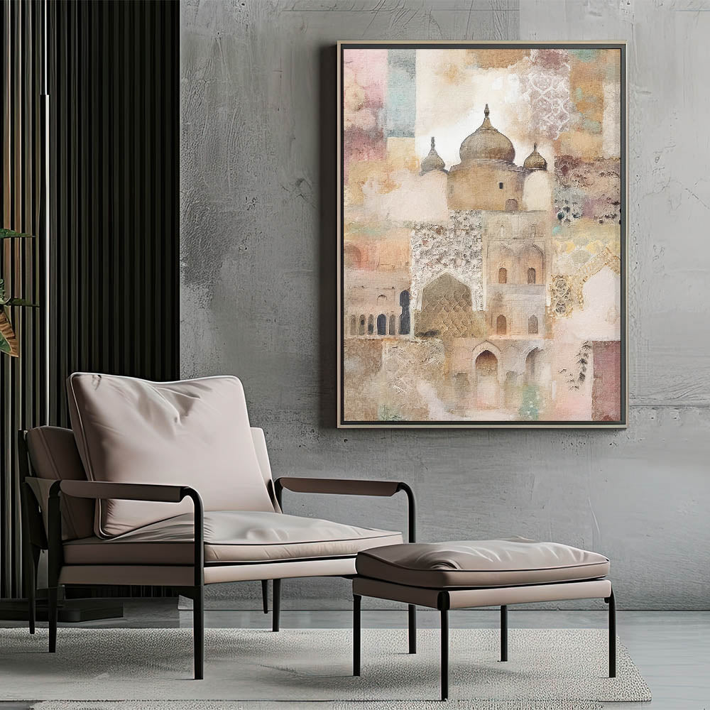 This ornate architectural abstract art piece brings the beauty of intricate craftsmanship into your home. Featuring delicate arches, lattice patterns, and faded textures, this artwork evokes the charm of historical architecture and decorative artistry. Rendered in soft, earthy tones with touches of pink and beige, this piece offers a timeless appeal that complements both modern and vintage-inspired interiors. Perfect for those who appreciate the fusion of history and abstract art, this design is versatile and available in multiple formats.