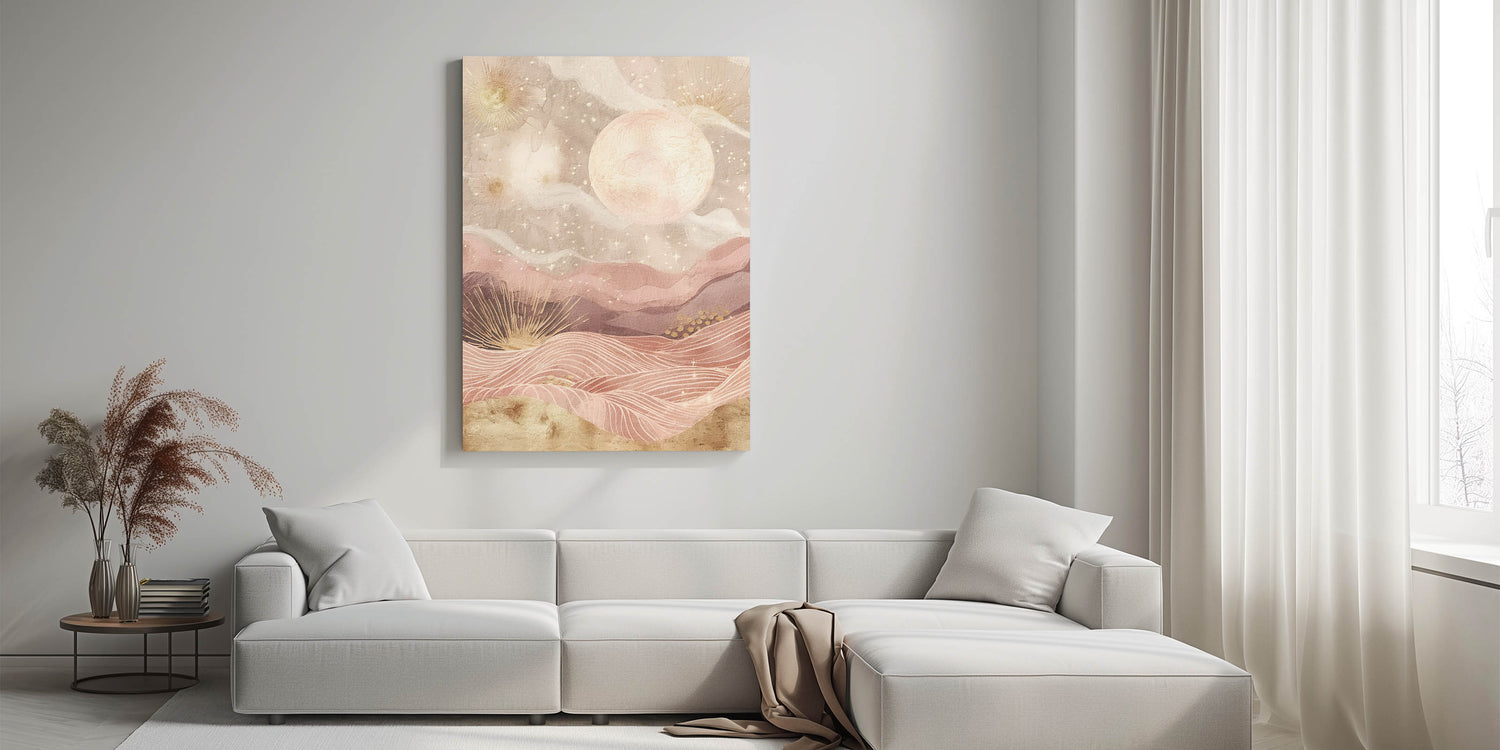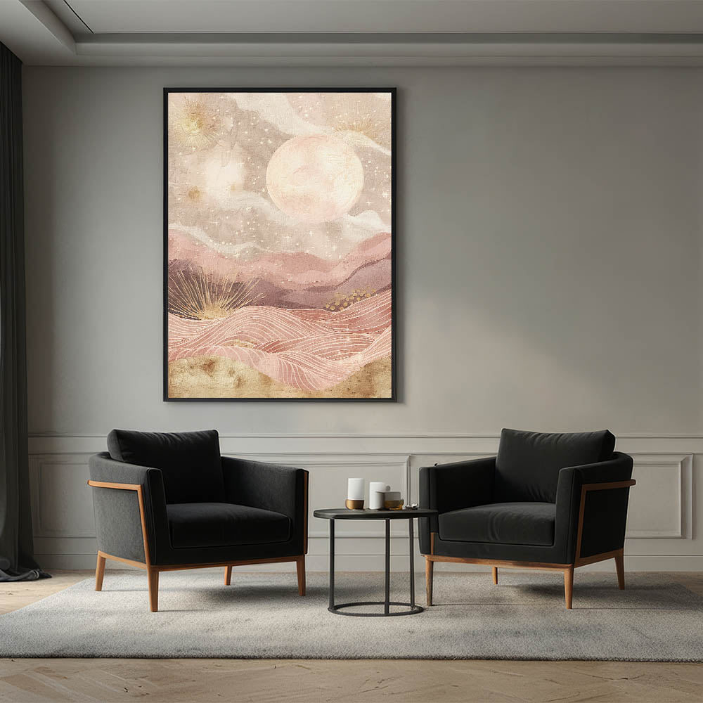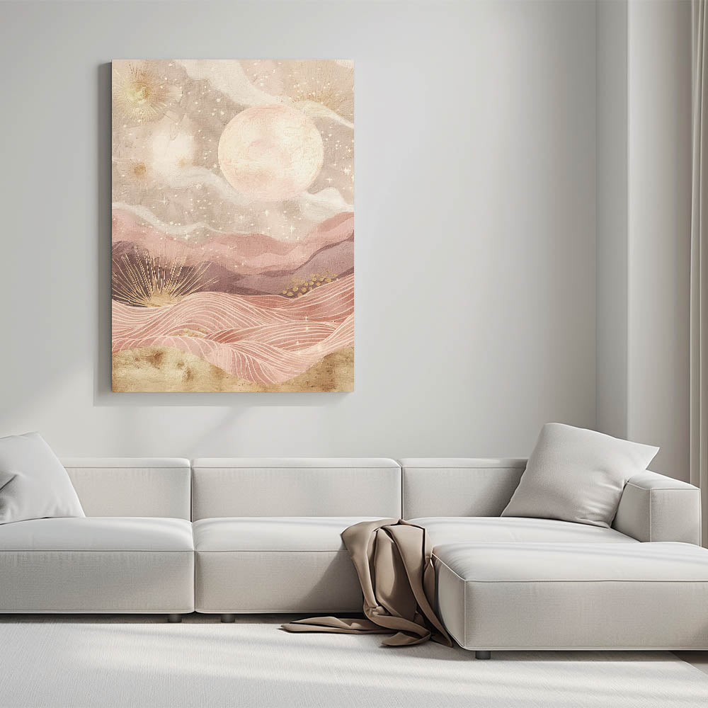 Introduce a captivating touch of elegance to your space with this modern abstract landscape art. This design blends soft pastels, shimmering gold, and fluid shapes to create an otherworldly scene of cosmic beauty. Ideal for those seeking unique landscape art prints, this piece adds a touch of sophistication to any room decor.