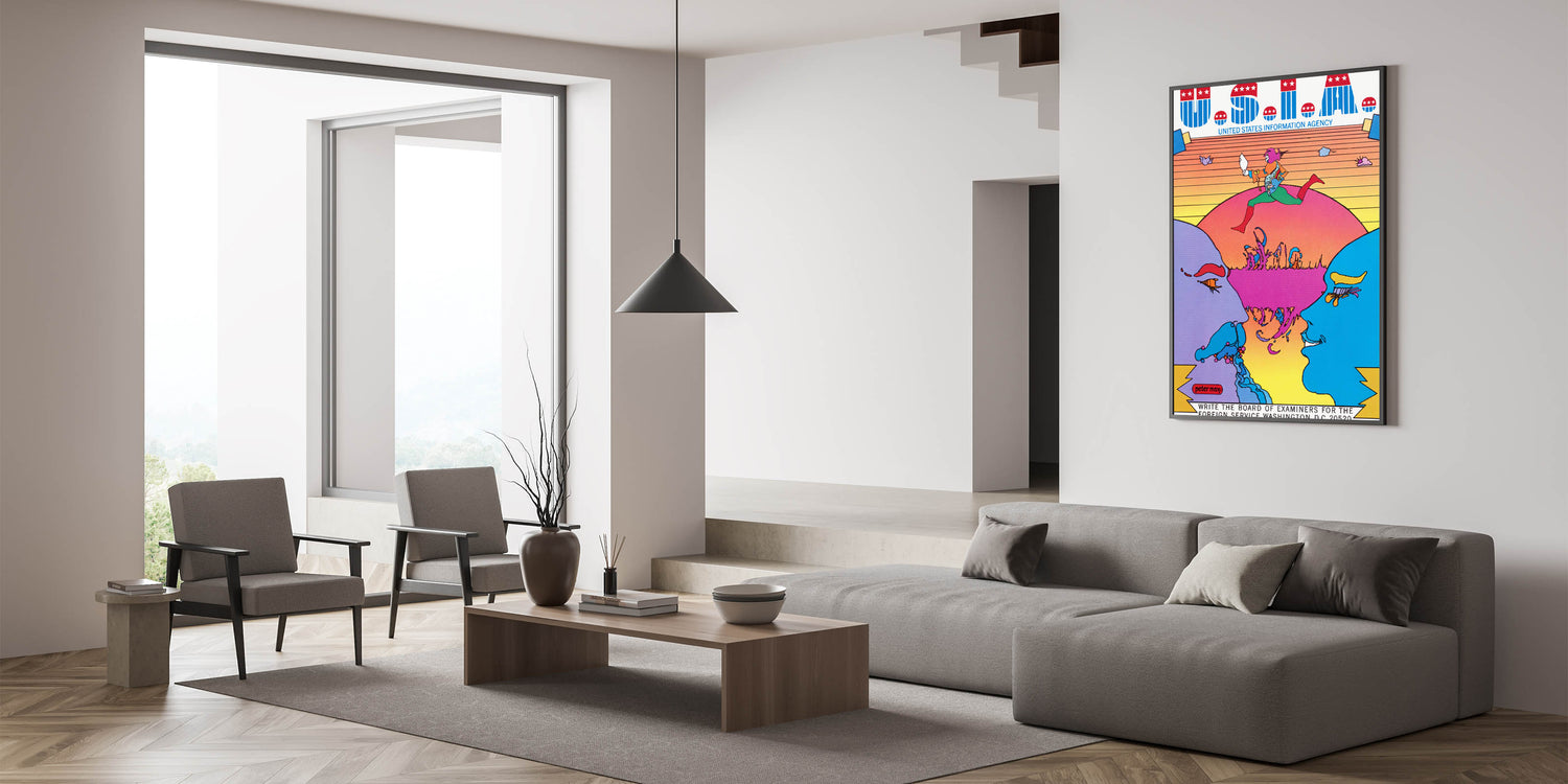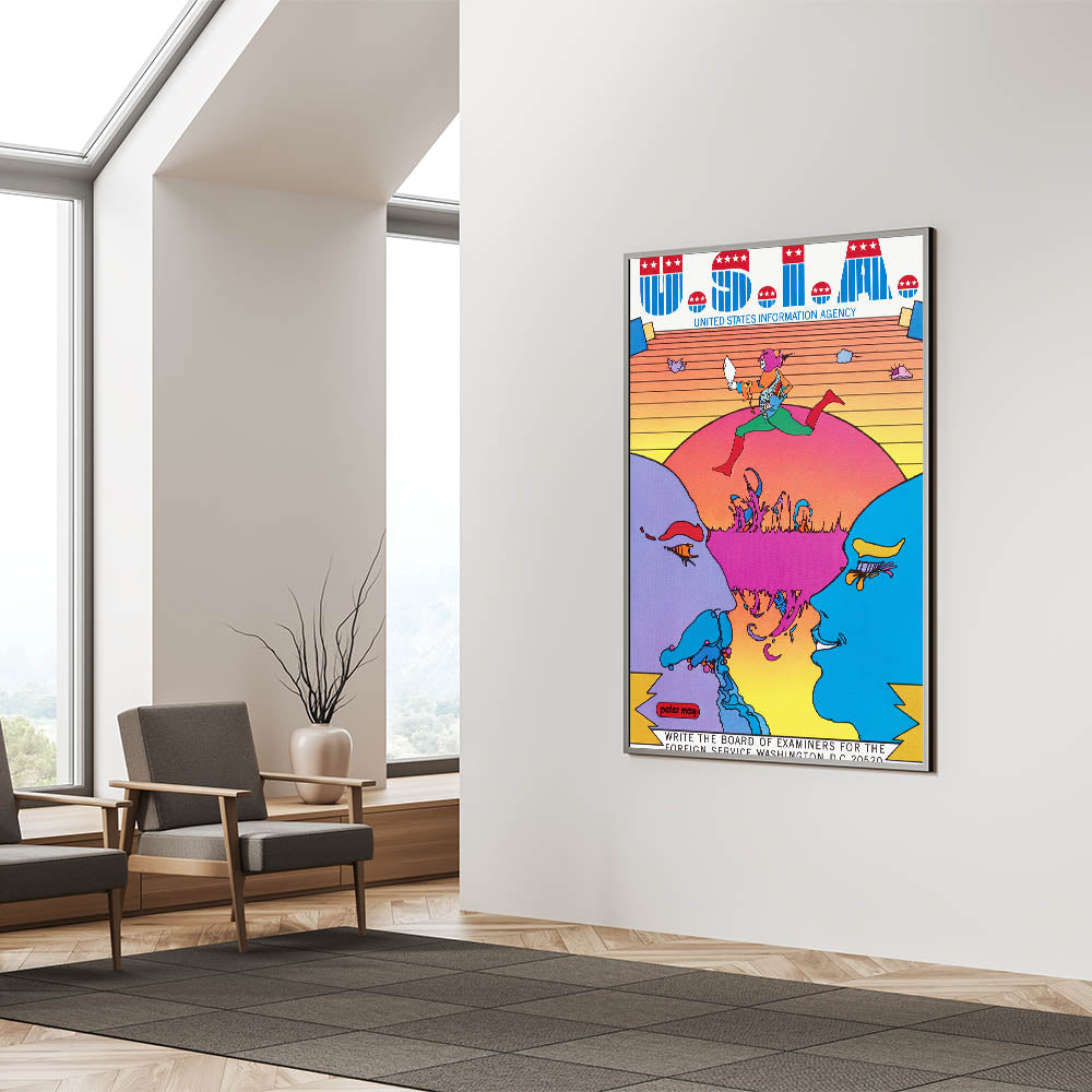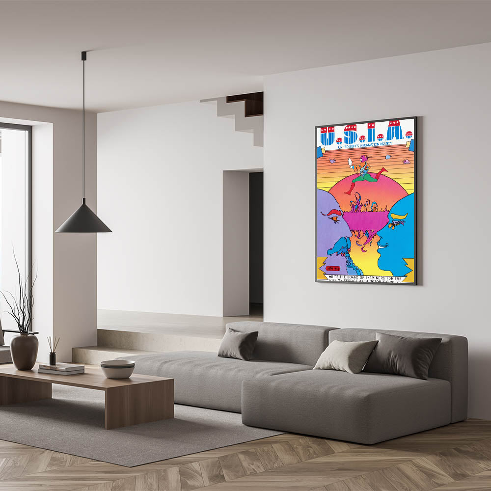 This eye-catching piece of modern wall art brings the iconic style of Peter Max into your home. Featuring a bold, psychedelic design created for the U.S.I.A. in 1970, this artwork captures the spirit of the era with its vivid colors, surreal characters, and vibrant energy. Perfect for adding a pop of color and a touch of retro charm, this contemporary art print is ideal for trendy home decor and makes a striking addition to any modern interior.