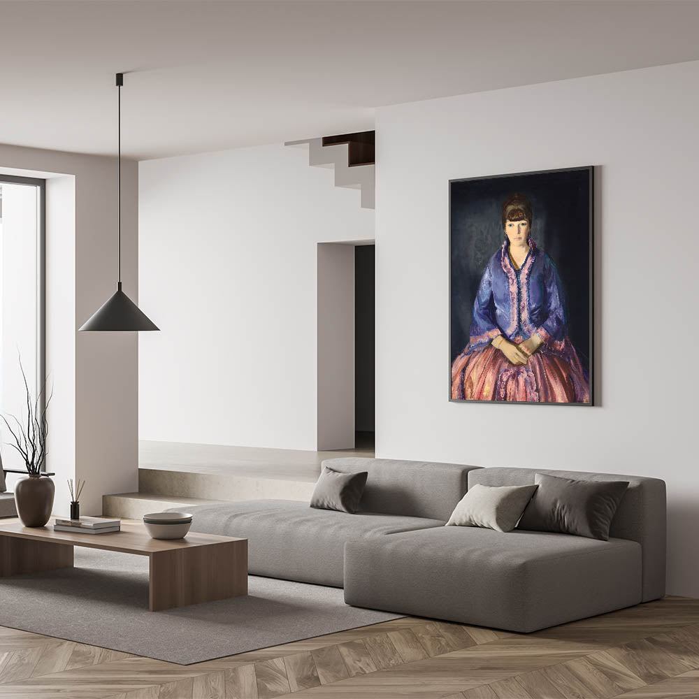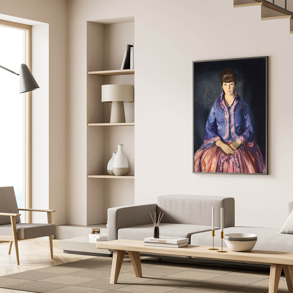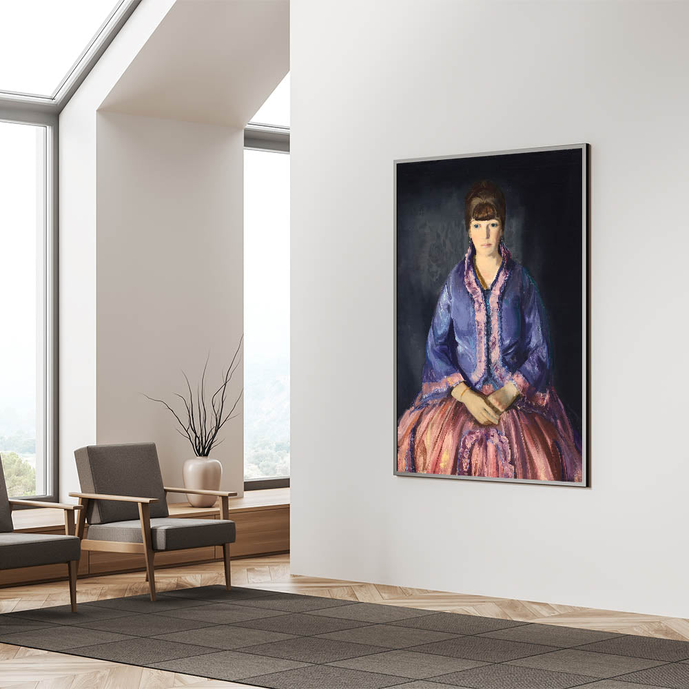 This elegant modern wall art piece features a beautiful portrait of a woman dressed in a richly colored purple and pink gown, exuding sophistication and timeless charm. The expressive detail in the fabric and the poised posture of the subject make this artwork an exquisite addition to any room, blending classical elegance with a modern aesthetic. Perfect for those who appreciate unique modern art, this piece is ideal for adding a refined touch to living rooms, bedrooms, or study spaces. The contrasting tones create depth, making it a captivating focal point in trendy home decor.