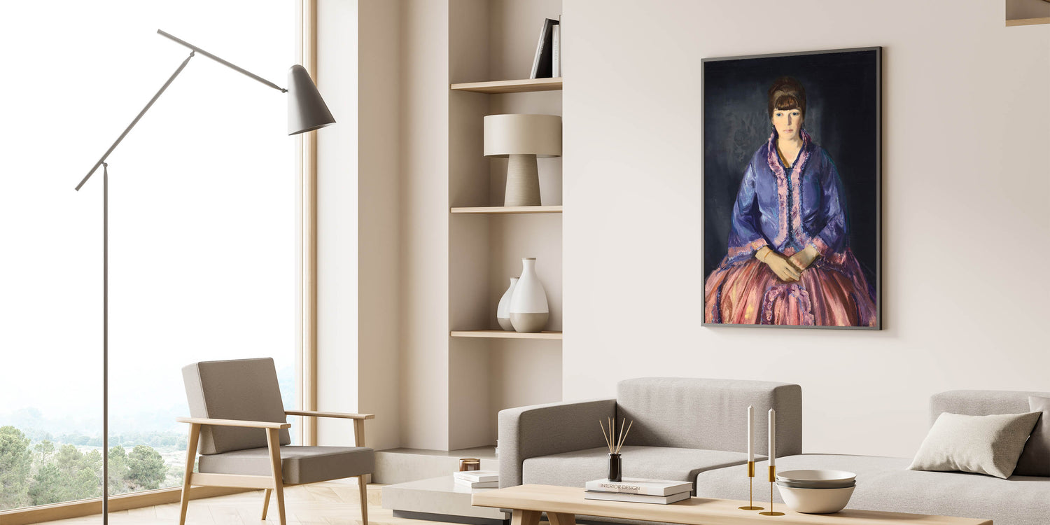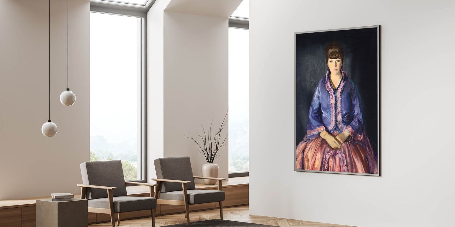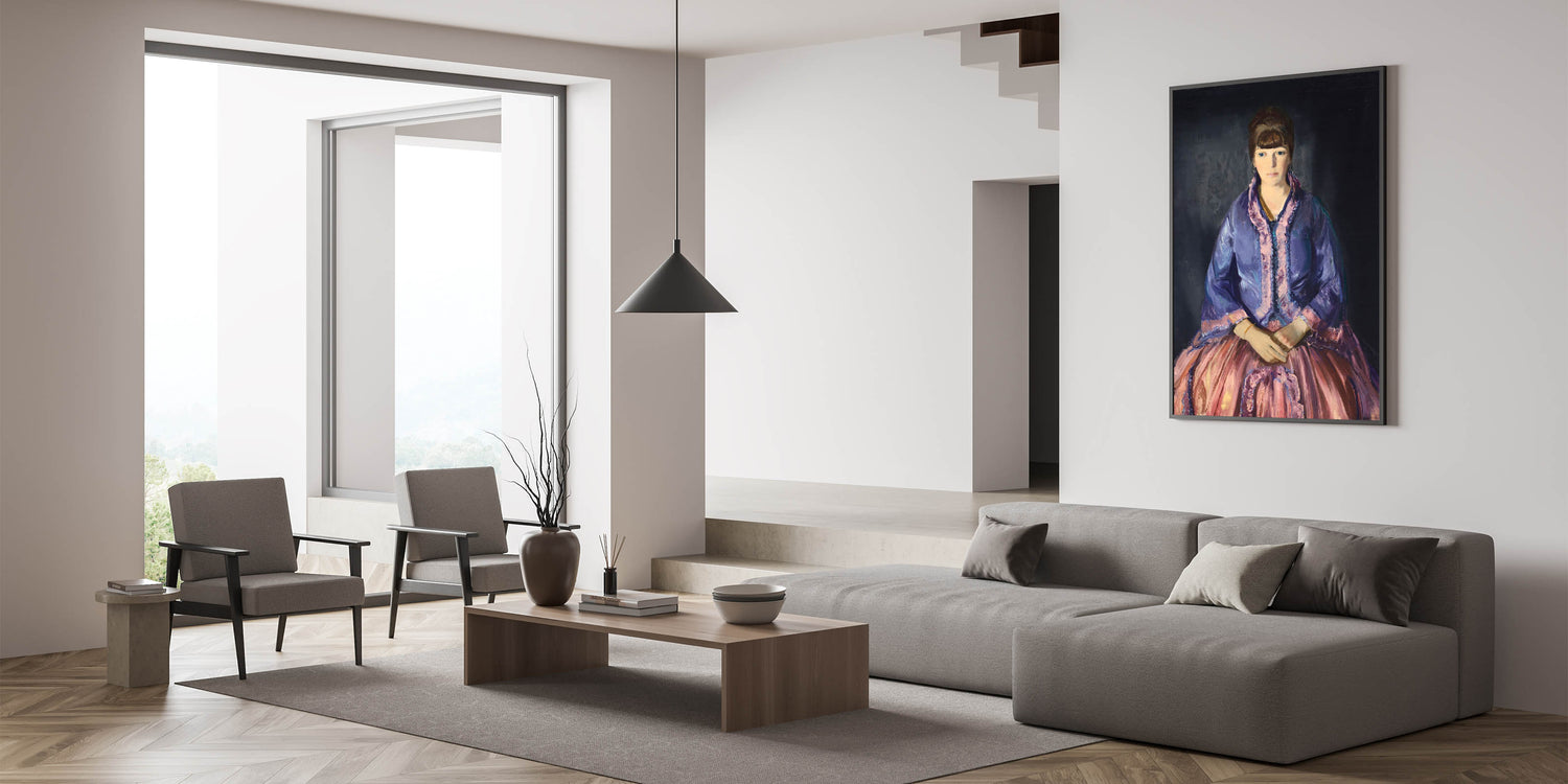 This elegant modern wall art piece features a beautiful portrait of a woman dressed in a richly colored purple and pink gown, exuding sophistication and timeless charm. The expressive detail in the fabric and the poised posture of the subject make this artwork an exquisite addition to any room, blending classical elegance with a modern aesthetic. Perfect for those who appreciate unique modern art, this piece is ideal for adding a refined touch to living rooms, bedrooms, or study spaces. The contrasting tones create depth, making it a captivating focal point in trendy home decor.