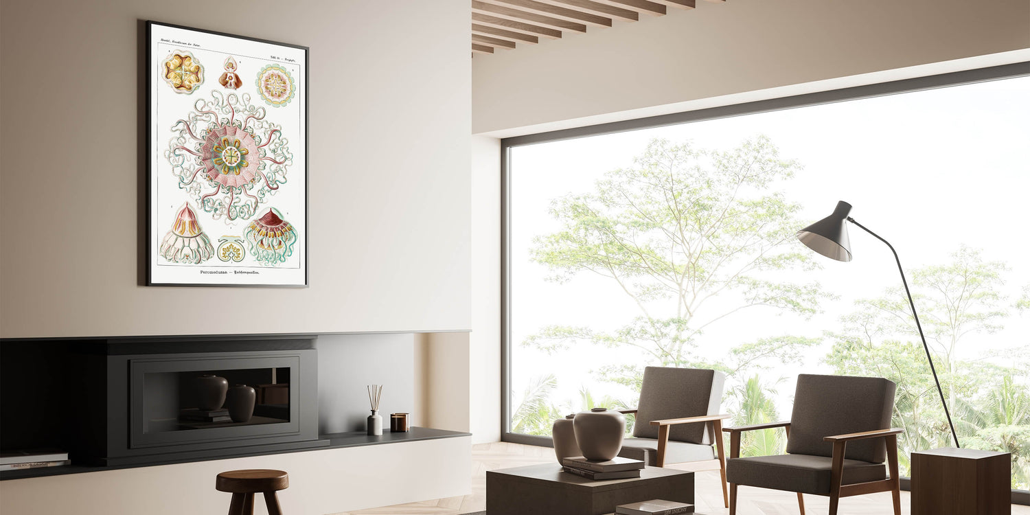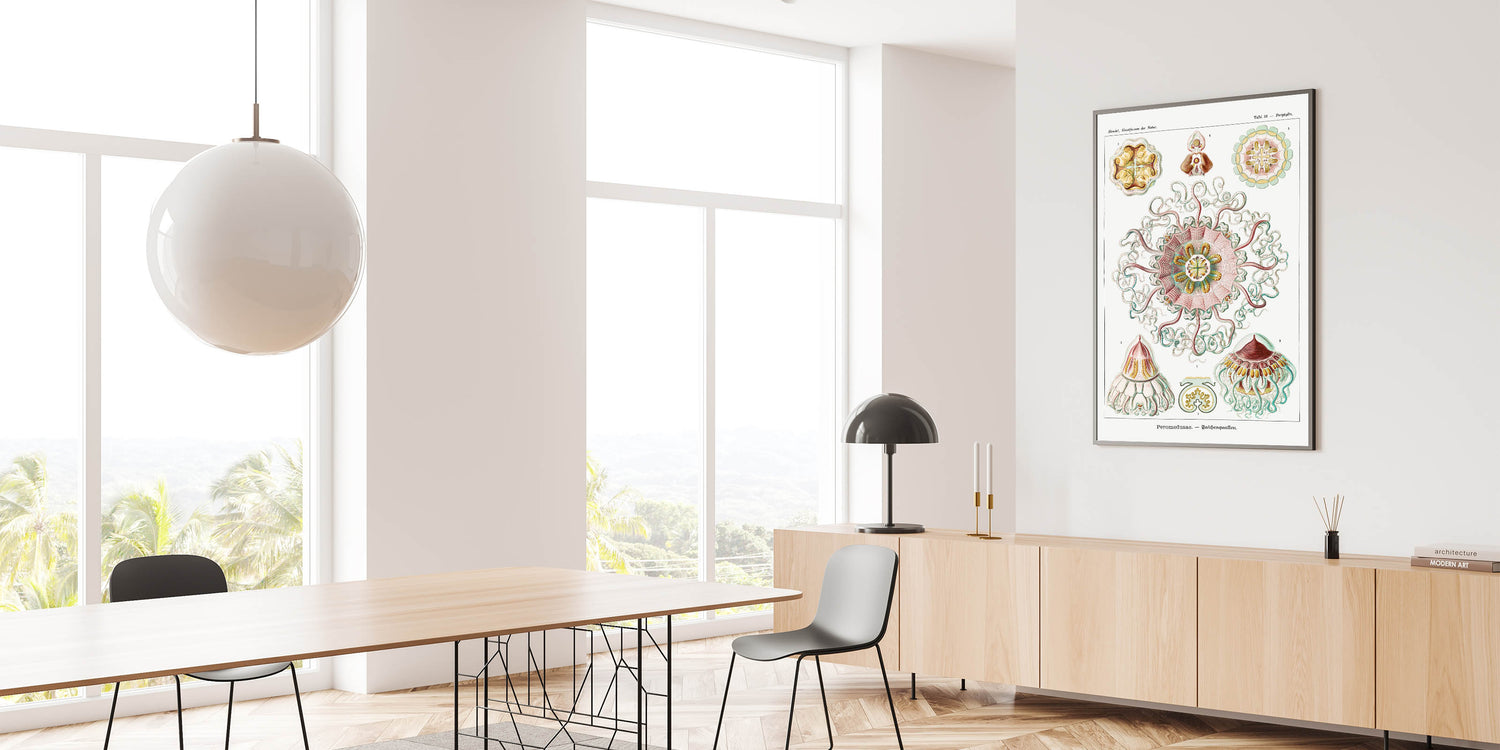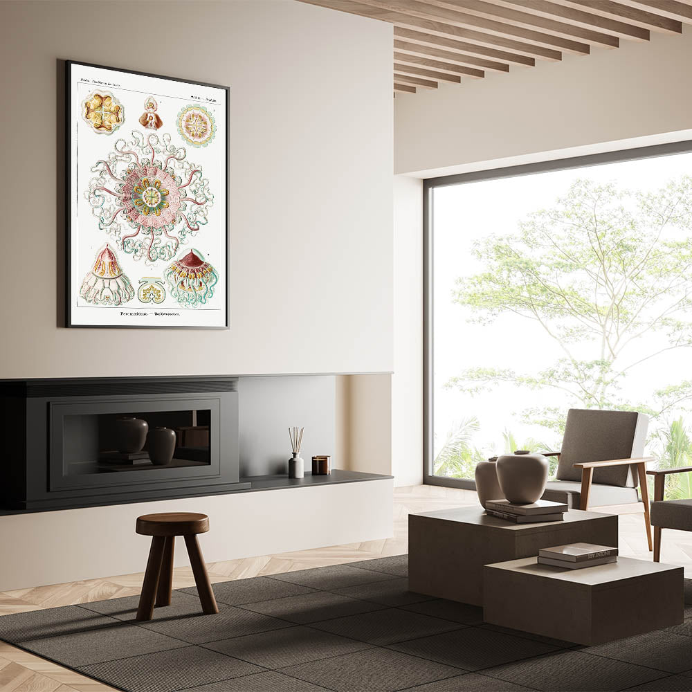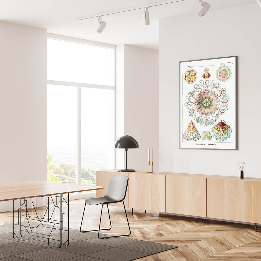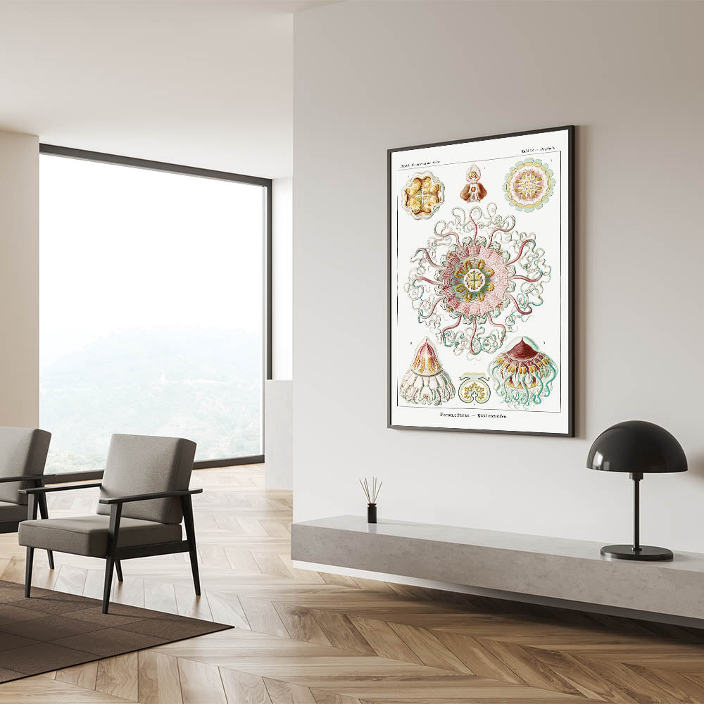 Introduce elegance and scientific beauty to your space with this intricate artwork inspired by Ernst Haeckel's renowned biological illustrations. This piece features stunningly detailed jellyfish designs, highlighted by symmetrical patterns and a soft pastel palette of pink, green, and yellow. The harmonious combination of nature and art creates a sophisticated and calming atmosphere, making it an ideal addition to modern or eclectic interiors.