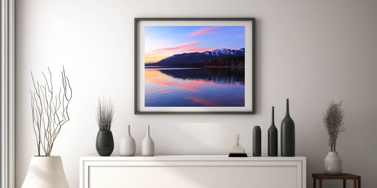 - Montana nature prints of serene lakes, snow-capped mountains, and soft skies