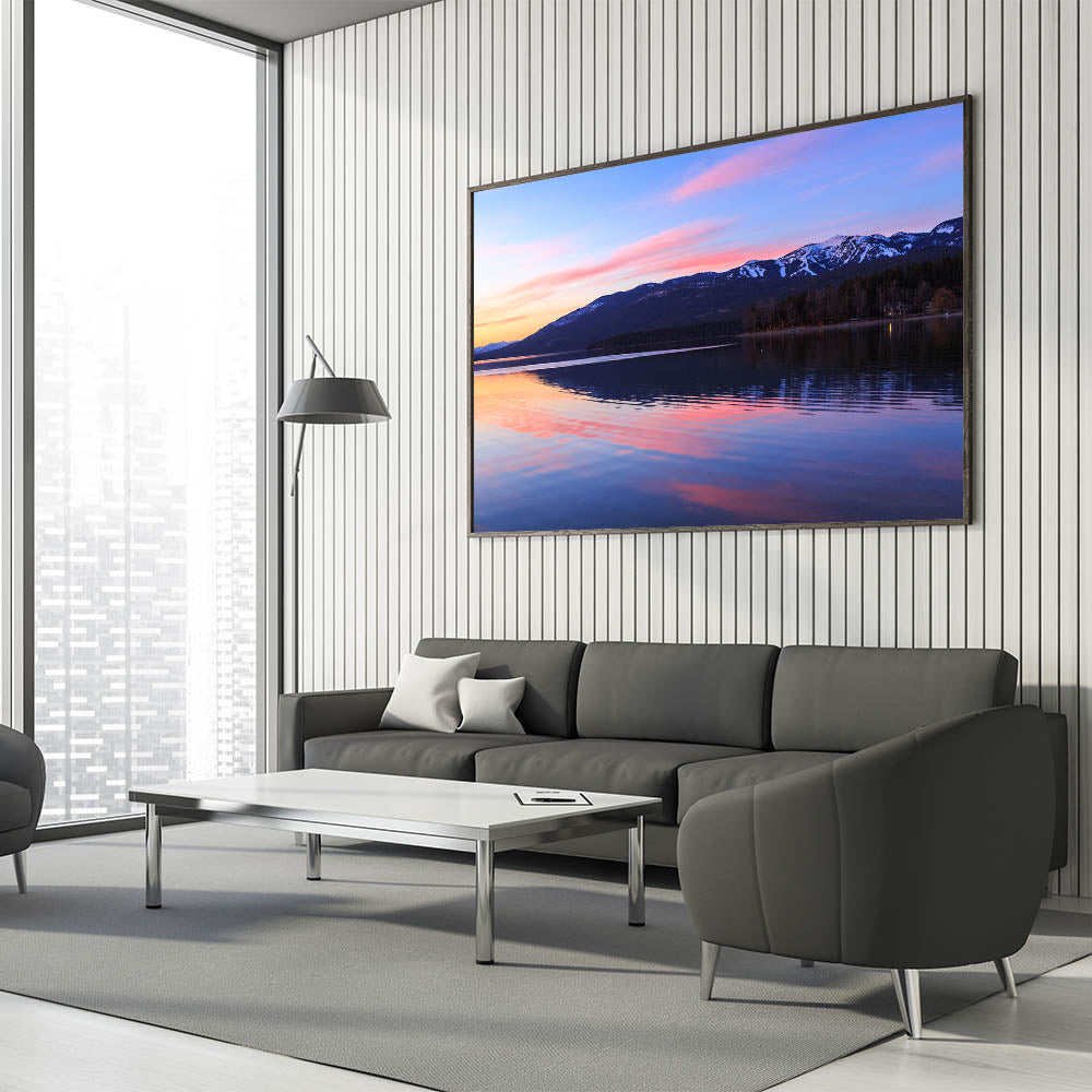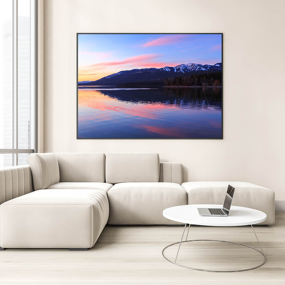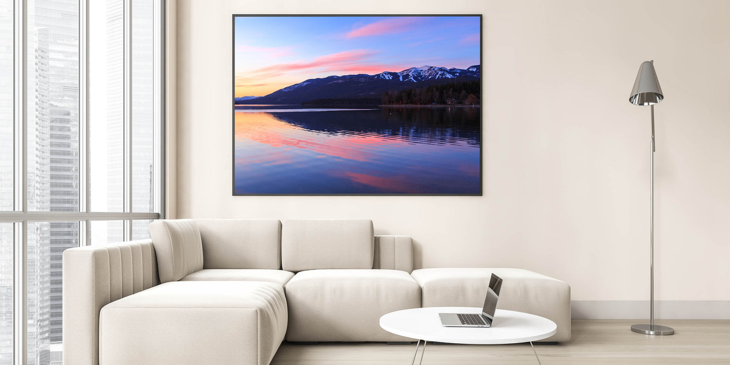 This stunning Montana nature print captures the tranquil beauty of a peaceful lake reflecting the soft colors of a sunset or sunrise. In the background, snow-capped mountains rise majestically against a pastel sky, creating a perfect harmony between land, water, and sky. Available in various formats, including acrylic glass, framed prints, and canvas, this high-quality Montana wall art brings serenity and elegance to any room. The soft tones of the sky and water make it an ideal piece for creating a calming atmosphere in your living room, office, or bedroom.