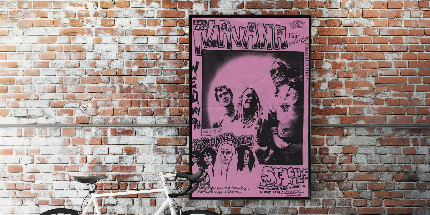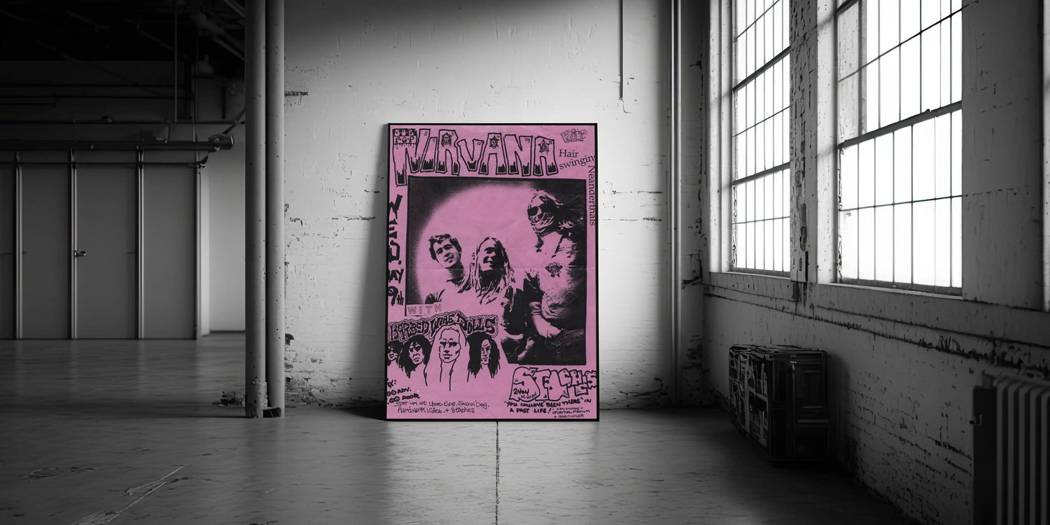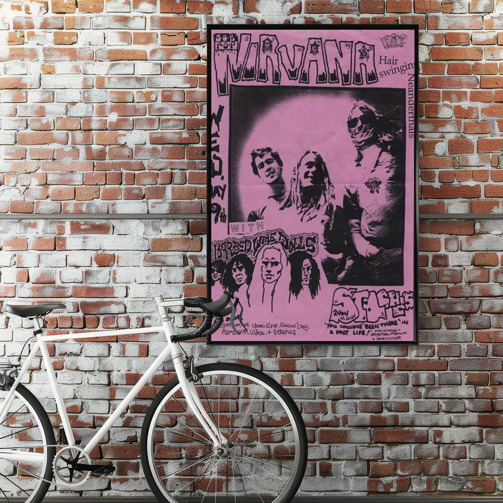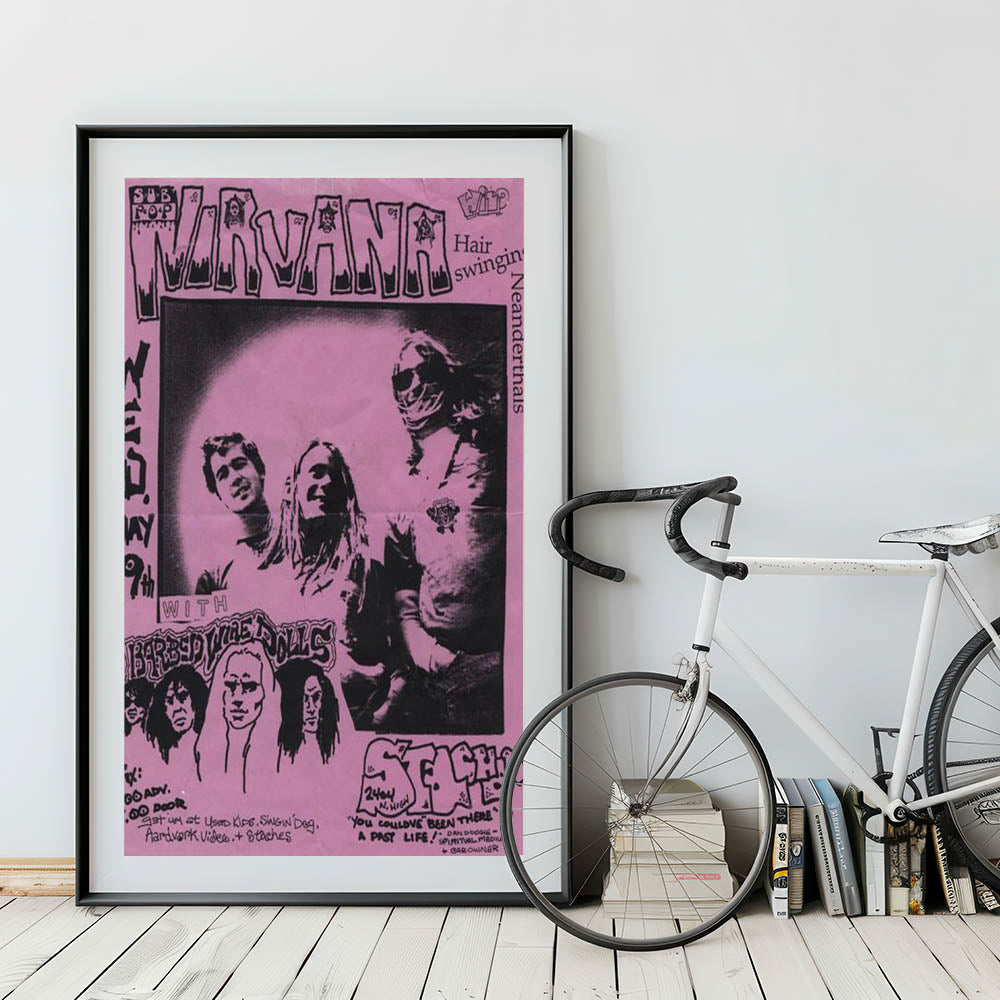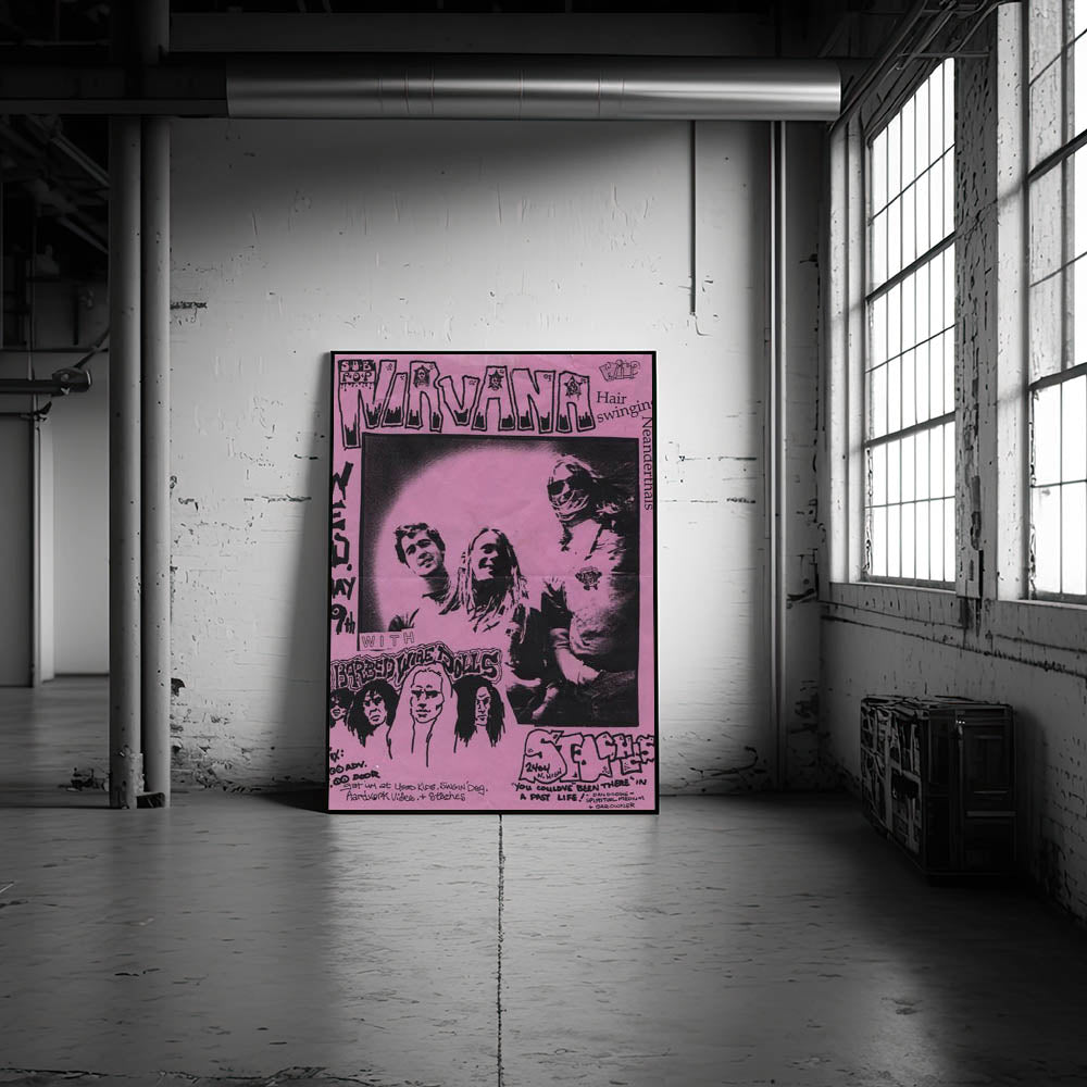 Step back into the 90s with this vibrant Nirvana concert poster, featuring a bold pink background and the iconic black-and-white image of the band. With a retro punk aesthetic, this design captures the raw energy and rebellious spirit of the grunge era. Perfect for fans of Nirvana, this vintage concert poster makes a striking addition to any space. Its eye-catching color contrast and classic design make it a must-have for collectors and music lovers alike.