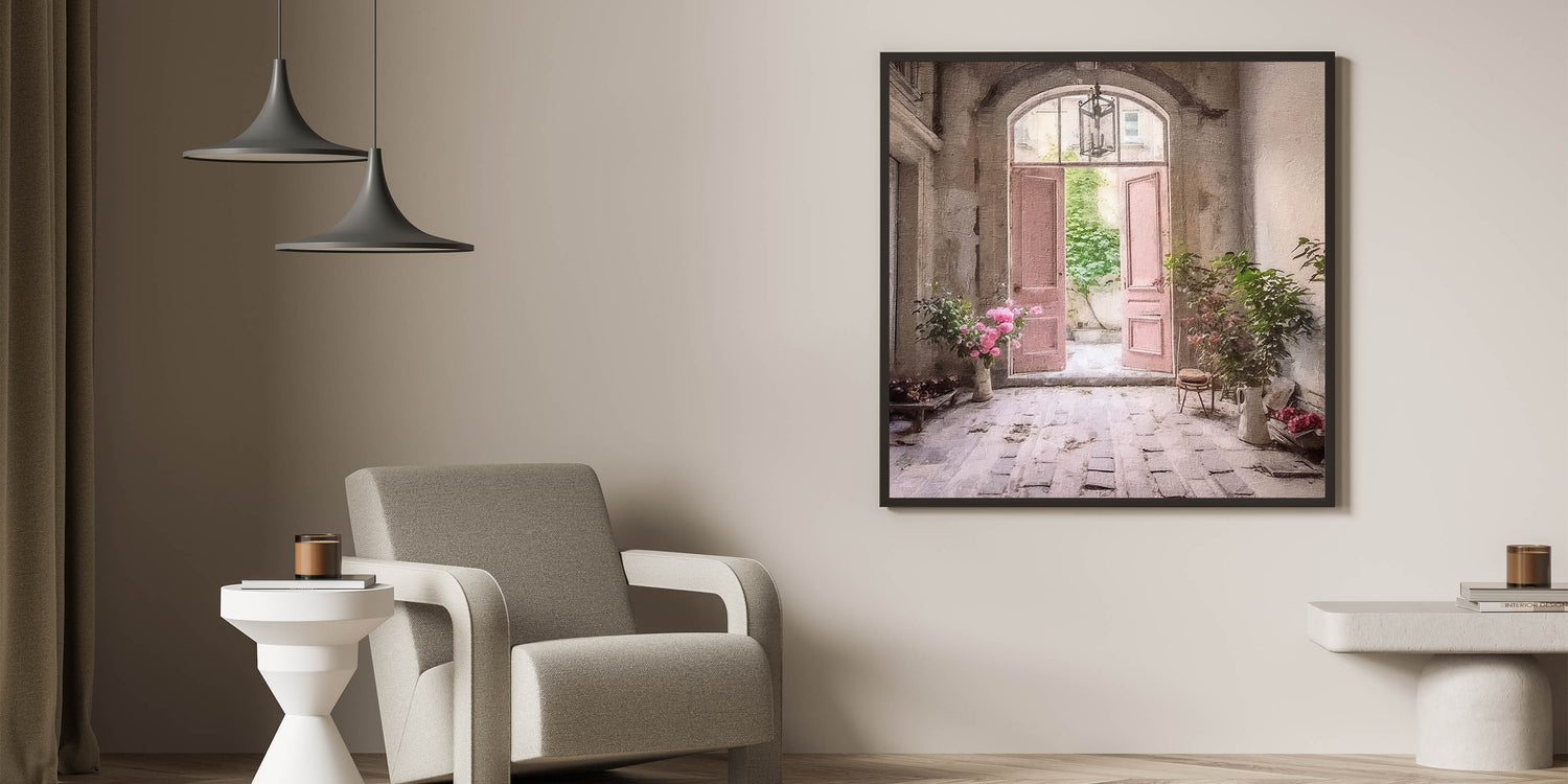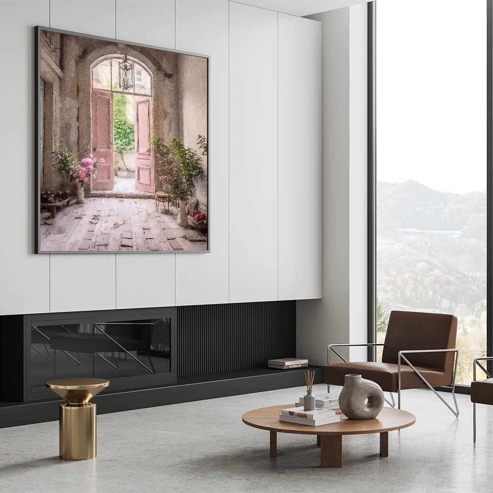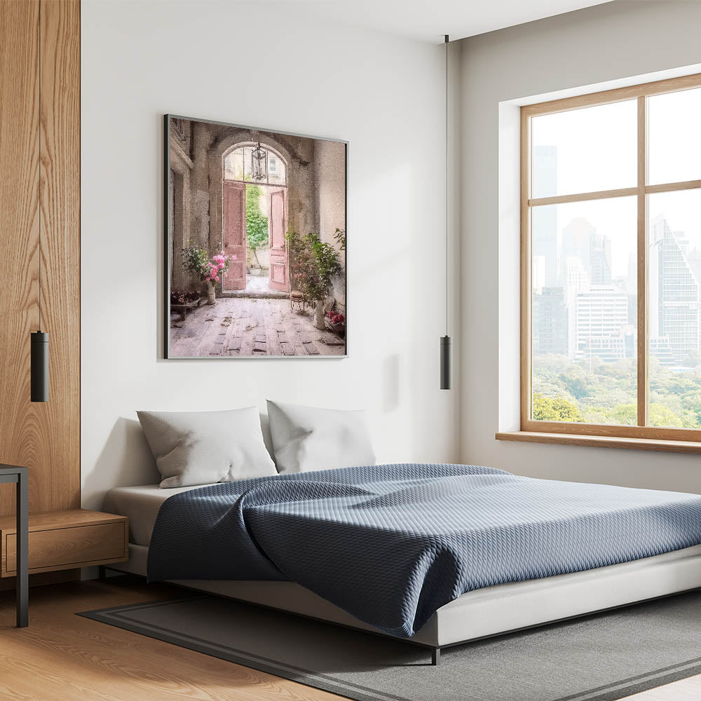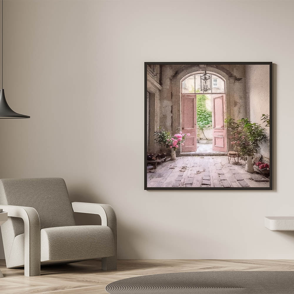Bring a sense of tranquility and charm to your home with this Open Blush Door Canvas Art. The artwork features an elegant, blush-pink door left ajar, revealing a sunlit courtyard filled with lush greenery. The soft pastel tones of the door contrast beautifully with the vibrant plants and flowers, creating a peaceful and inviting scene. The rustic cobblestone floor and vintage lantern complete the Parisian vibe, making this piece a perfect addition to any room seeking a touch of European elegance.