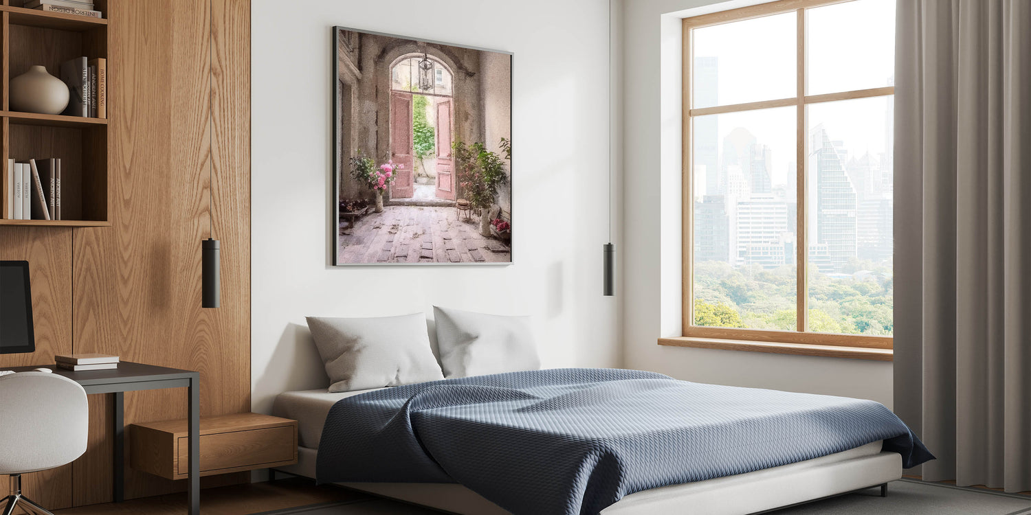 This French Door Canvas Art is ideal for those who love the understated beauty of vintage architecture and garden-inspired decor. Whether displayed in a living room, hallway, or bedroom, it adds a warm and inviting atmosphere. Experience the elegance of a Parisian courtyard with this beautiful piece.