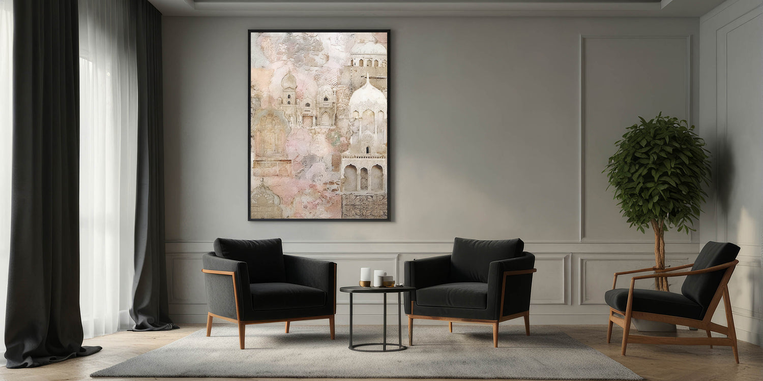 This artwork offers a glimpse into architectural elegance, merging traditional elements with abstract artistry. It’s a versatile piece that enhances a variety of decor styles, bringing warmth and refinement to any setting.