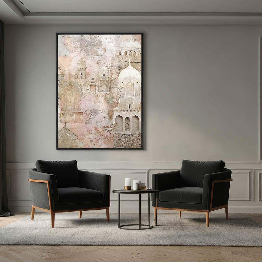 Immerse yourself in the intricate beauty of this Ornate Abstract Architecture Wall Art. This piece draws inspiration from traditional architectural forms, adorned with lace-like patterns and soft detailing. The palette of beige, cream, and blush pink evokes a sense of elegance and timelessness, making it an ideal choice for spaces that crave a touch of sophistication.