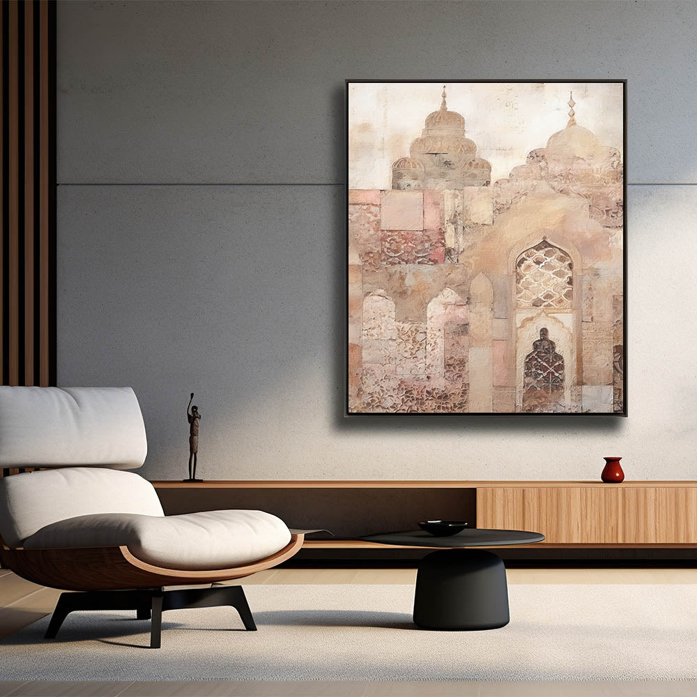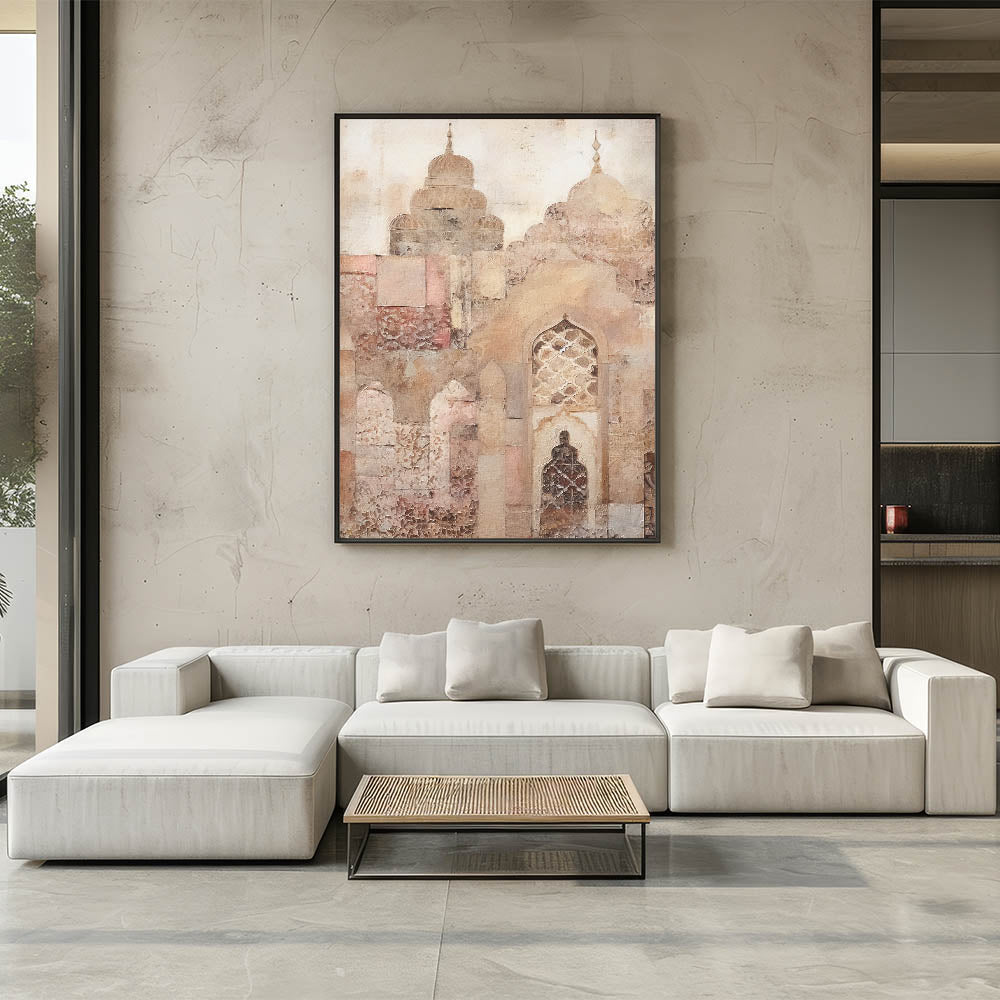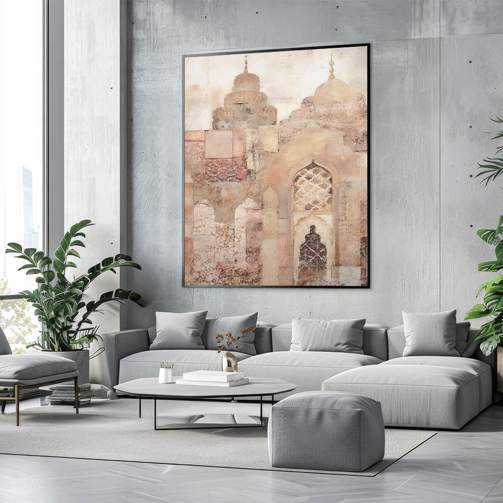 Immerse yourself in the beauty of intricate temple architecture with this Ornate Temple Abstract Architecture Art. Featuring elaborate domes and arches, this artwork is rich with textures and patterns, blending traditional architectural motifs with a contemporary abstract style. The soft beige and pink tones add a touch of warmth and elegance, making it an ideal piece for those who appreciate detailed, timeless designs.