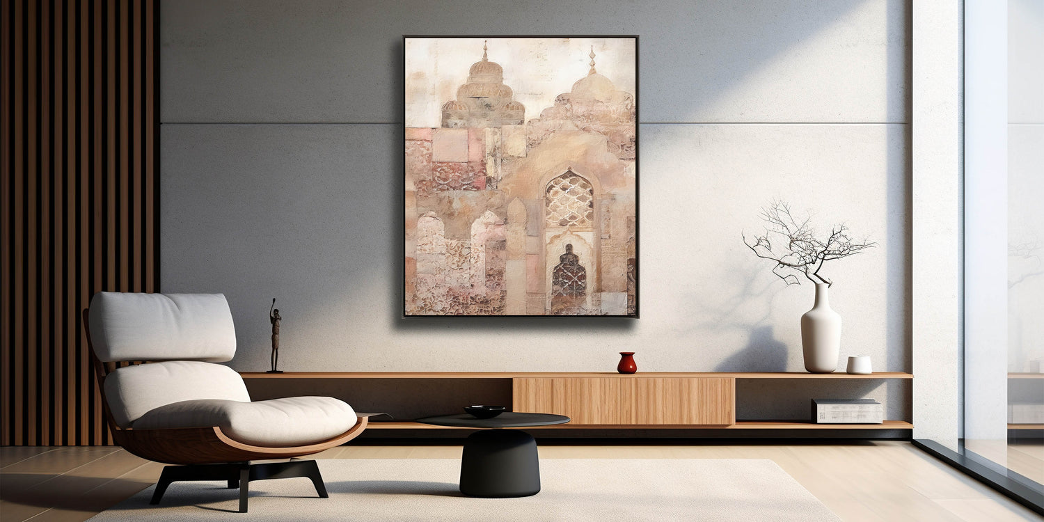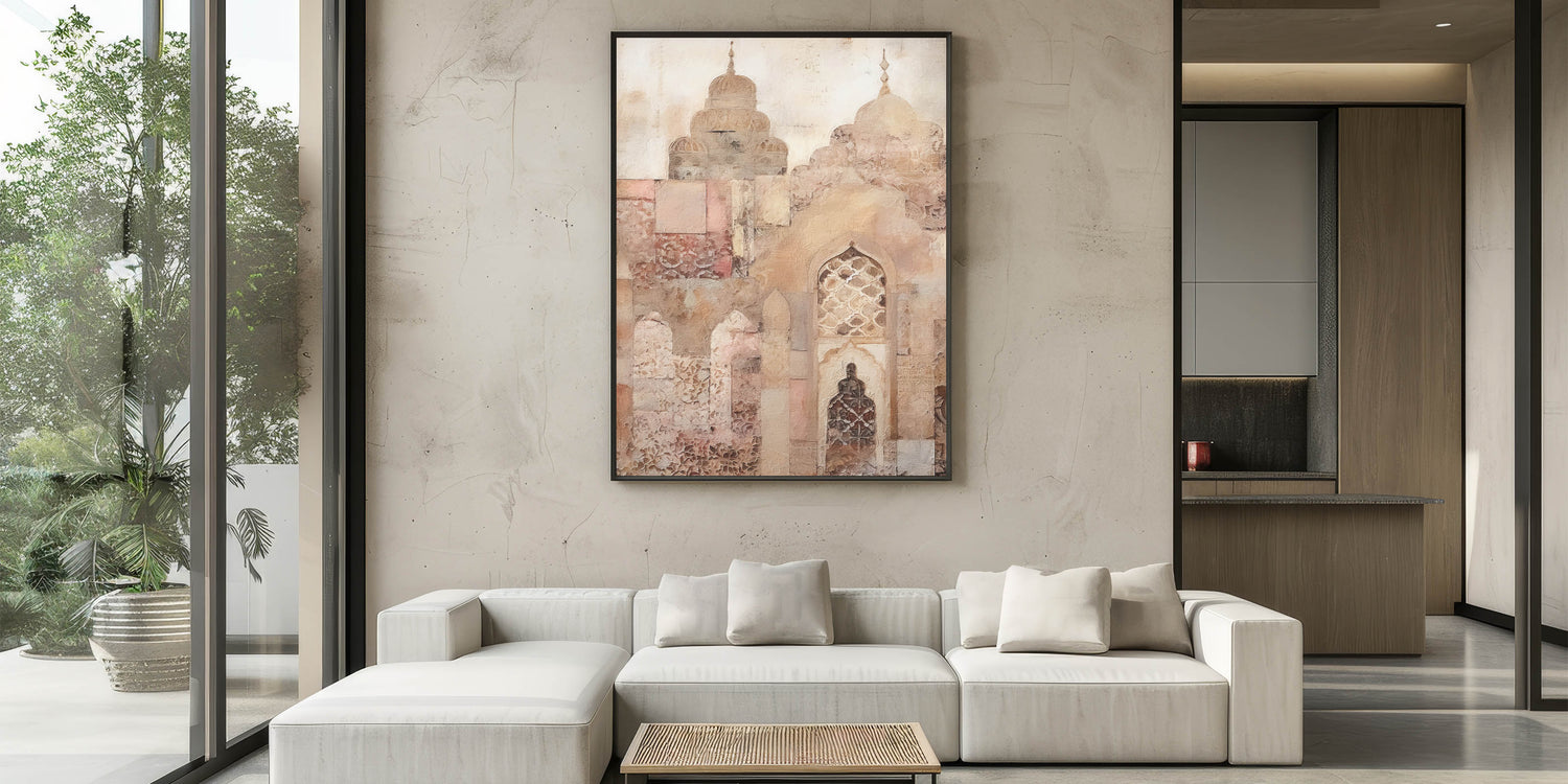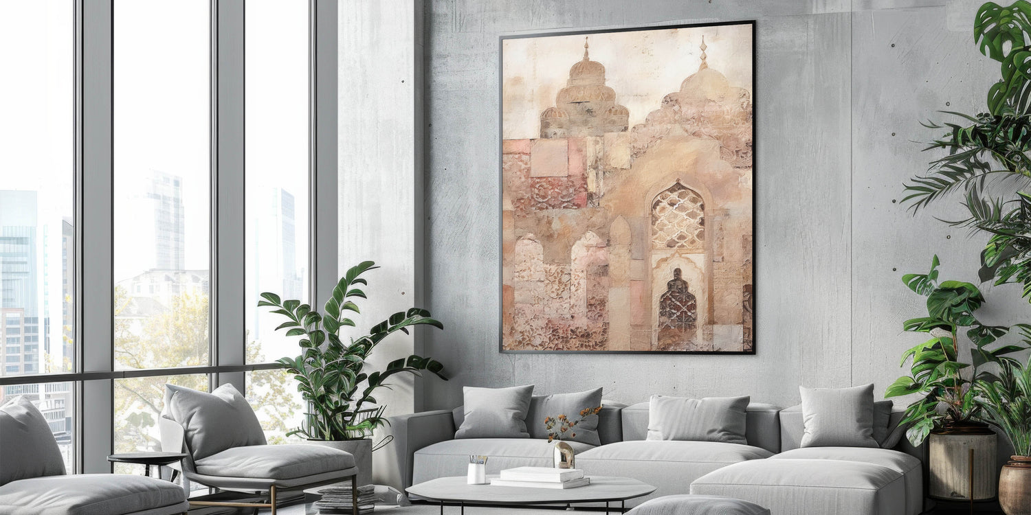 Immerse yourself in the beauty of intricate temple architecture with this Ornate Temple Abstract Architecture Art. Featuring elaborate domes and arches, this artwork is rich with textures and patterns, blending traditional architectural motifs with a contemporary abstract style. The soft beige and pink tones add a touch of warmth and elegance, making it an ideal piece for those who appreciate detailed, timeless designs.