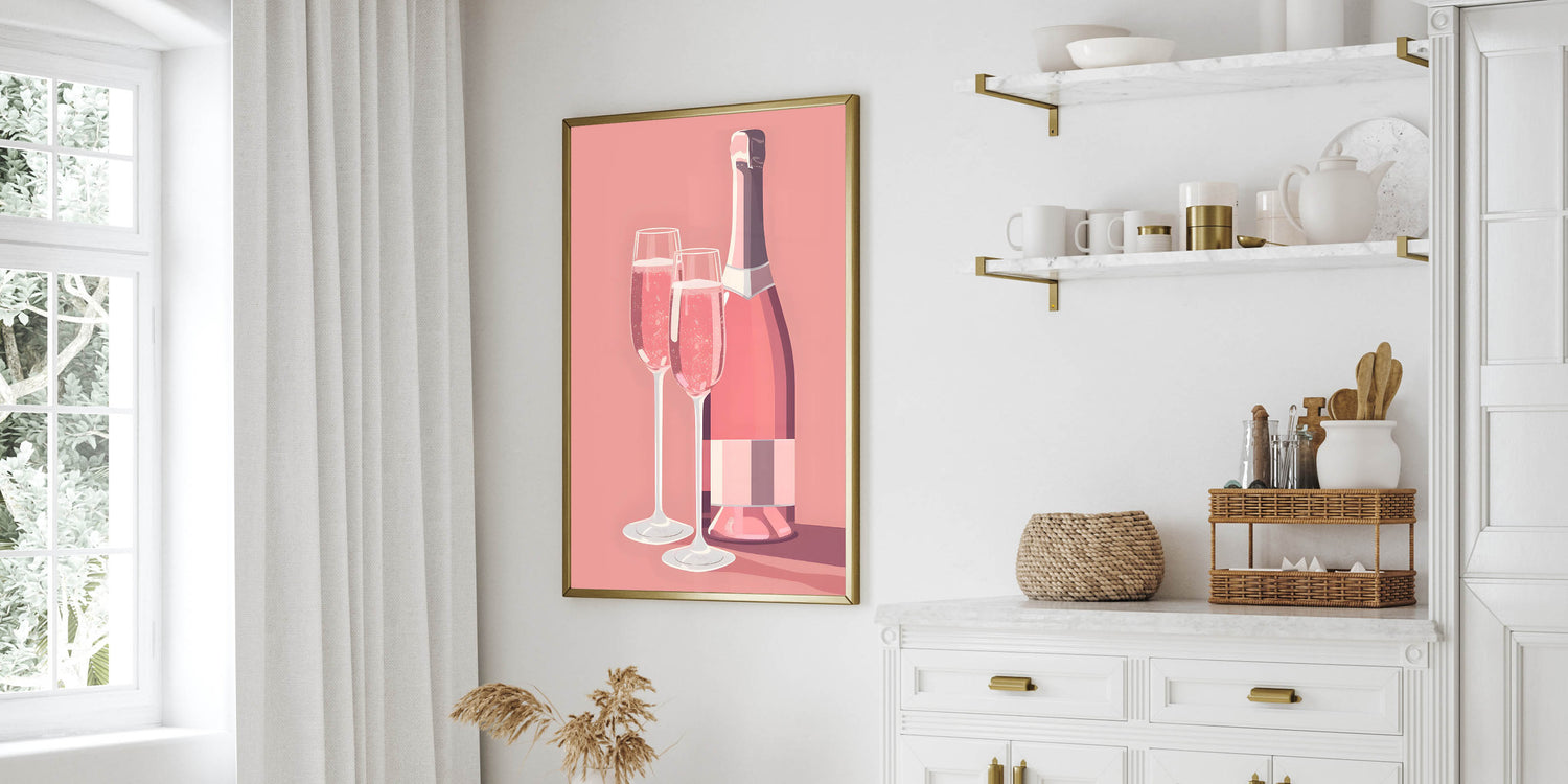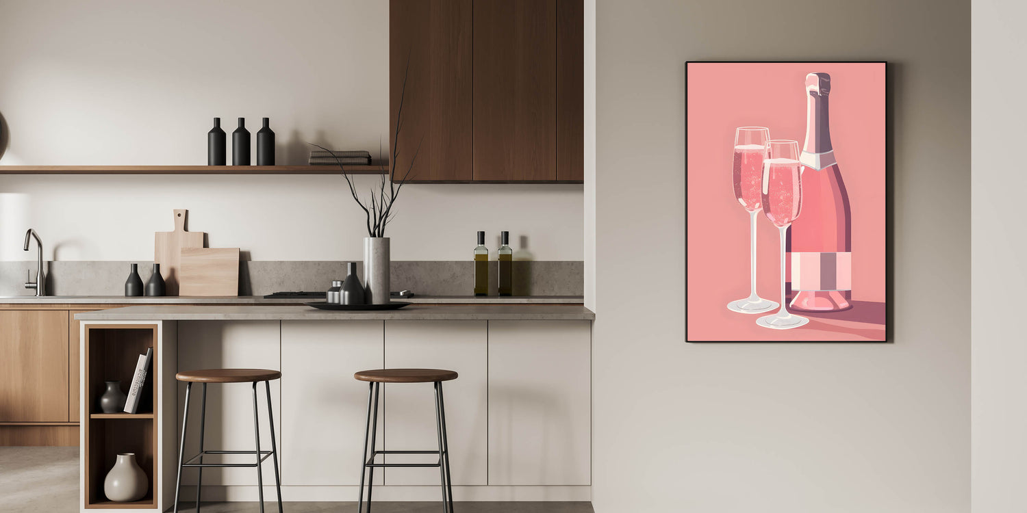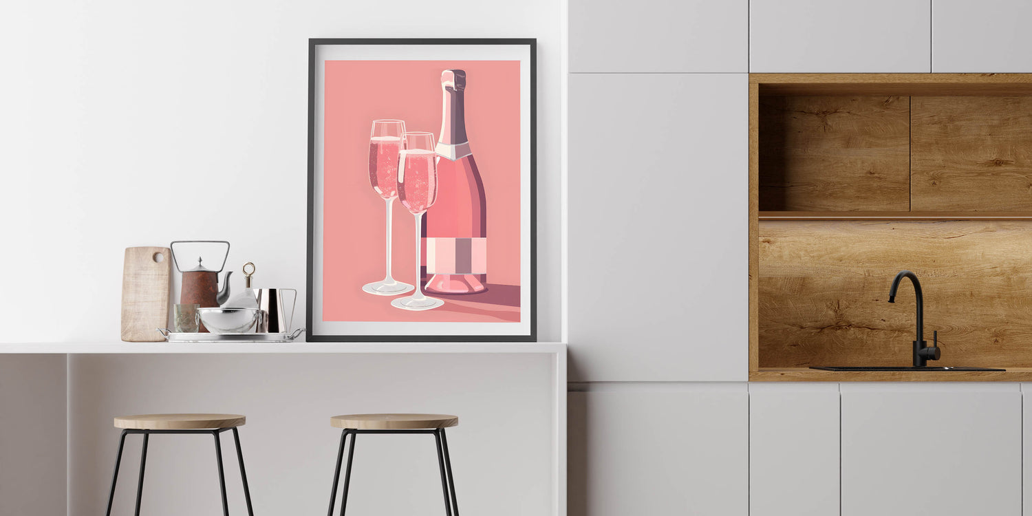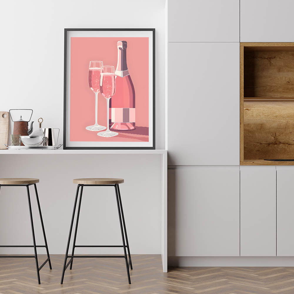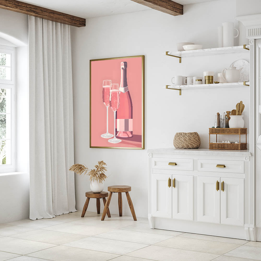Add a touch of sophistication to your space with this Pink Champagne Celebration artwork, a stunning piece that perfectly blends elegance and charm. This drinks wall art features a beautifully illustrated champagne bottle alongside two sparkling glasses, making it a perfect addition to bars, kitchens, or dining areas.