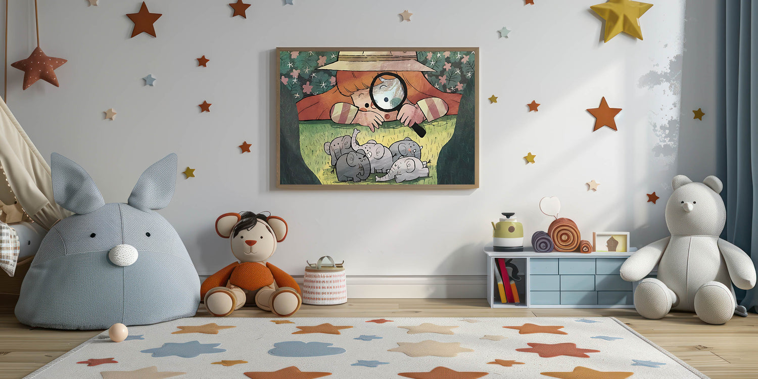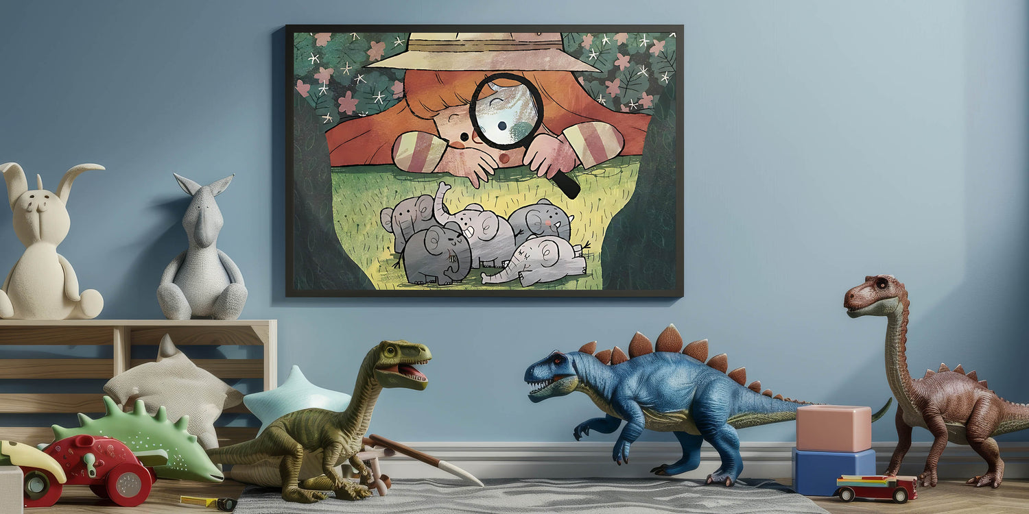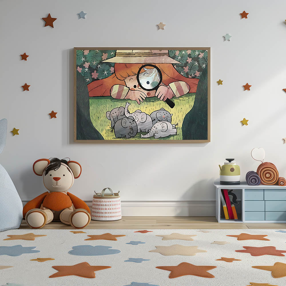 Playful Boys Room Wall Art – Girl Exploring with Elephants